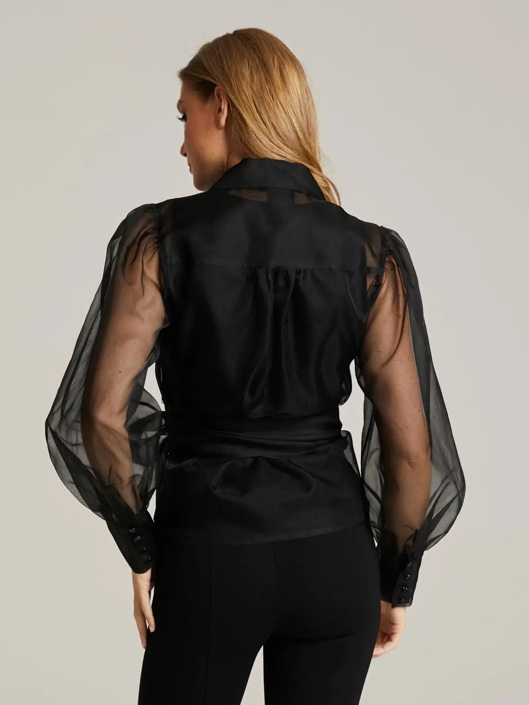 Kietasupusero puhvihihoilla, leveillä manseteilla, kauluksilla sekä rusetille sidottavilla kietasunauhoilla.