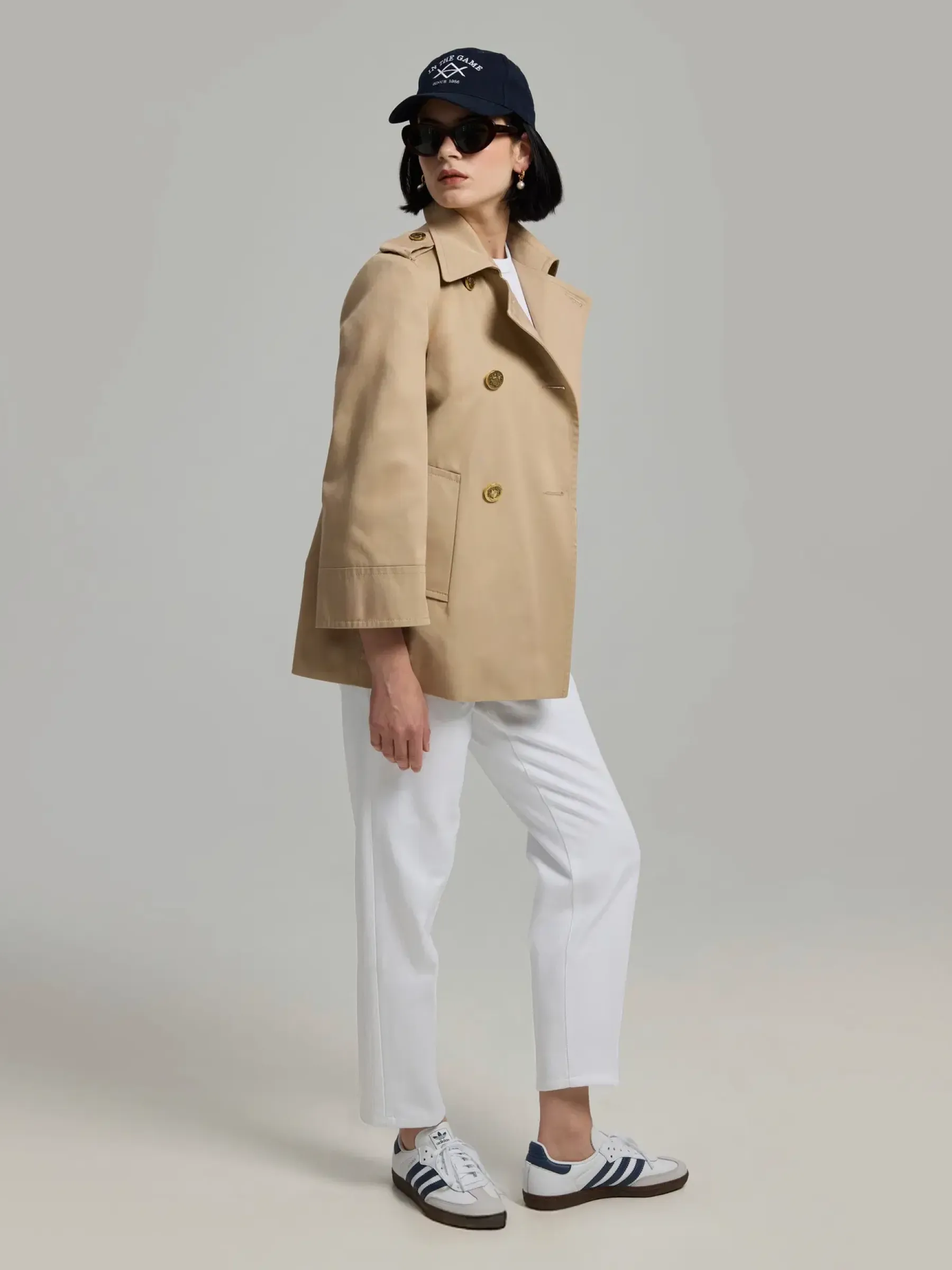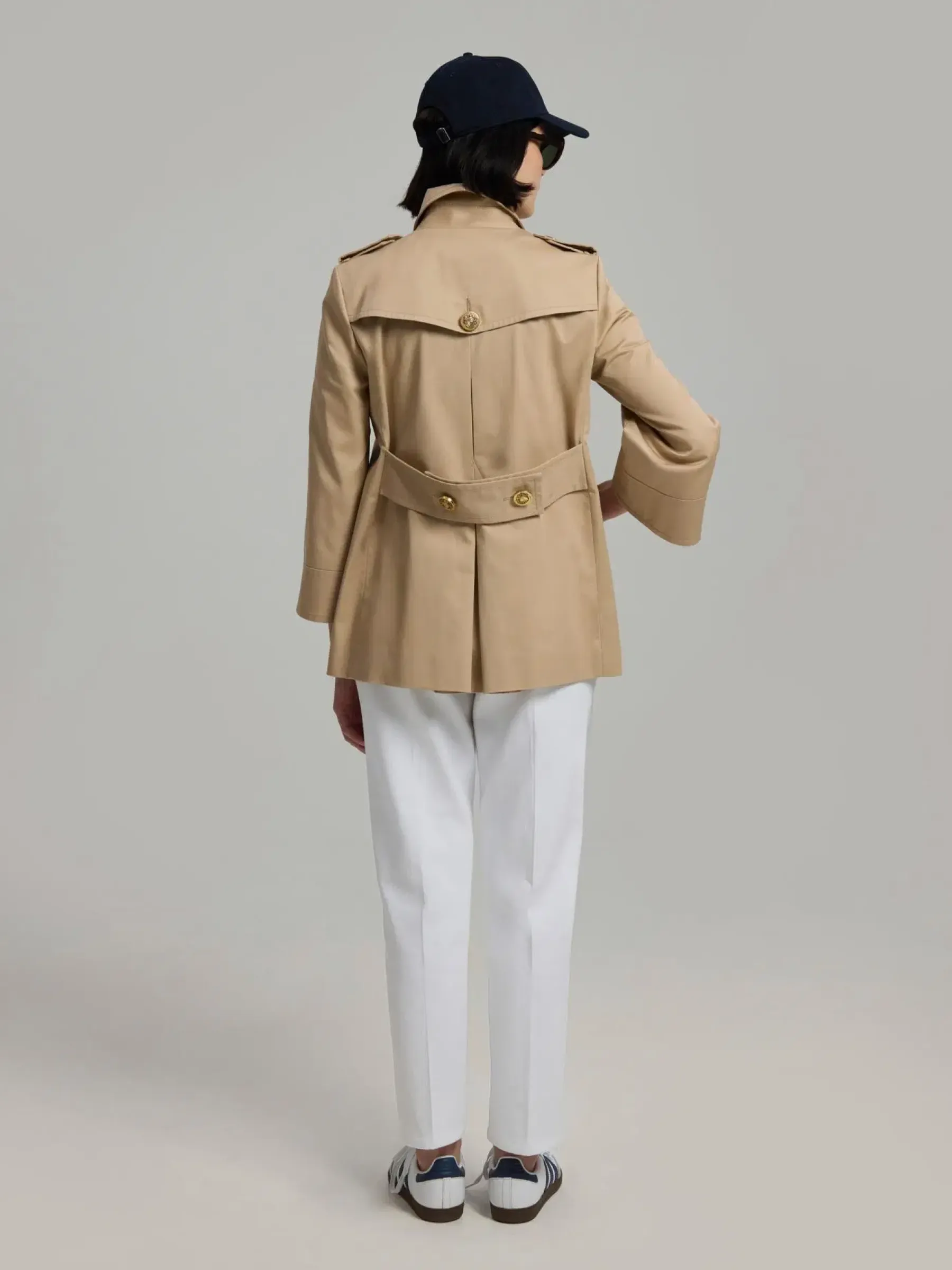 Leveä puuvillatakki näyttävillä kultaisilla napeilla.