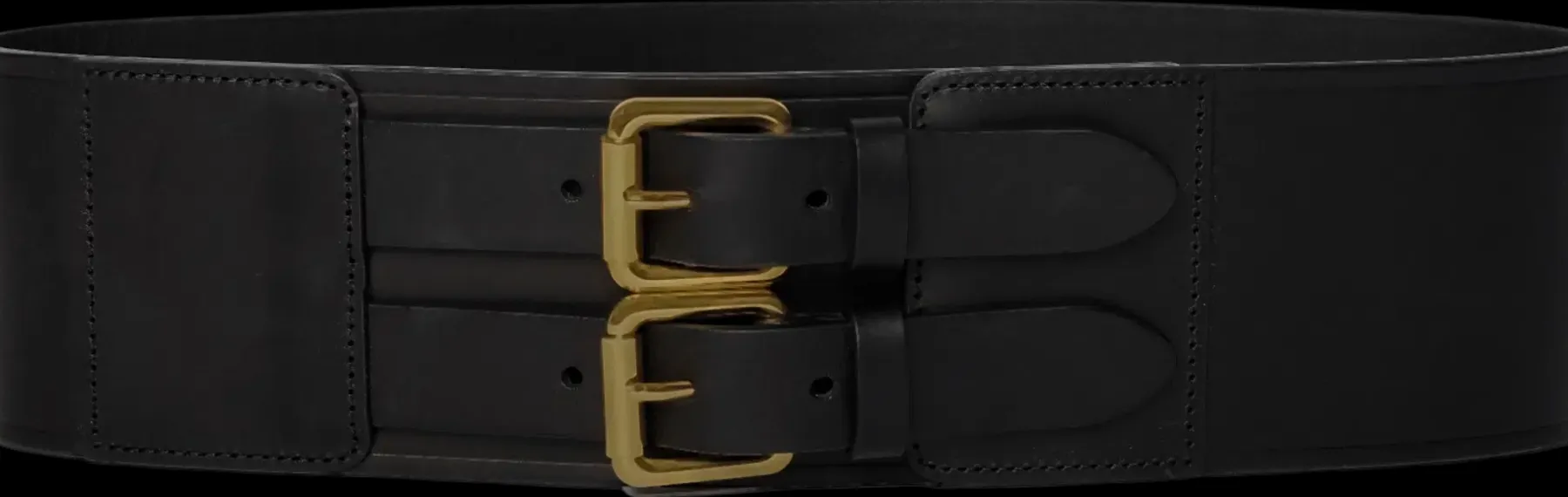 Musta leveä nahkavyö, jossa kullanvärinen kaksoissolki.