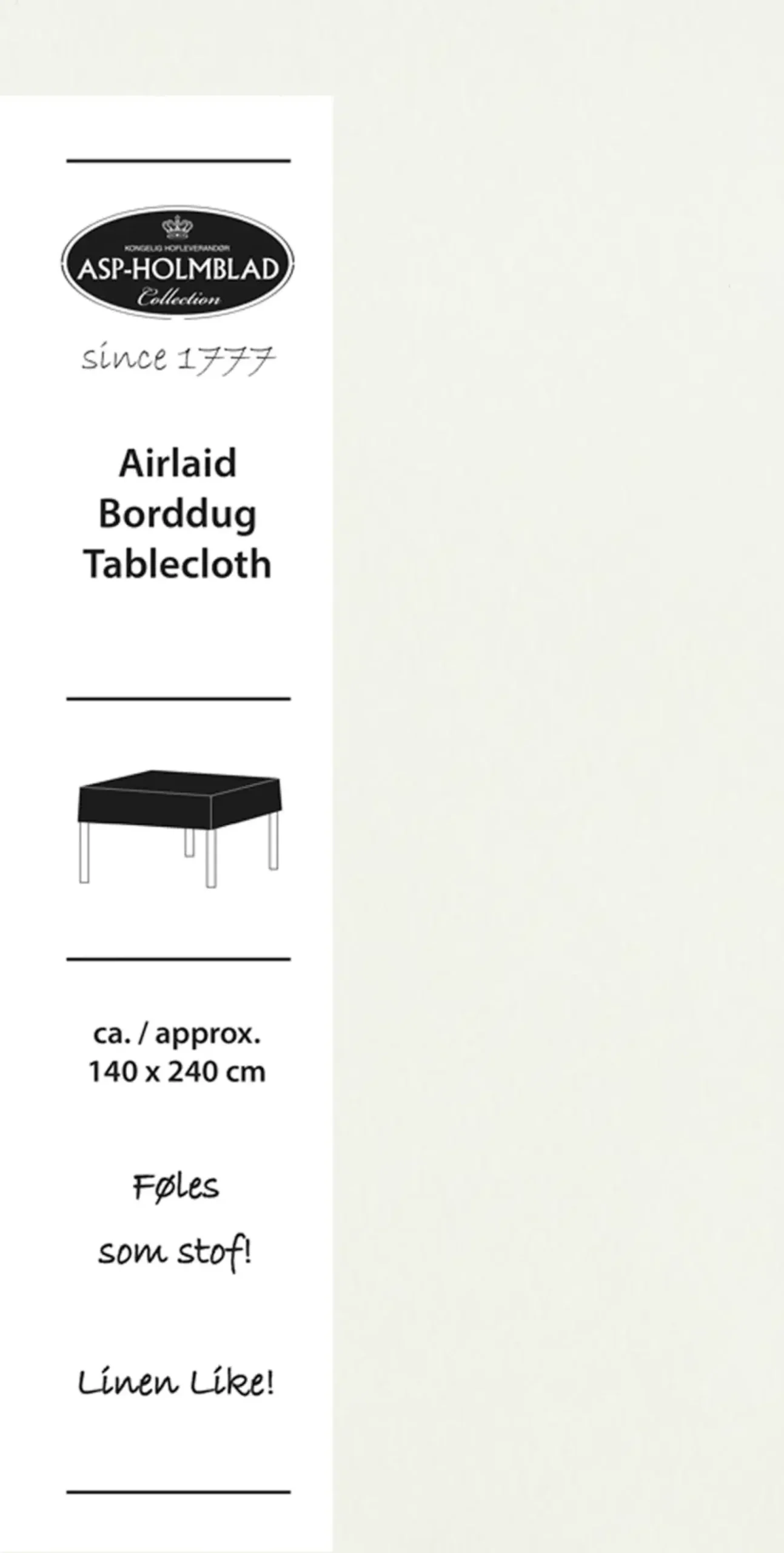 Valkoinen pellavamainen pöytäliina, joka on valmistettu paperista mutta tuntuu kankaalta. Koko noin 140 x 240 cm.