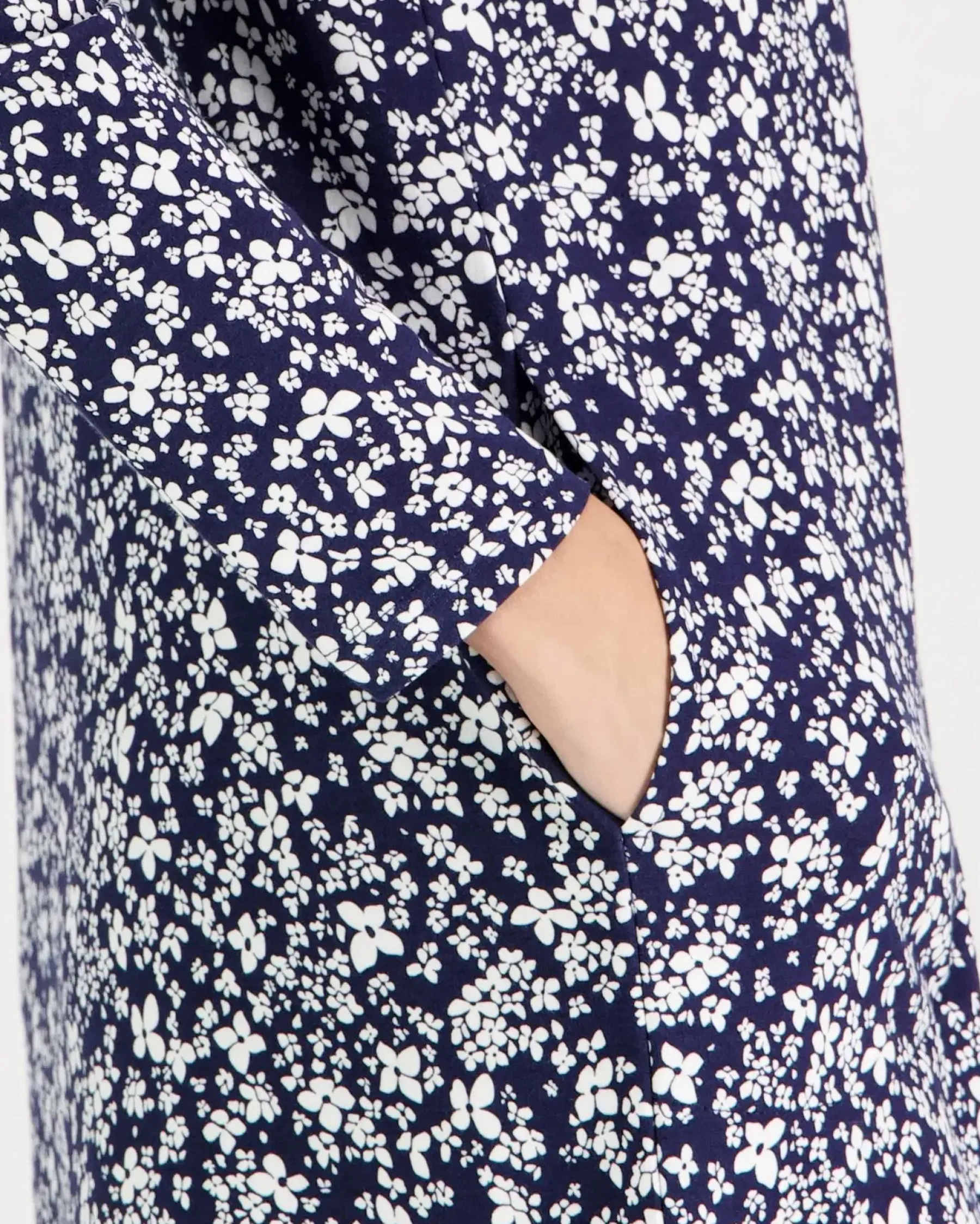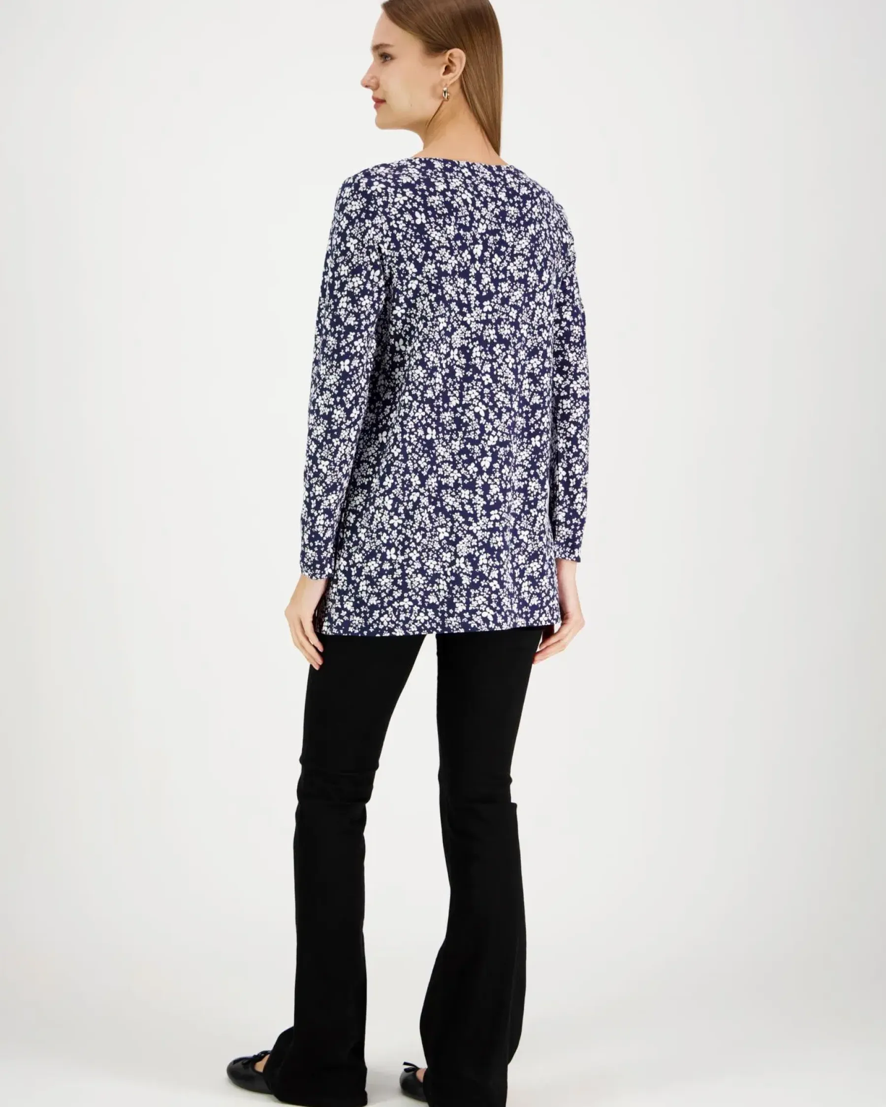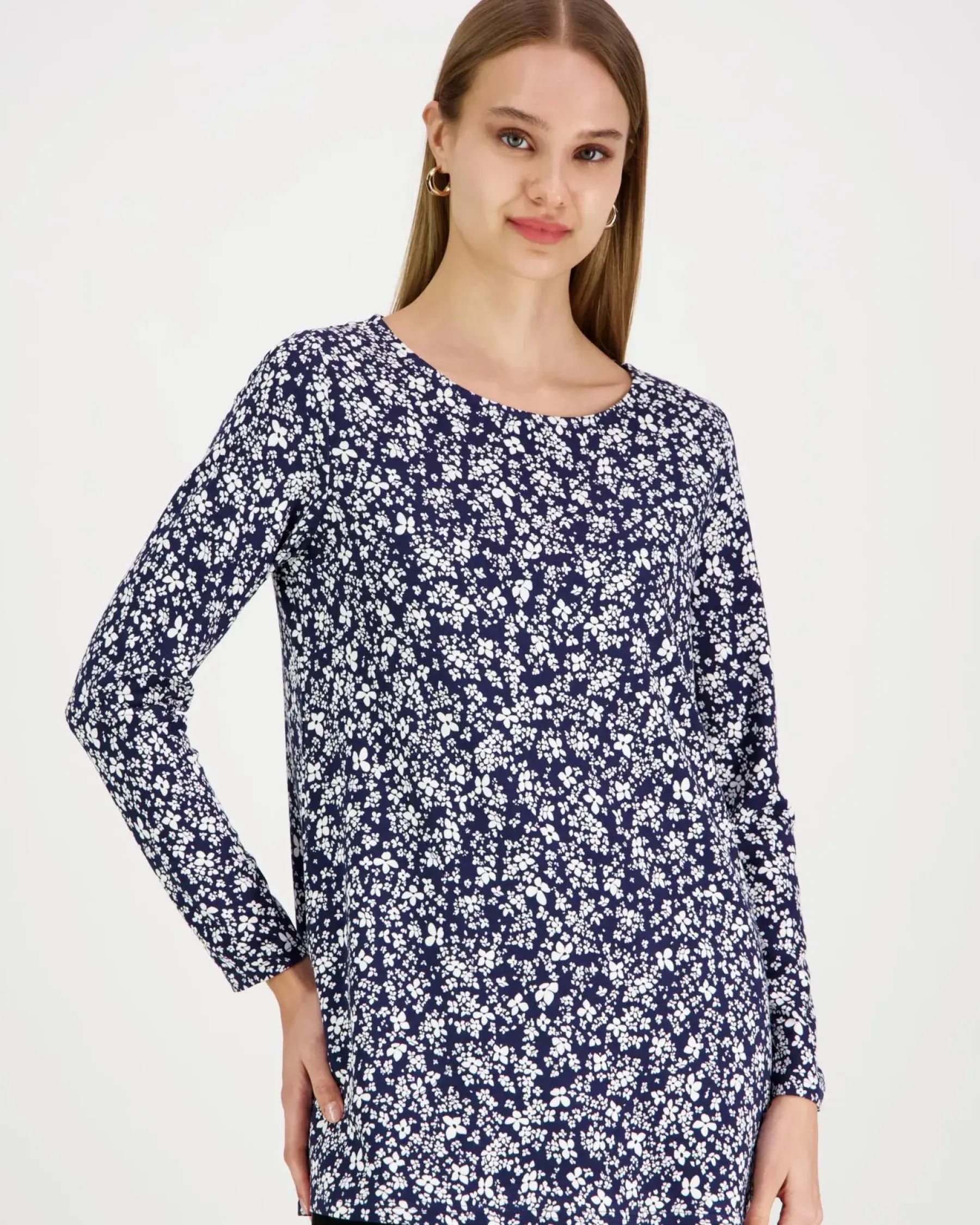 Aventuran printtikuvioitu trikootunika pyöreällä pääntiellä ja 3/4 pituisilla hihoilla on valmistettu miellyttävästä ja hengittävästä puuvilla-modaalista, jossa mukana ripaus elastaania lisäämään joustoa käyttömukavuuteen. Koossa M rinnanympärys noin 99 cm, pituus olalta helmaan noin 74 cm.