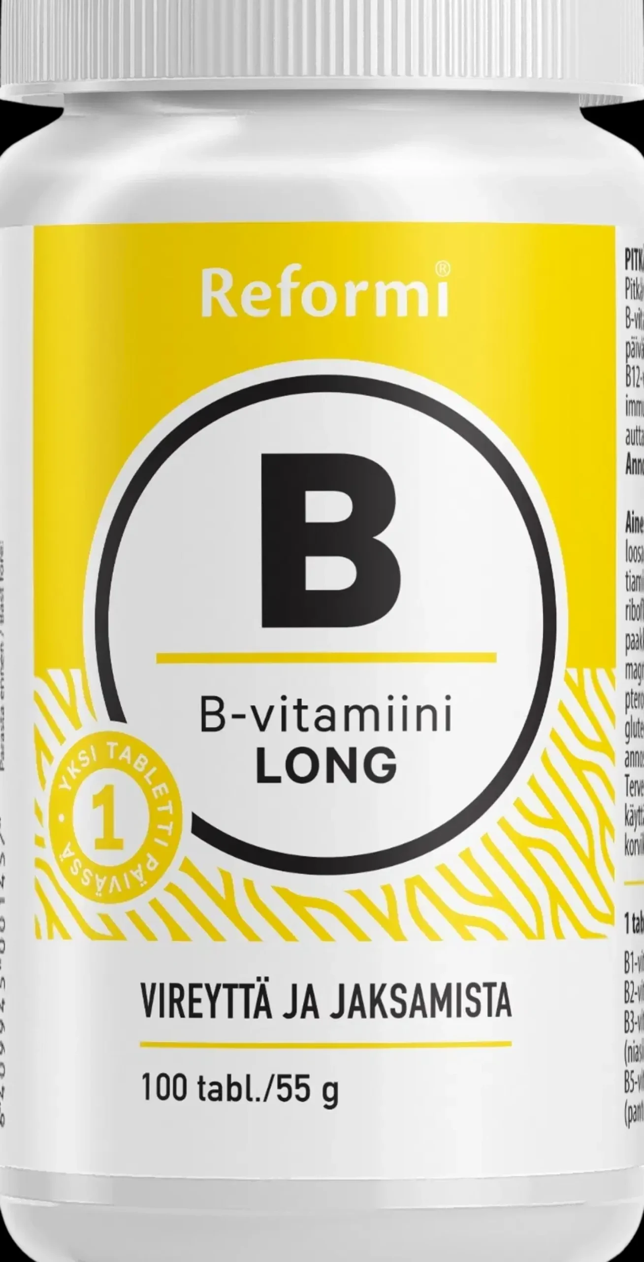Pitkävaikutteinen B-vitamiinivalmiste, joka vapauttaa B-vitamiineja elimistön käyttöön tasaisesti pitkin päivää. Reformi B-vitamiini Long sisältää kaikki B-ryhmän vitamiinit. Sisältää mm. B6- ja B12- vitamiineja, jotka edistävät hermoston ja immuunijärjestelmän normaalia toimintaa sekä auttavat vähentämään väsymystä ja uupumusta.