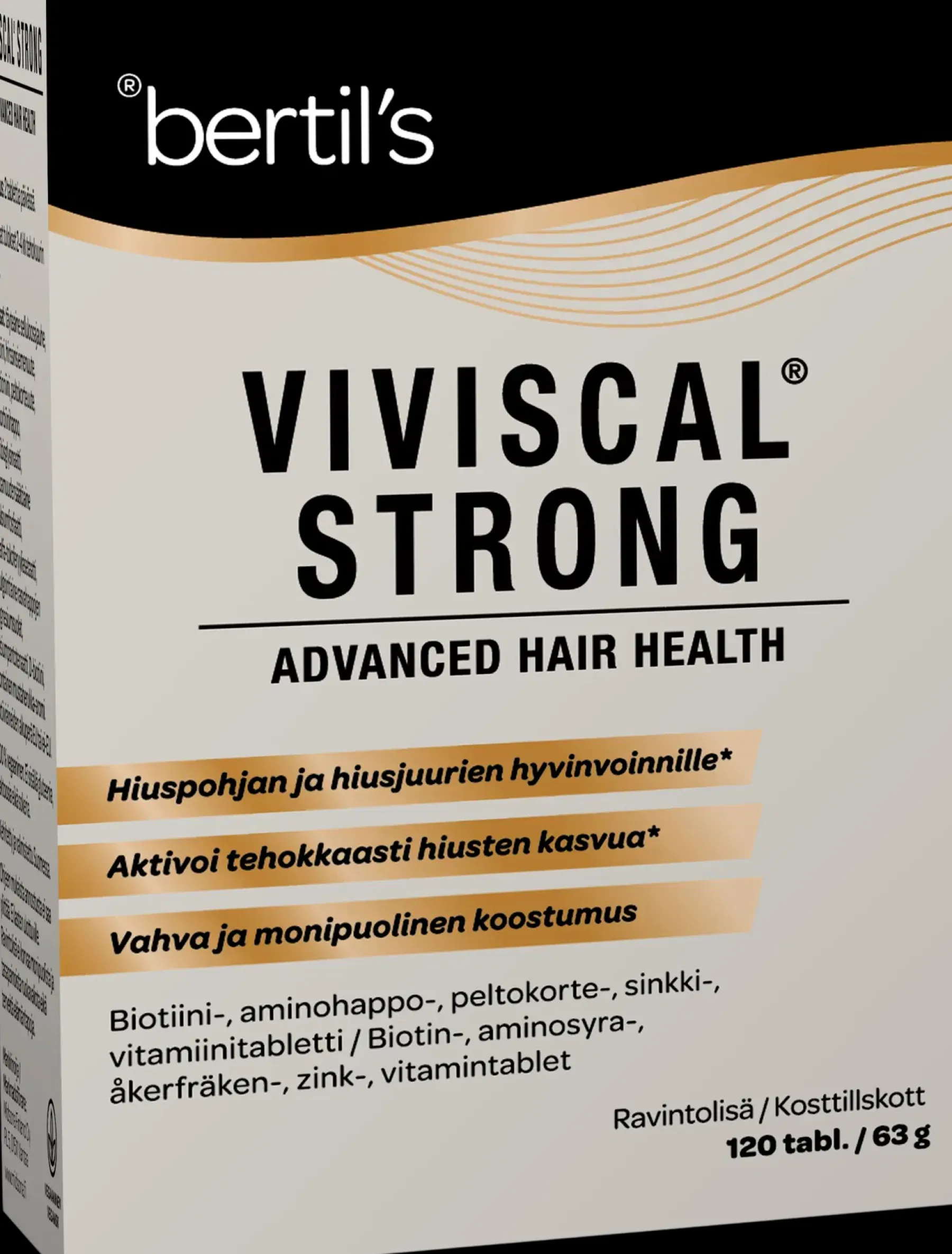 bertil´s Viviscal Strong on hiuspohjan ja hiusnystyjen ravitsemiseen ja hiustenlähtöongelmiin erityisesti kehitetty tehotuote. Se sisältää runsaasti sekä hiuspohjaa rauhoittavia että hiuksia ravitsevia aineosia; biotiinia,