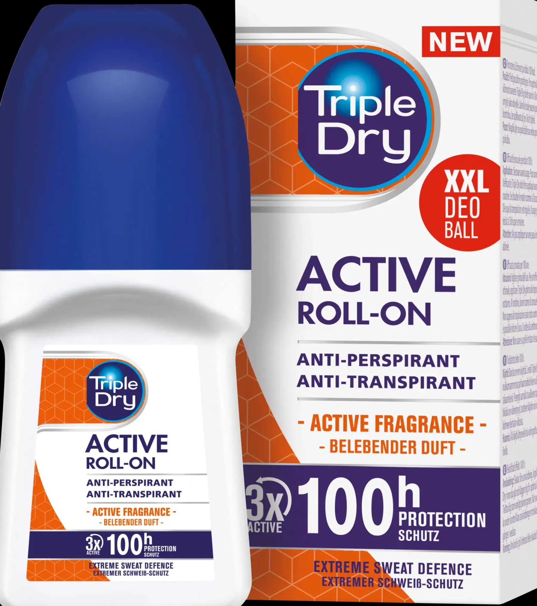 Triple Dry Active Men 100h antibakteerinen antiperspirantti roll-on estää tehokkaasti liiallista hikoilua. Sen kliinisesti todistettu kolmivaiheinen suojauskompleksi ja aktiivinen koostumus tarjoavat maksimaalisen tehon ja pitkäkestoisen vaikutuksen jopa 100 tunnin suojan hikoilua ja hajuja vastaan, mukautuen kehon tarpeisiin ja lämpötilaan. Sopii normaaliin tai voimakkaaseen hikoiluun kaikille, jotka tarvitsevat pitkäkestoista suojaa hikoilua vastaan. Hoitavana aineena tuotteessa kosteuttavaa glyseriiniä ja ihoa rauhoittavaa allantoiinia. Käytännöllinen, suuri rollonpallon muotoilu nopeaan ja mukavaan levitykseen. Miellyttävän hienovarainen tuoksu takaa pitkäkestoisen aktiivisuuden tunteen. Ei sisällä alkoholia.