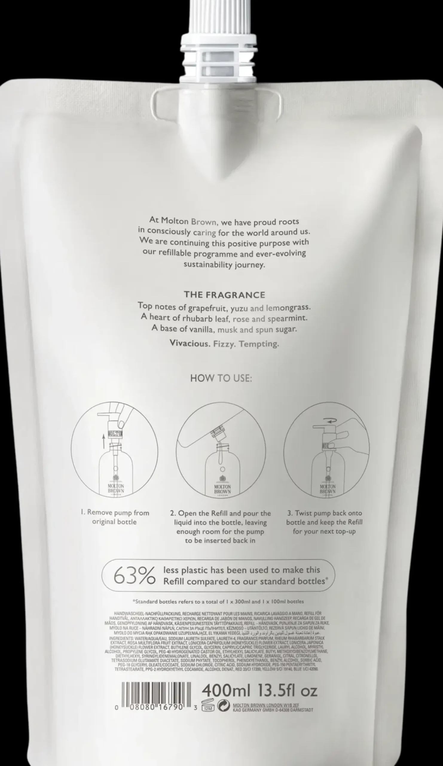 Molton Brown Delicious Rhubarb & Rose Fine käsisaippua -uudelleentäyttöpakkauksella täytät Molton Brown -muovi- tai lasipullosi uudelleen. Virkistävä ja kosteuttava käsisaippua antaa ylellisen ja miellyttävän puhdistavan elämyksen. Sisältää eloisan raparperin, täyteläisen vaniljan ja raikkaan greipin vastustamattomia nuotteja. Käytä yhdessä yhteensopivan Molton Brown -käsiemulsion kanssa vahvistaaksesi virkistäviä ja eloisia tuoksunuotteja. Uudelleentäyttöpakkaus sisältää 63 % vähemmän muovia kuin tavalliset Molton Brown -pullot.