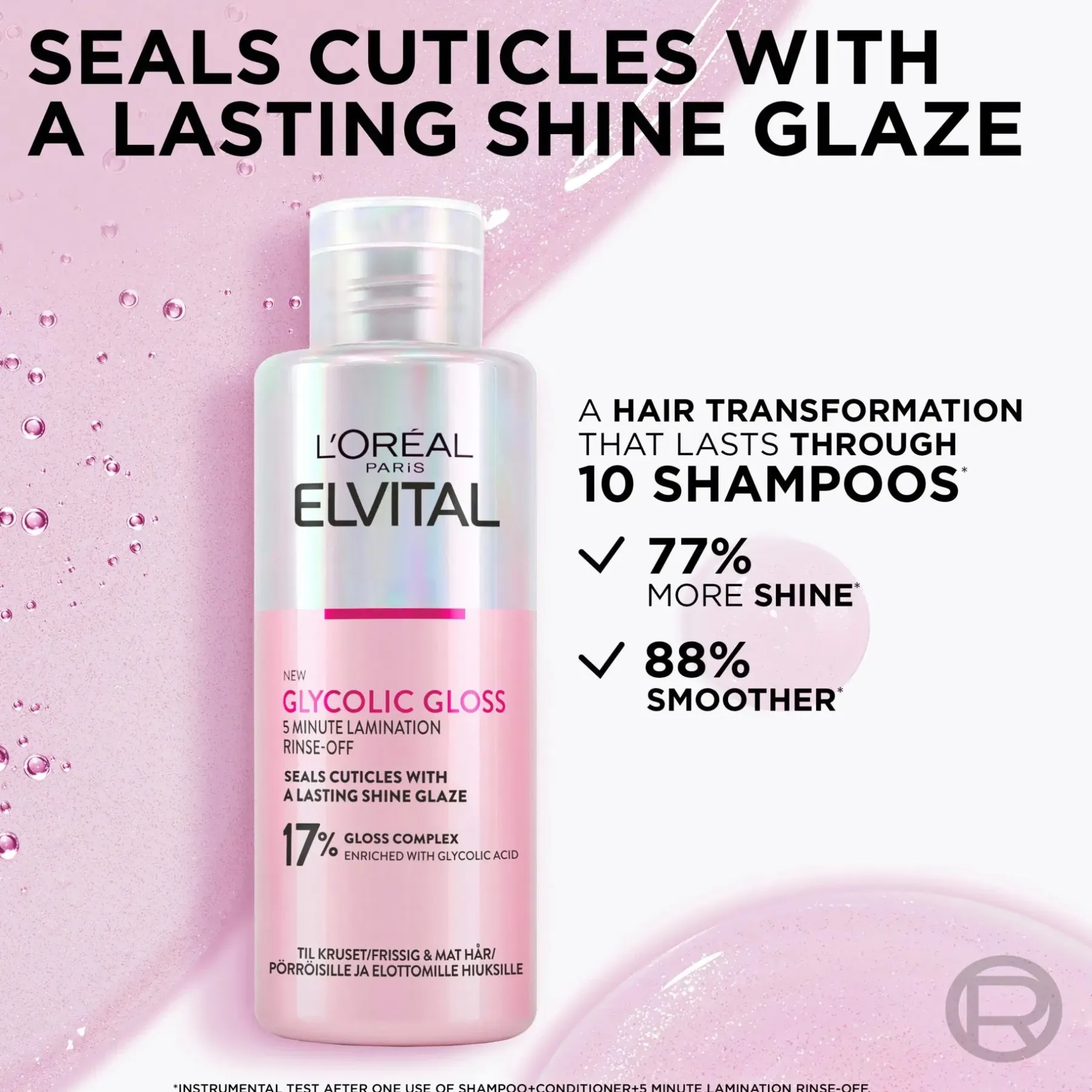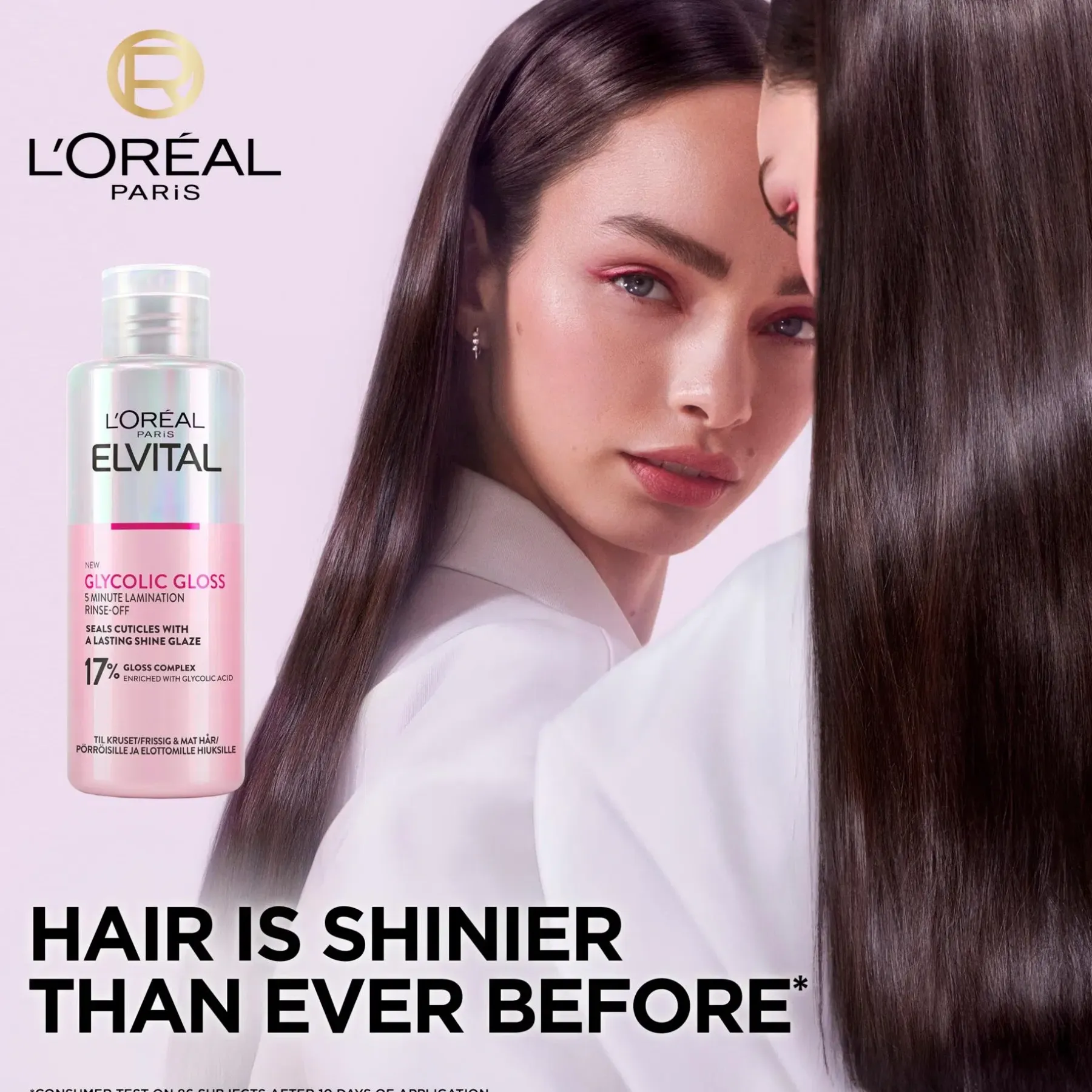 Elvital Glycolic Gloss- sarja on kiiltoa antava kotona käytettävä hiustenhoitorutiini, jonka tuotteet korjaavat hiuksia, tekevät hiusten kunnosta paremman ja antavat pitkäkestoista kiiltoa. Lopputuloksena 77% kiiltävämmät** ja 88% sileämmät*** hiukset.