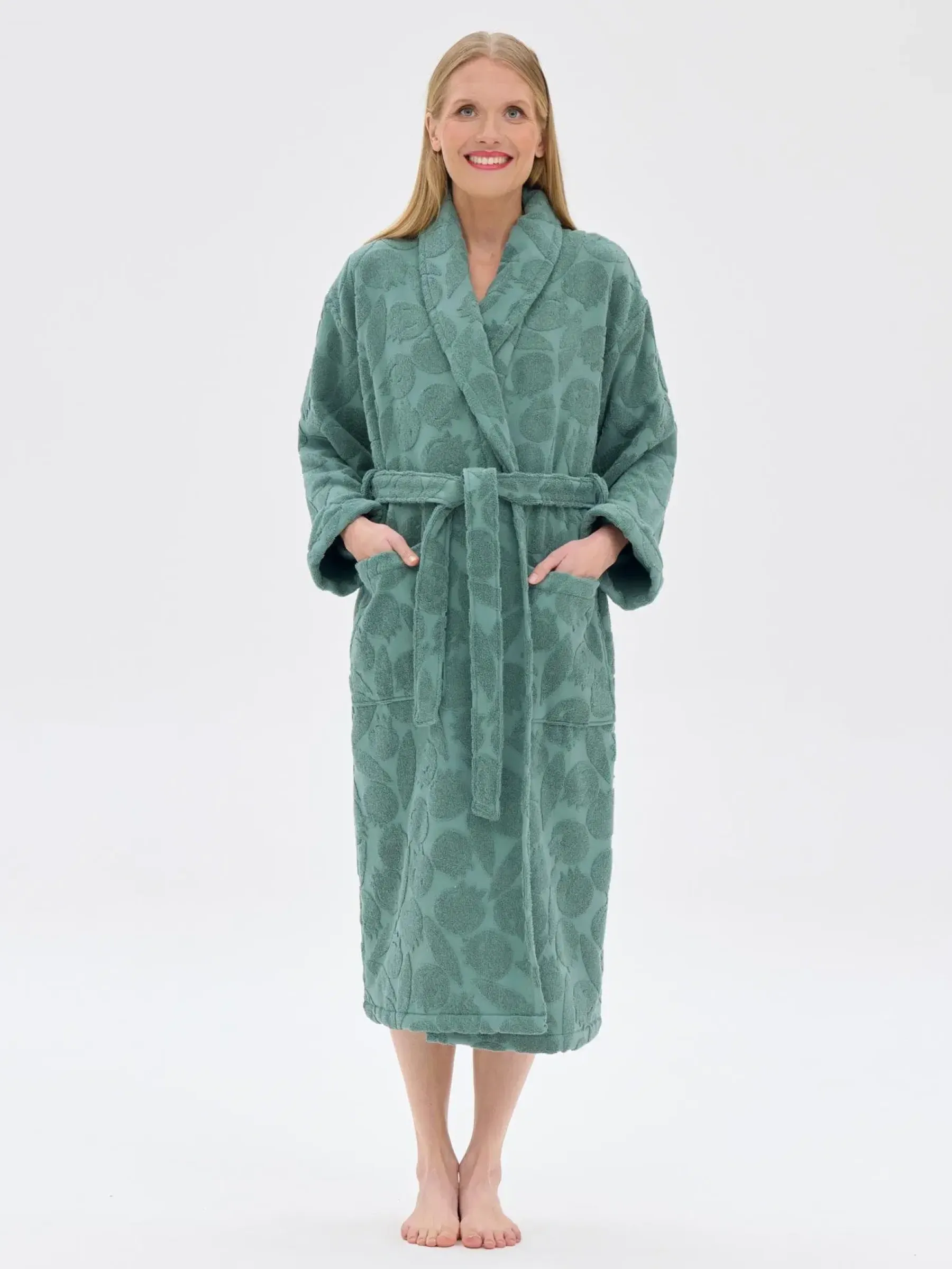 RATIA ® yleellinen frotee kylpytakki. Kylpytakkin ulkopinta on Metsämarja kuosinen kohokuvio, sisäpinta on pehmeää ja imukykyistä froteeta. Takissa on päivitetty, hieman väljempi mitoitus. Materiaali on 100% puuvillaa. Tuote on suomalaisen suunnittelun käsialaa ja kantaa Suomalaisen Työn Liiton, Design From Finland –merkkiä. Valmistettu Portugalissa.