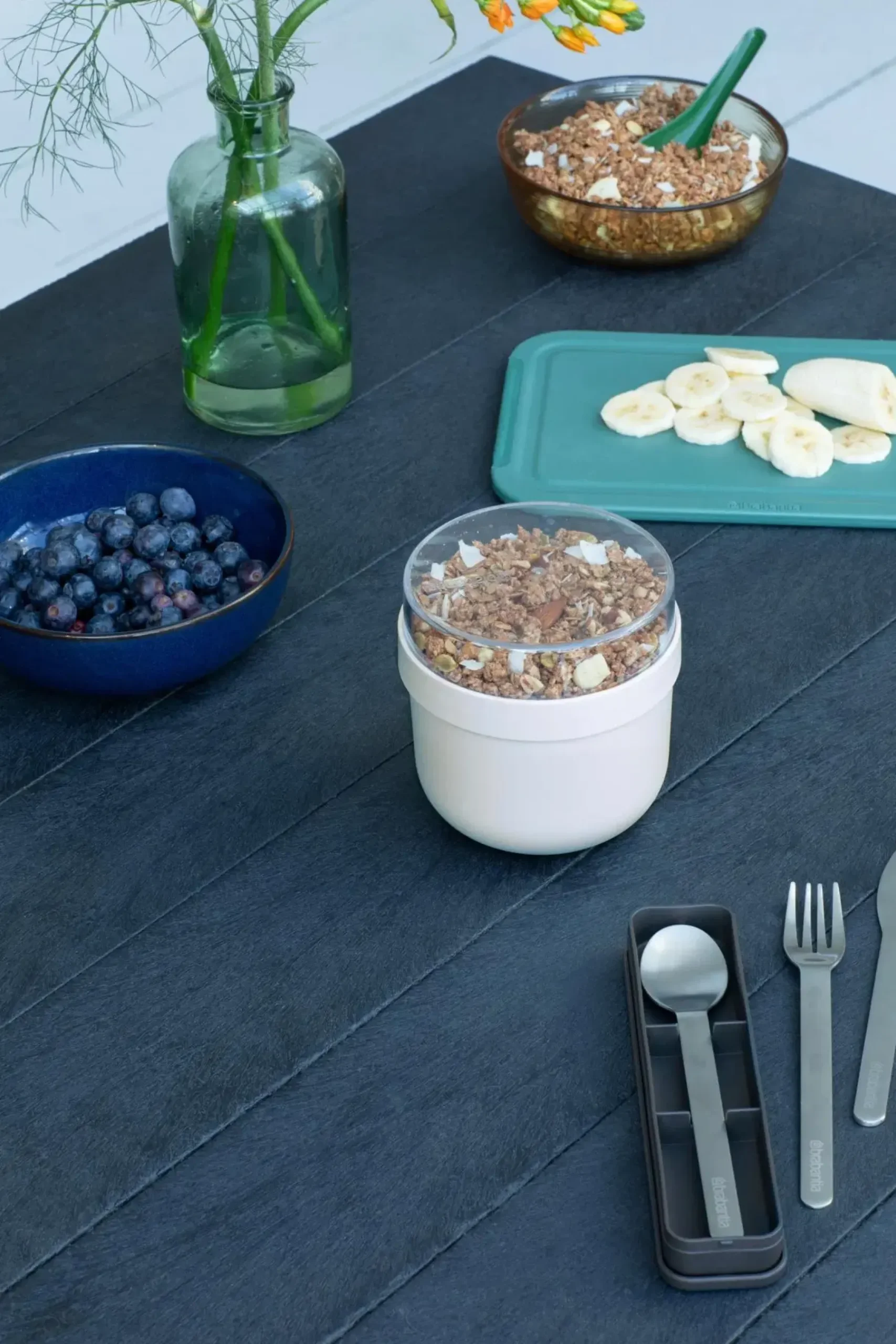 Ota aamiainen mukaan. Syö päivän tärkein ateria töissä, koulussa, junassa tai missä tahansa haluat tällä Brabantia Make & Take -aamiaiskulholla. Kulhoon saat mukaan 0,5 litraa suosikkiaamupalaasi. Älä huoli jogurtin tai myslin vuotamisesta – tässä mahtavassa kulhossa on läpinäkyvä, muovinen säiliö päällä, jossa on vuotamaton tiiviste. Mennään! Ota oma aamiaiskulhosi mukaan.Myötä- ja vastoinkäymisissä – ergonominen kulhomalli.Yhden annoksen kokoinen – jopa 500 ml jogurttia, kaurapuuroa tms.Pidä kuivana – 100 % vuotamaton.Kätevä – auki kierrettävä säiliö aineksille (180 ml).Rapeaa ruokaa – erillinen säiliö pitää pähkinät, siemenet ja myslin kuivana.Helppo täyttää – iso suuaukko.Helppo puhdistaa – iso suuaukko ja voidaan pestä pesukoneessa.Monikäyttöinen – soveltuu mikroon ja pakastimeen.Kestävä – valmistettu pitkään kestävistä materiaaleista.Ongelmaton käyttää – 5 vuoden takuu ja huolto.Tietoinen valinta – BPA-vapaa.Kestävä – 100 % kierrätettävä käytön jälkeen.Vähemmän jätettä – uudelleenkäytettävä ruoka-astia.