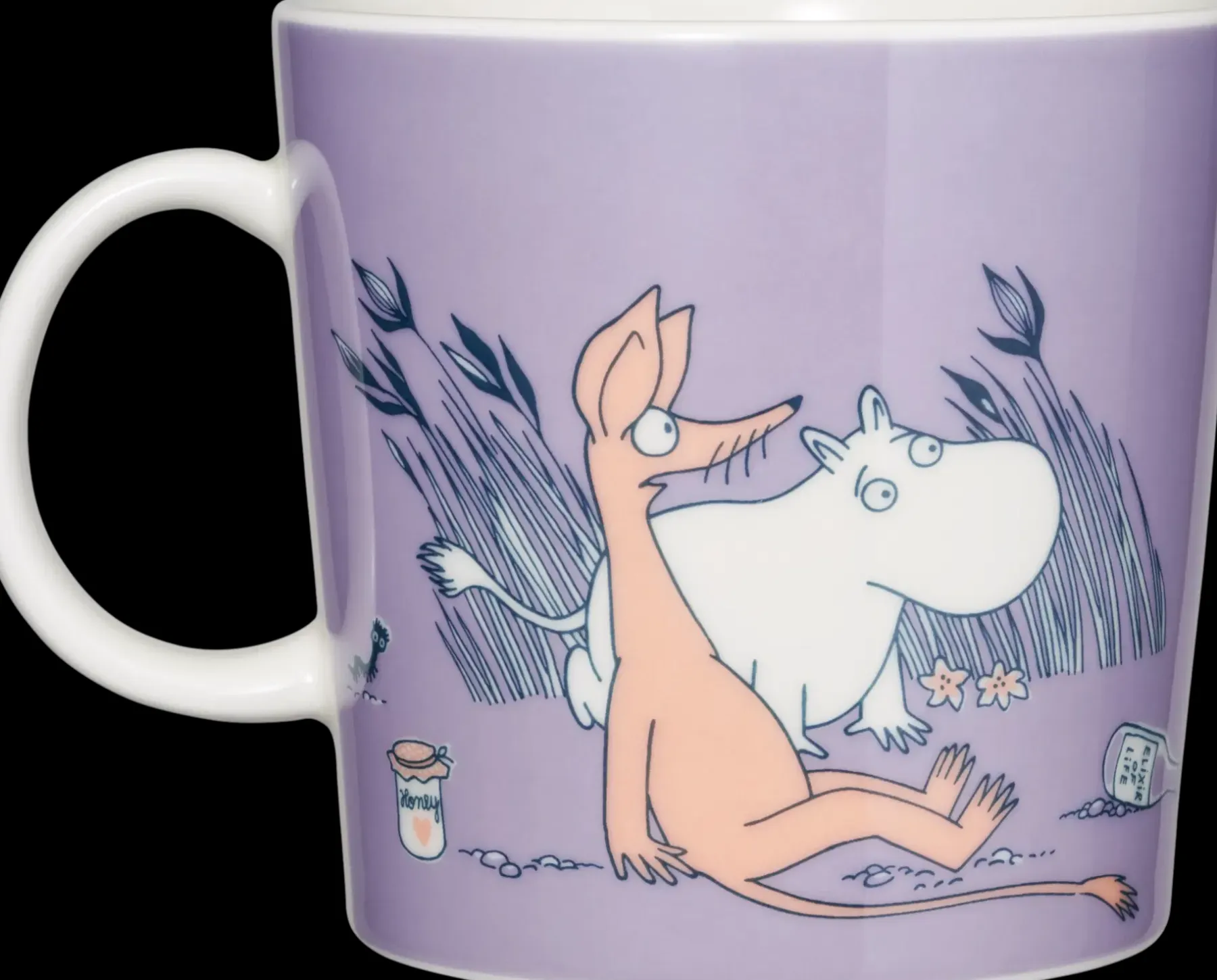 N-mukissa kohdataan yksinäinen Mörkö, jota Nipsu, Muumipeikko ja Samu pelästyvät. He ovat valmistaneet erityisen taikajuoman, joka sisältää pippuria, hunajaa ja vettä. Juoman on tarkoitus nuorentaa, mutta se toimiikin päinvastoin… Moomin Arabia, muki 0,4l, ABC N