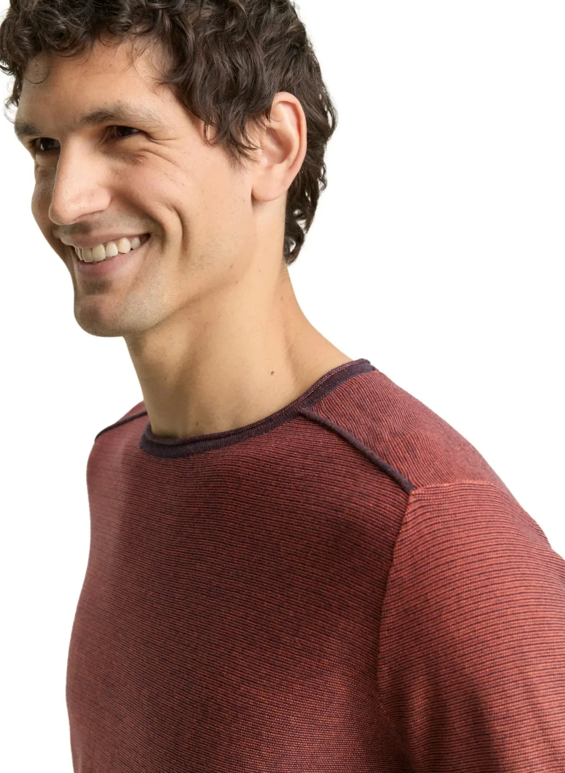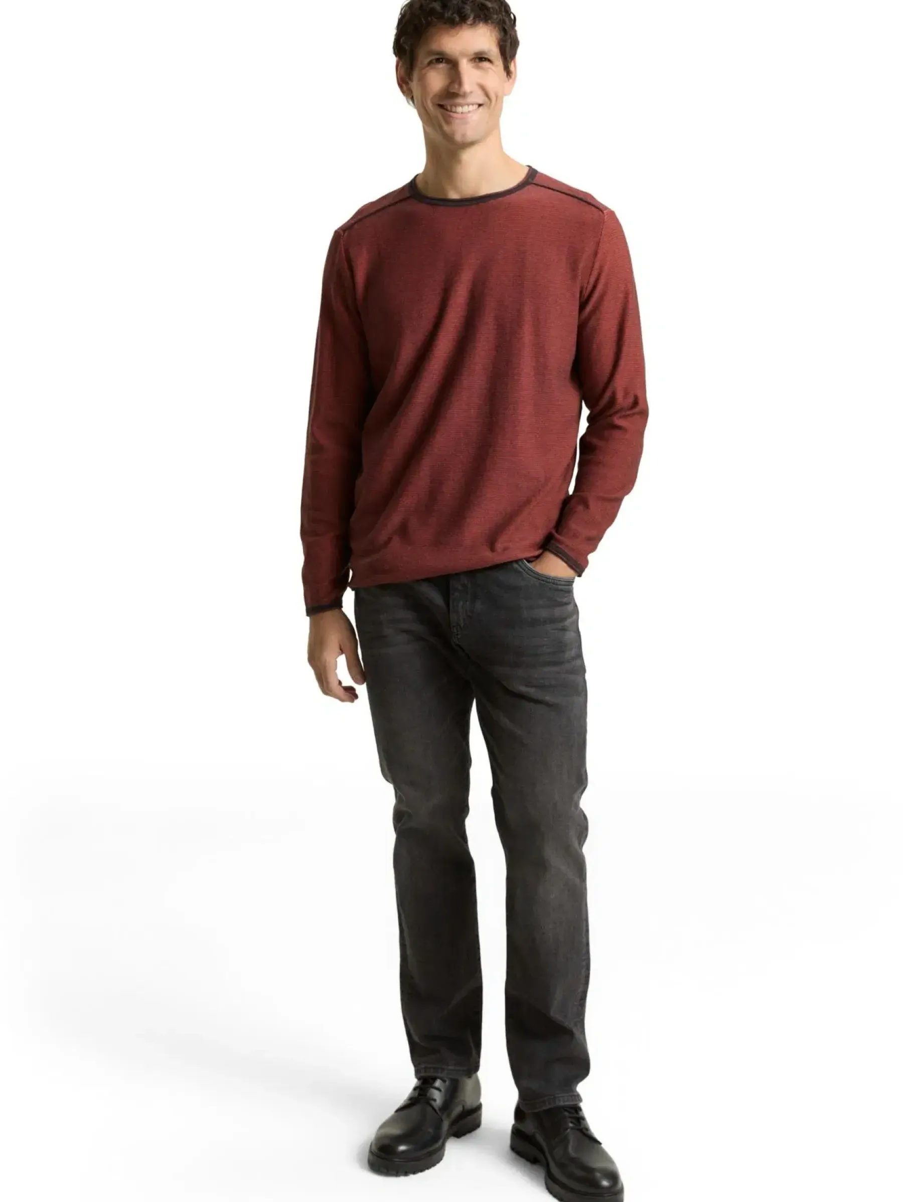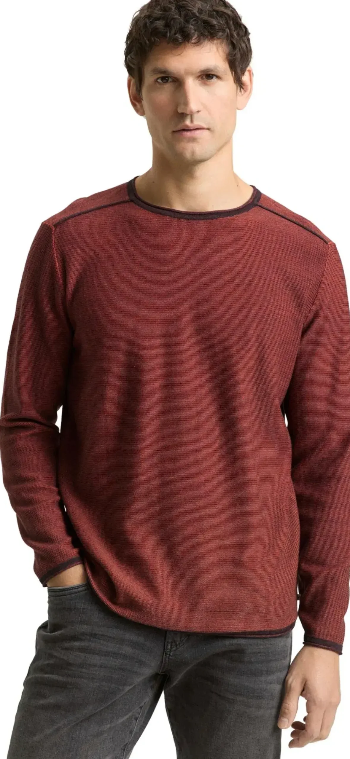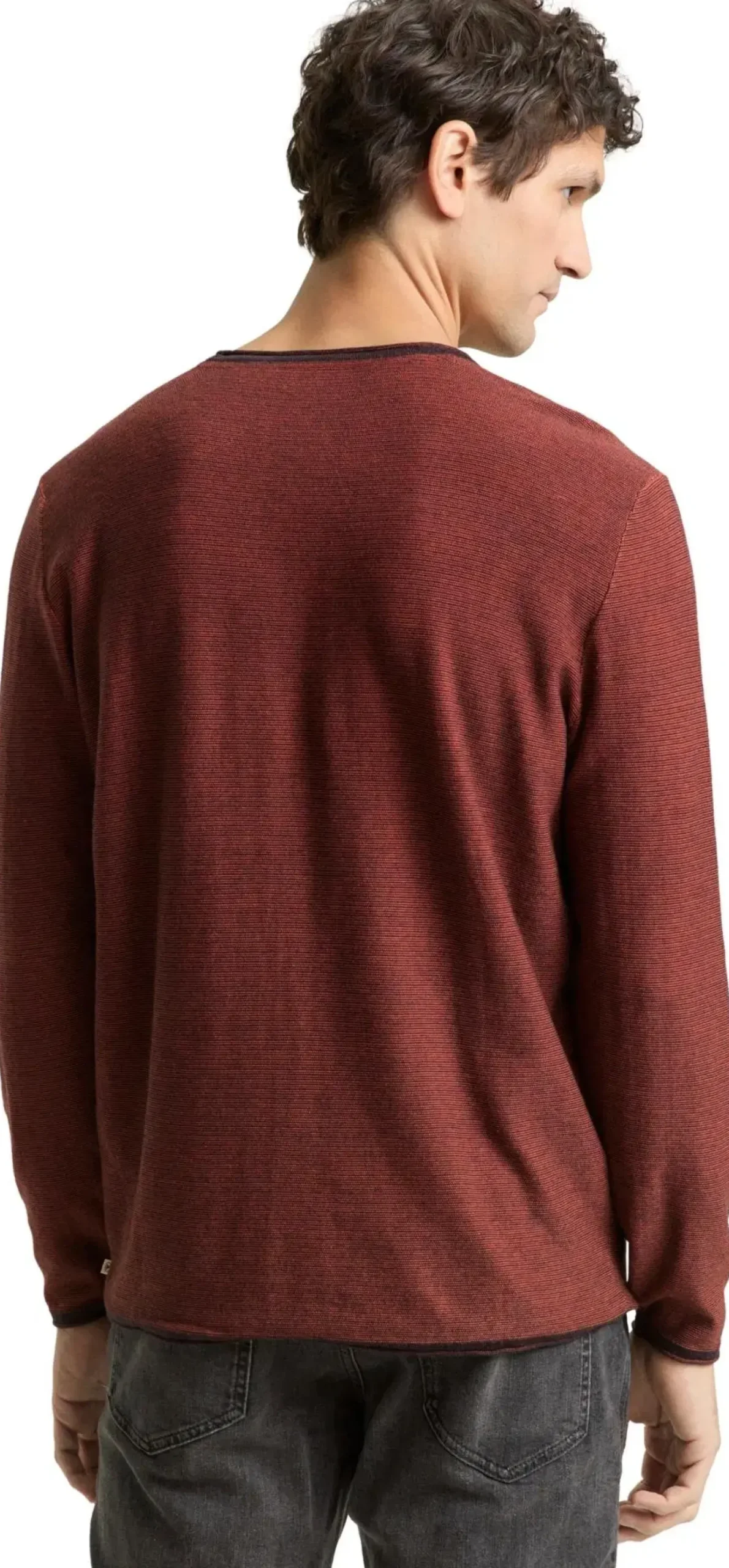 Miesten O-aukkoinen kaksivärinen neule. Helma ja hihansuut suorat. Materiaalina tiheäraitainen puuvillaneulos.