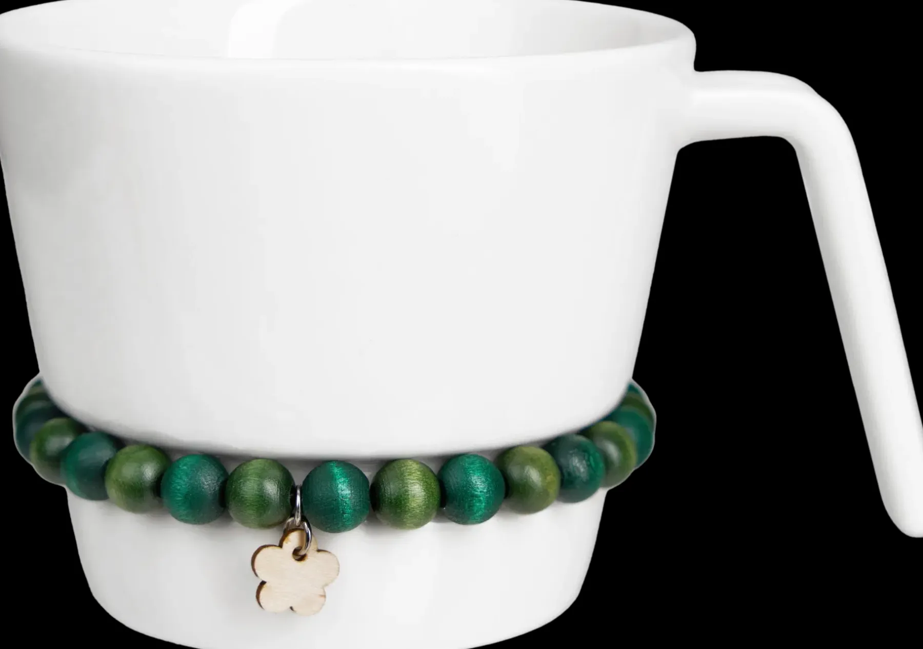 Nuppu-kulho kahvalla on tilava ja kaunis suuri muki. Mukia koristaa puuhelmikranssi. Korkeus 9 cm, leveys 14,5 cm, Ø 11 cm. Vetoisuus 4 dl. Keraaminen muki on astianpesukoneen ja mikroaaltouunin kestävä, kunhan puuhelmikranssin ensin irrottaa.