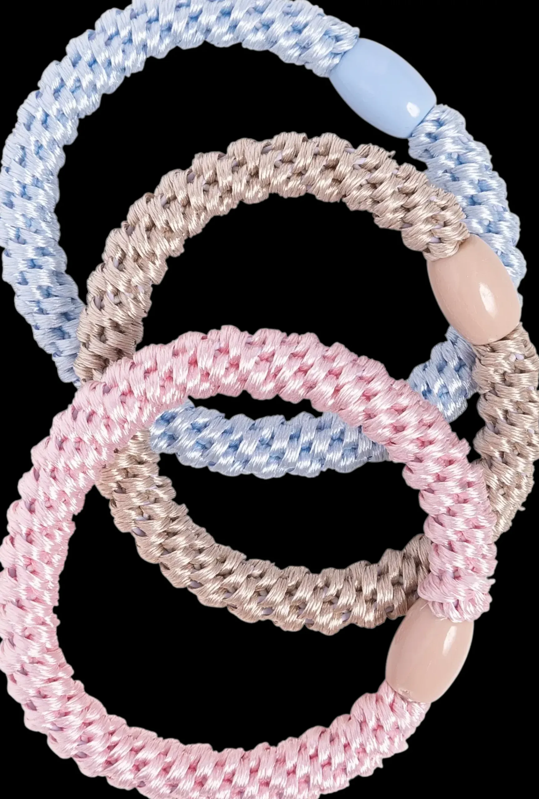 Trendikäs hiuslenkkisetti, jossa 3 kpl punottuja beigen, vaaleansinisen ja vaaleanpunaisen värisiä hiuslenkkejä. Hiuslenkin halkaisija n. 6 cm. Materiaali punottu lanka, muovi.