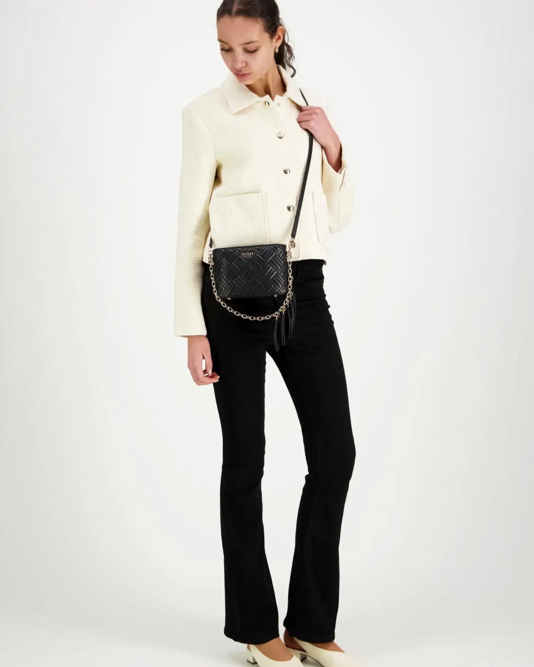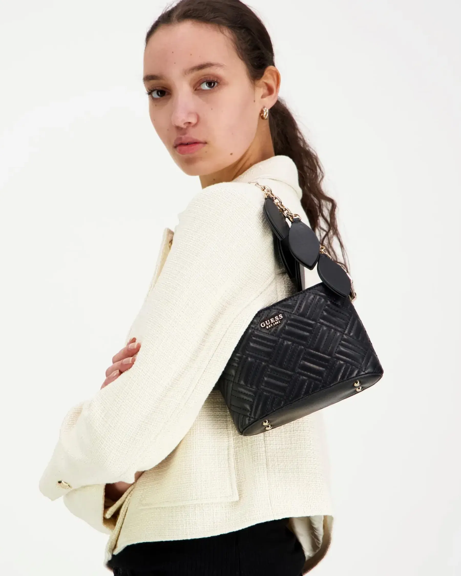 Tikattu pintaisessa pikkulaukkussa on irrotettava lehti/ketju koristeinen lyhyt hihna sekä pitkä säädetävä olkahihna. Laukun päällä oleva läppä sulkeutuu magneetilla. Sisältä löytyy pieni vetoketjutasku.