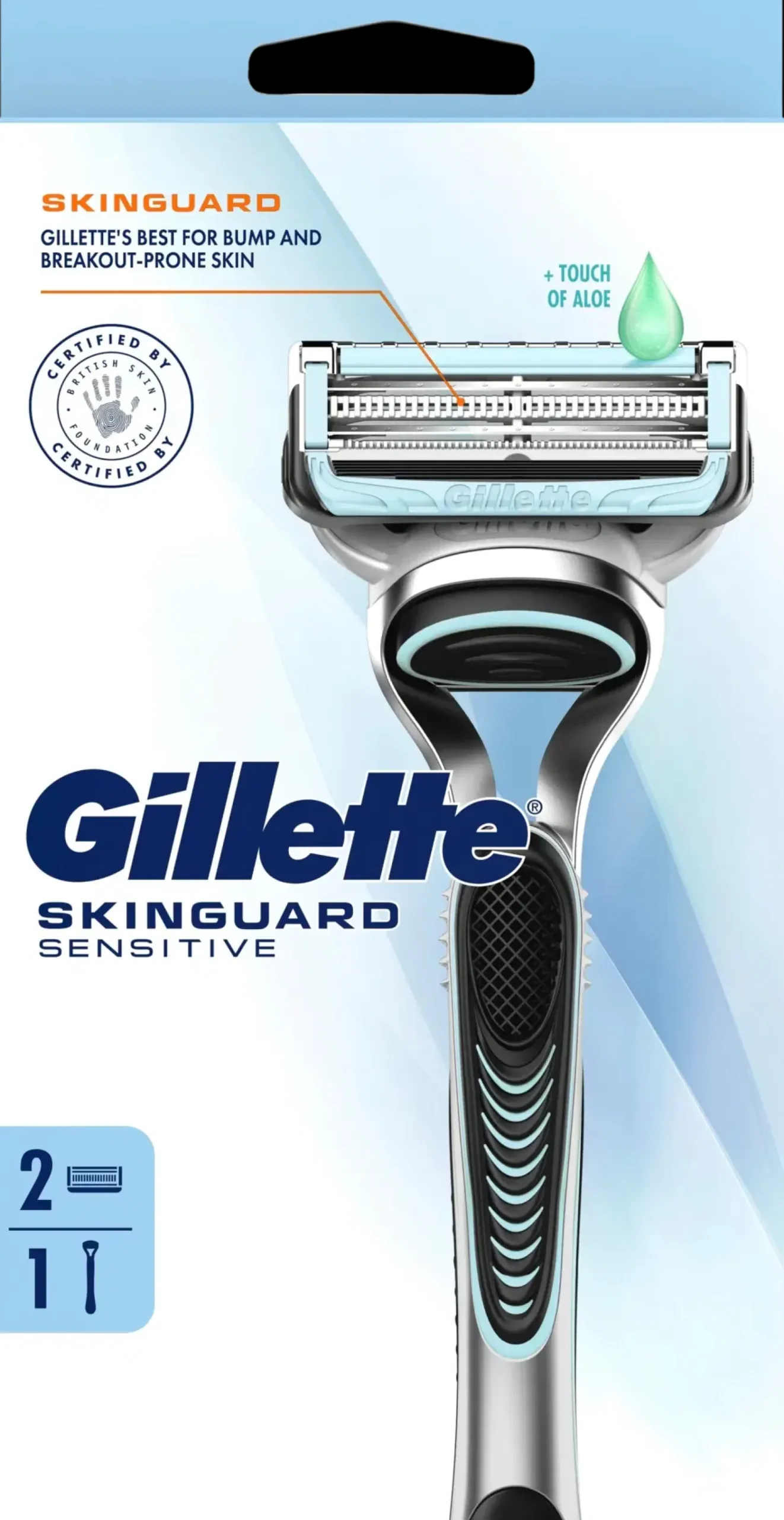 Gillette SkinGuard Sensitive Parta miehille on suunniteltu ajamaan kyhmyjä ja ihottumaa aiheuttavaa ihoa. Ainutlaatuinen SkinGuard-teknologia suojaa ihoa partaterältä ja auttaa vähentämään ärsytystä. Lisäksi kaksi vähäkäyttöistä leikkausterää auttavat vähentämään nykimistä ja kulumista.