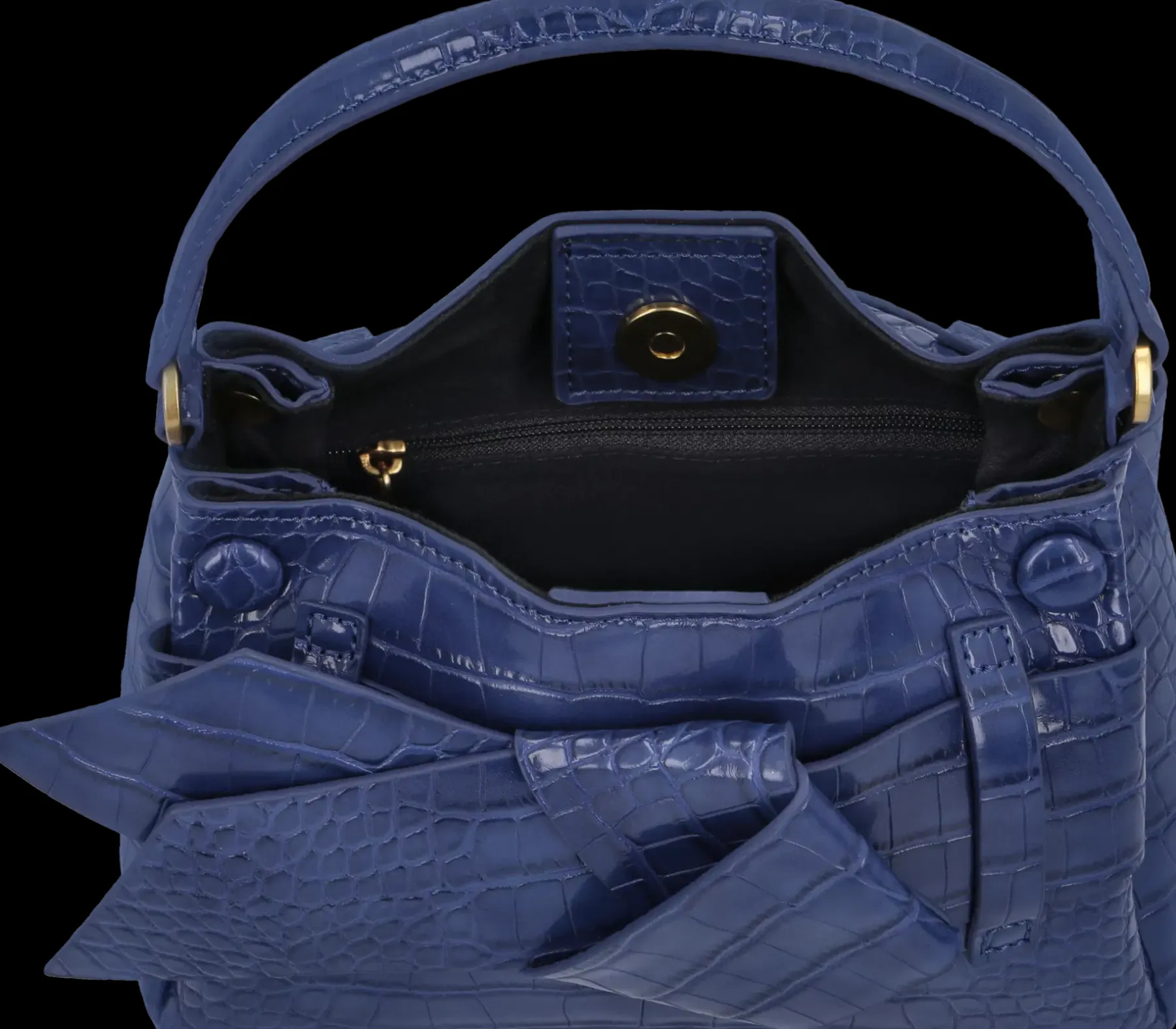 Suljetaan magneettinepillä. Sisällä vetoketjutasku ja avotasku. Irrotettavat ketjukoristeinen olkahihna. Edessä rusettikoriste. Painettu kroko pinta.
