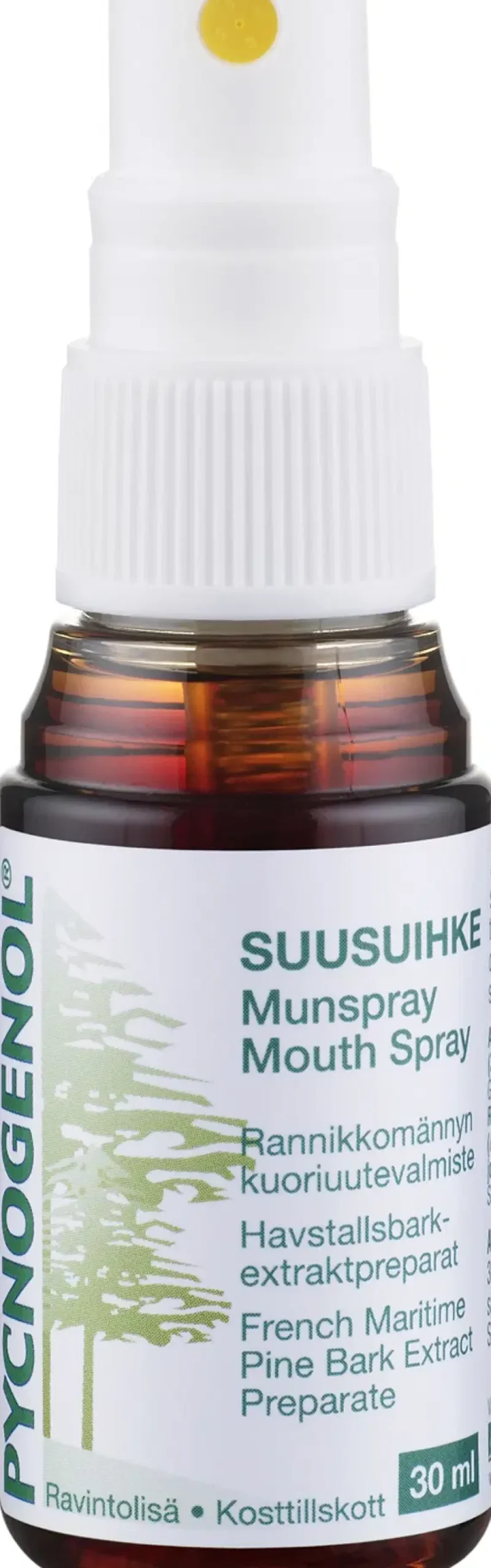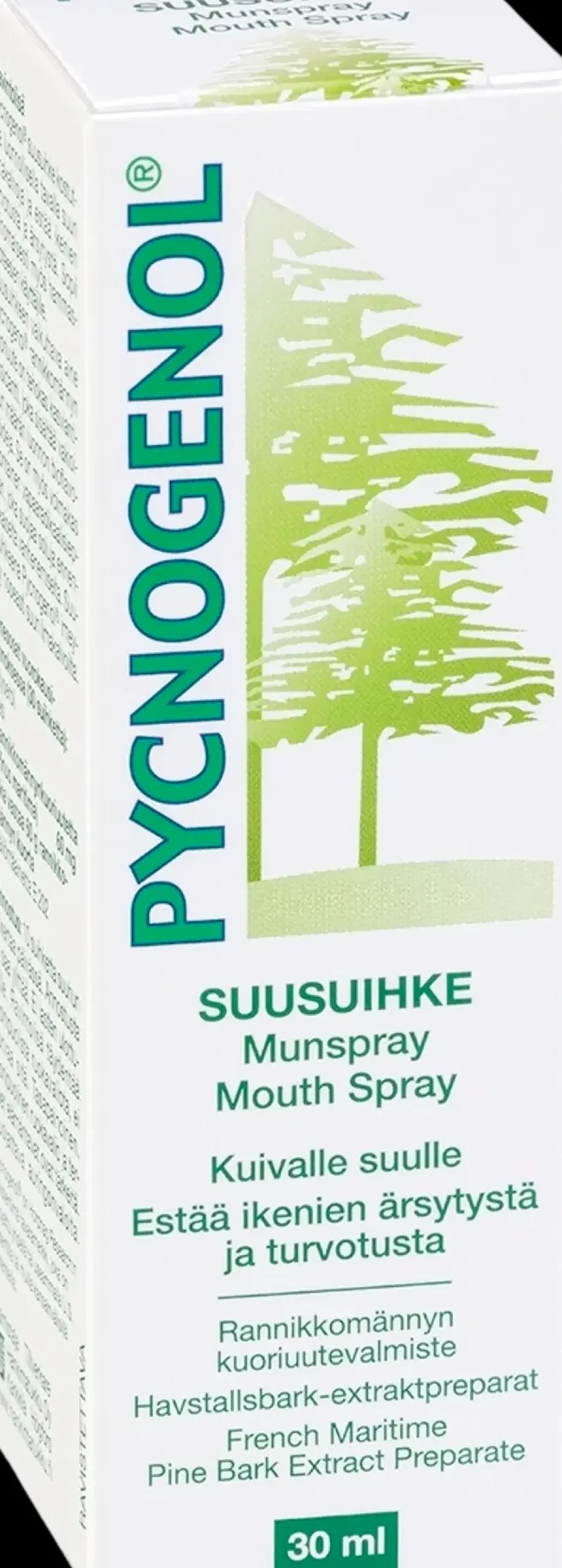 Pycnogenol suusuihke kostuttaa luonnollisella tavalla suun limakalvoja. Sopii erinomaisesti myös hammasproteesien käyttäjille. Suusuihkeen vaikuttava aine Pycnogenol rannikkomännyn kuoriuute sisältää vakioidun määrän luonnon bioflavonoideja. Suusuihkeena Pycnogenol imeytyy nopeasti suun limakalvoilta. Valmistettu Suomessa.