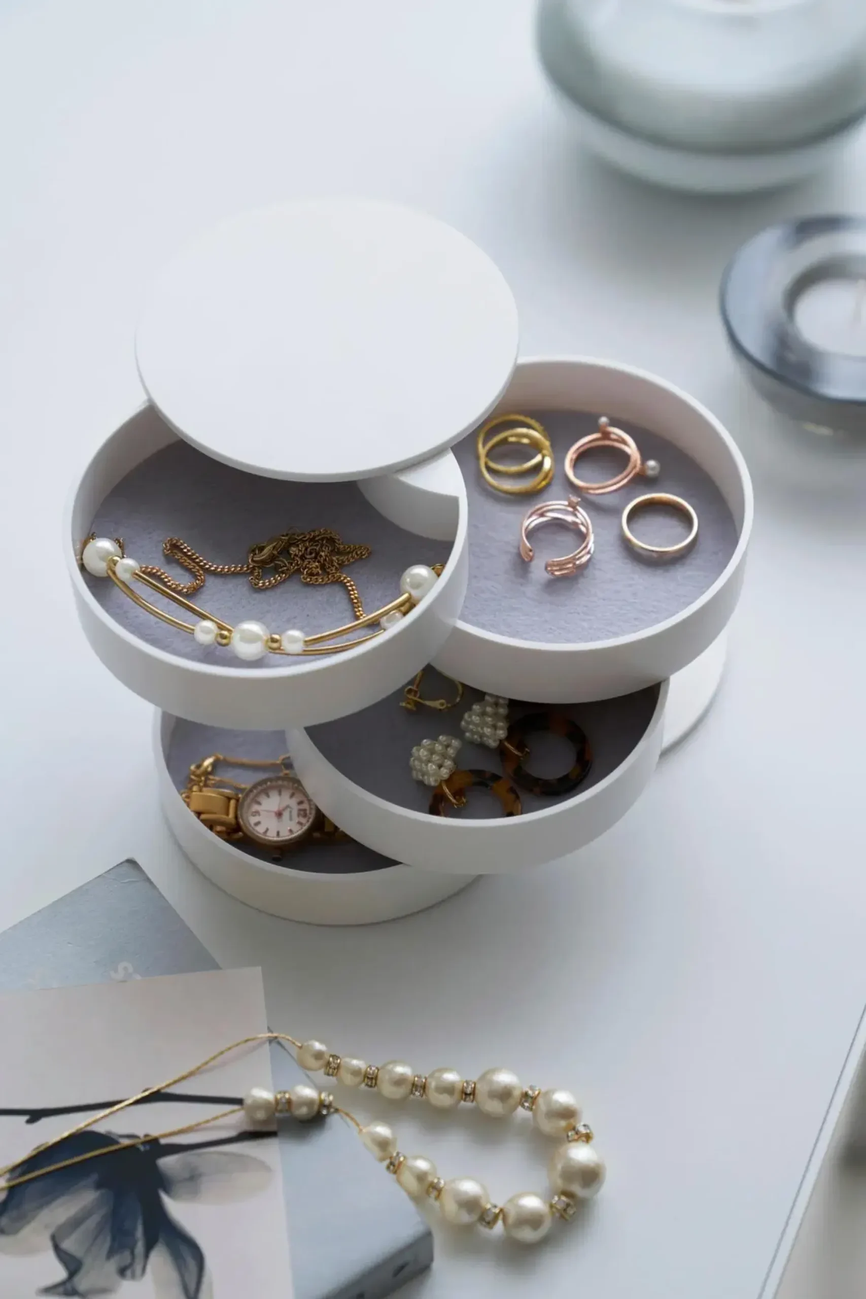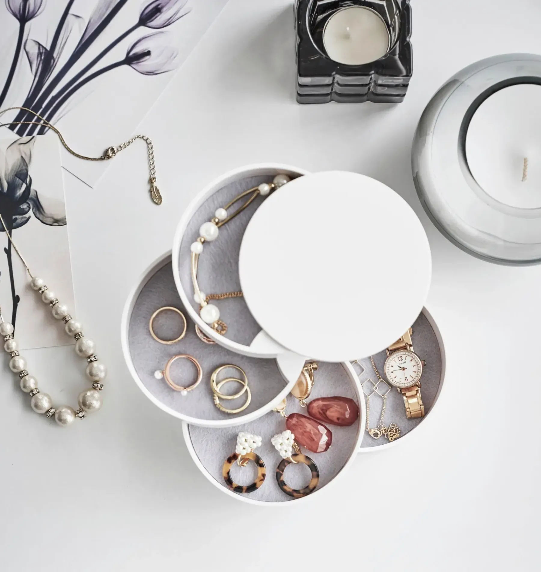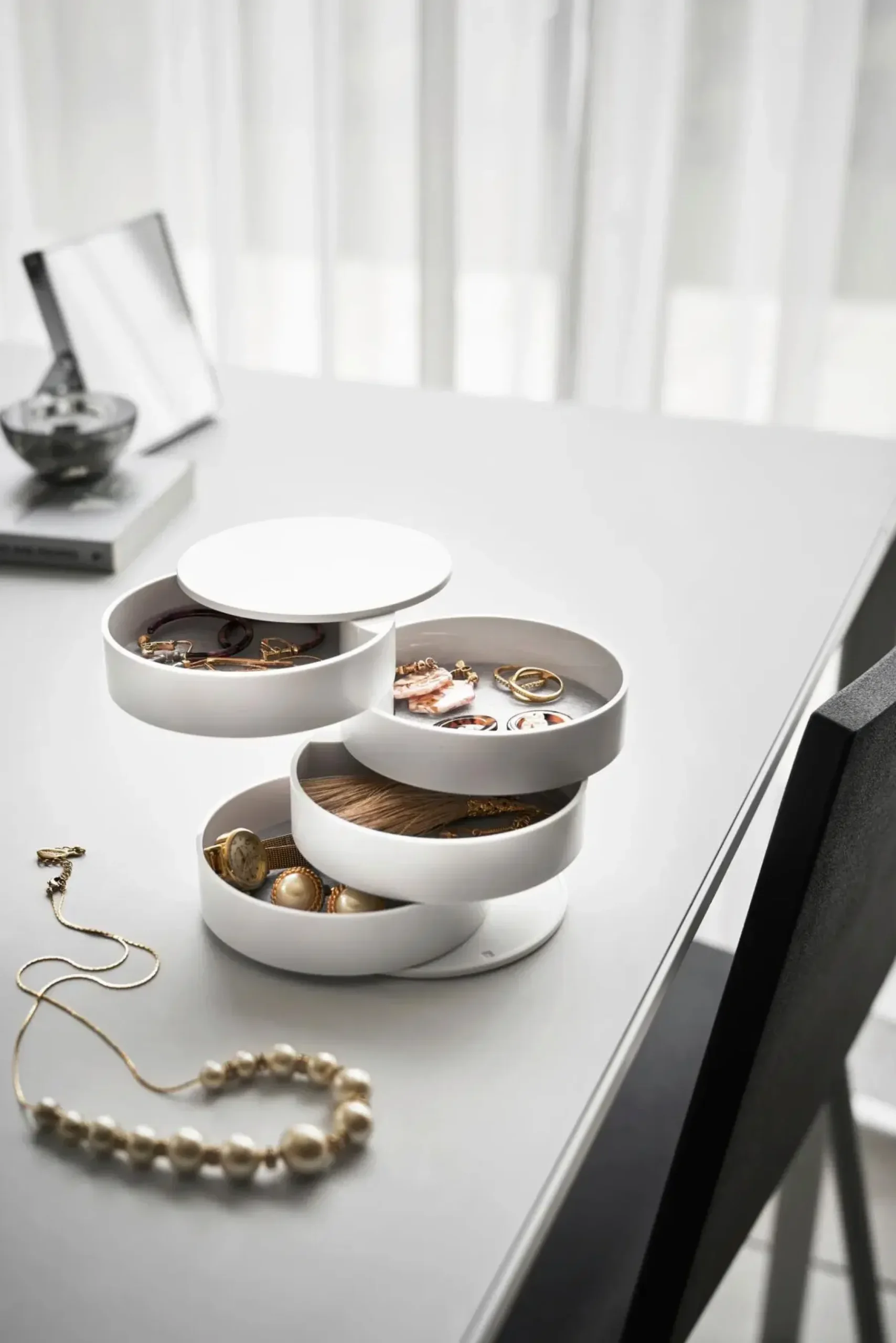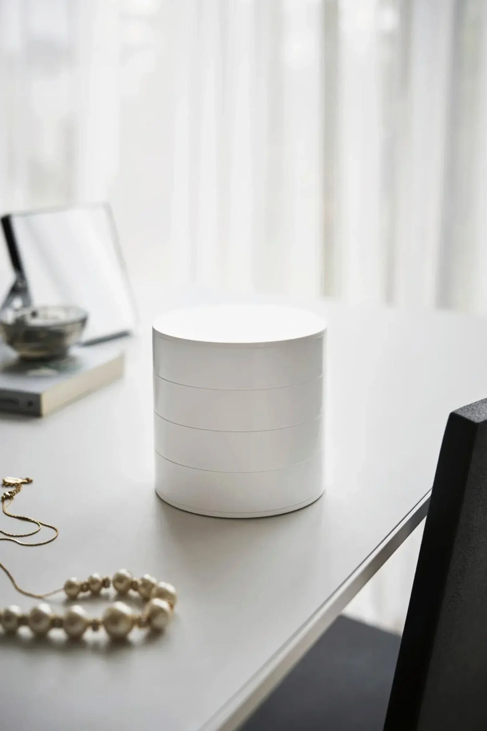 Minimalistisessa Tower-korulippaassa on neljä kerrosta, joissa korut ja muut pikkutavarat on vaivaton pitää hyvässä järjestyksessa. Kannen ansiosta myös ylin kerros on suojassa pölyltä. Materiaali: ABS-muovi.