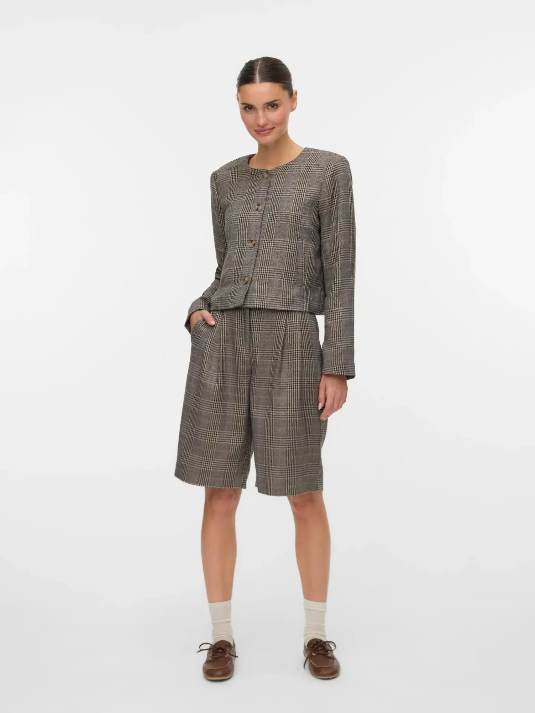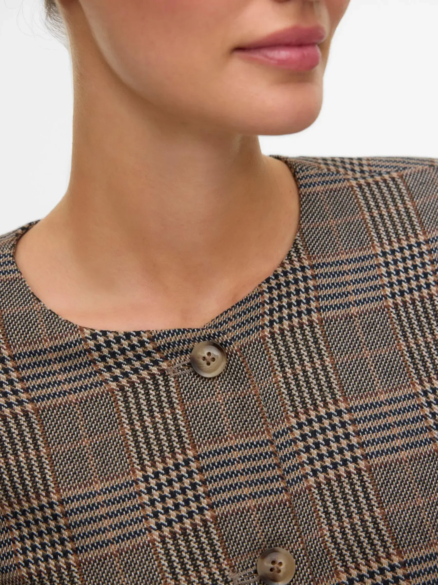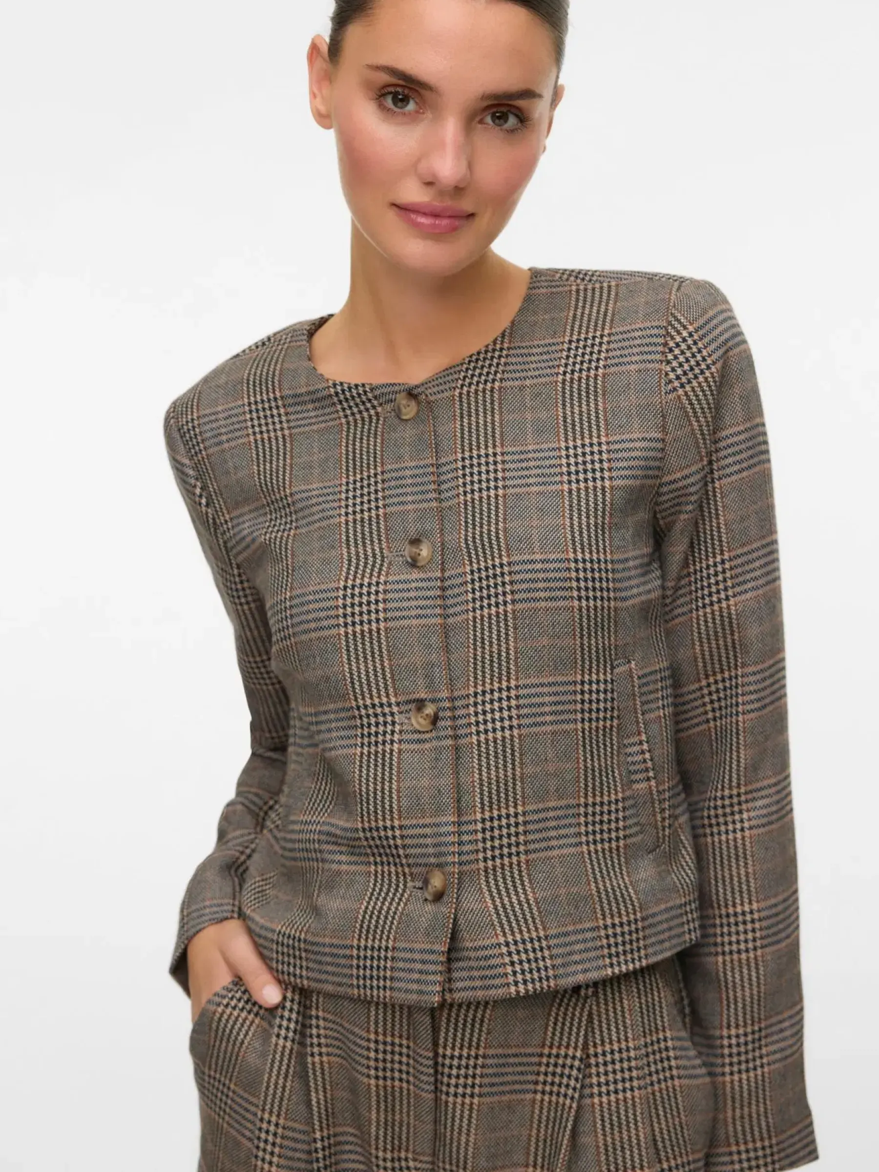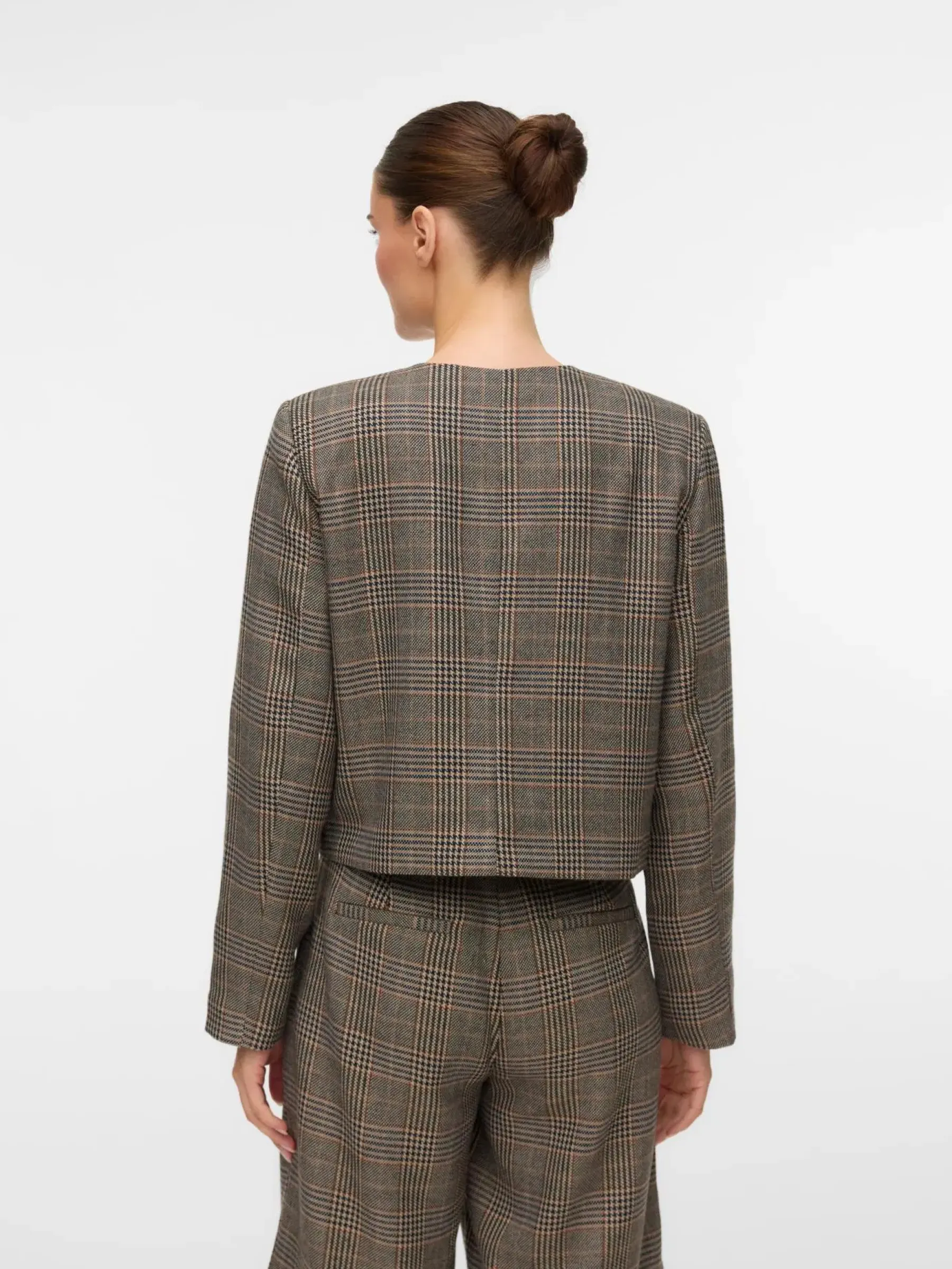 Trendikäs, kaulukseton lyhyt jakku ruutukuosilla.