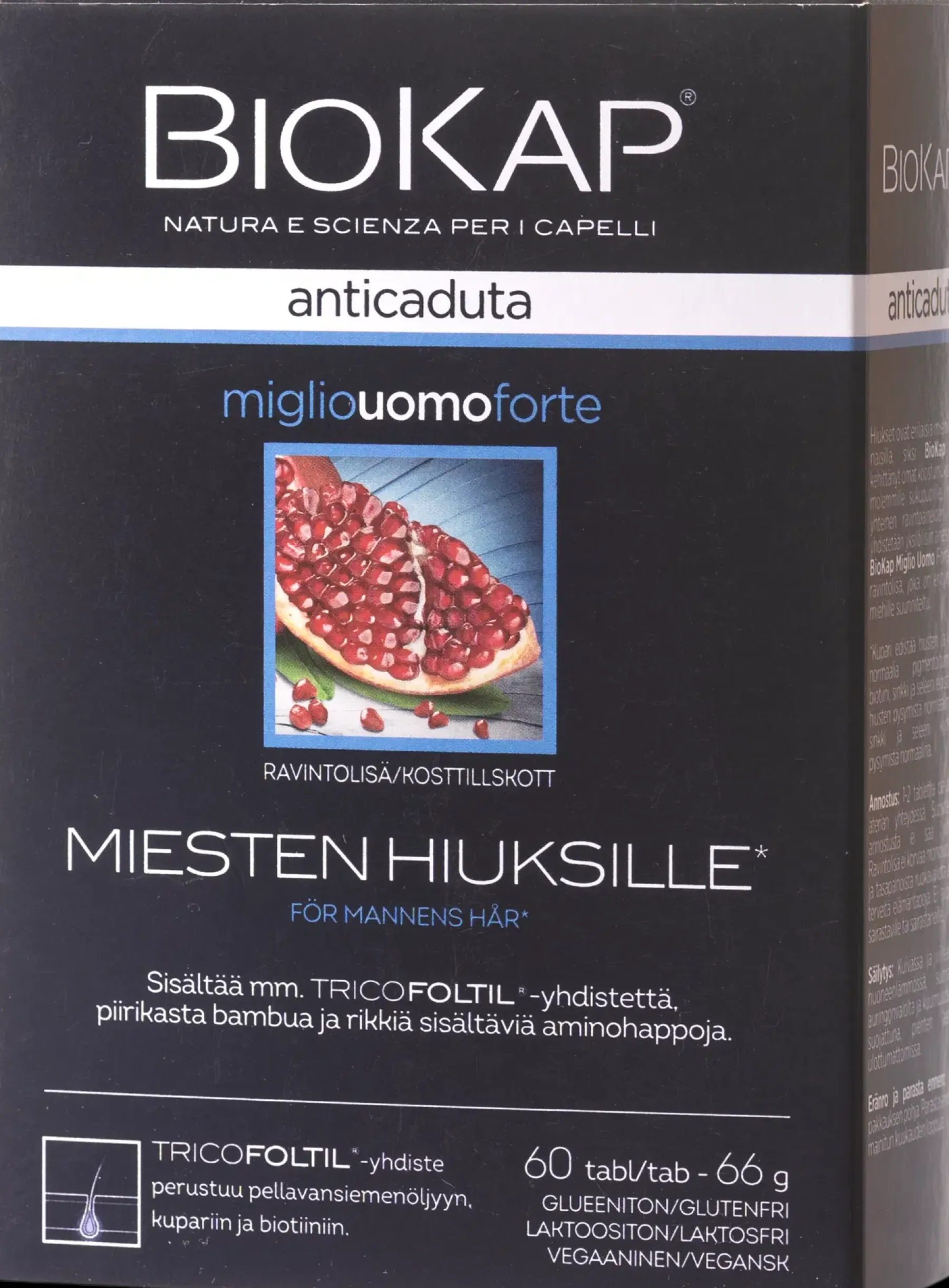 BioKap® Anticaduta Miglio Uomo Forte on erityisesti miehille kehitetty ravintolisä, joka sisältää luonnollisia ja aktiivisia ainesosia hiuksille.