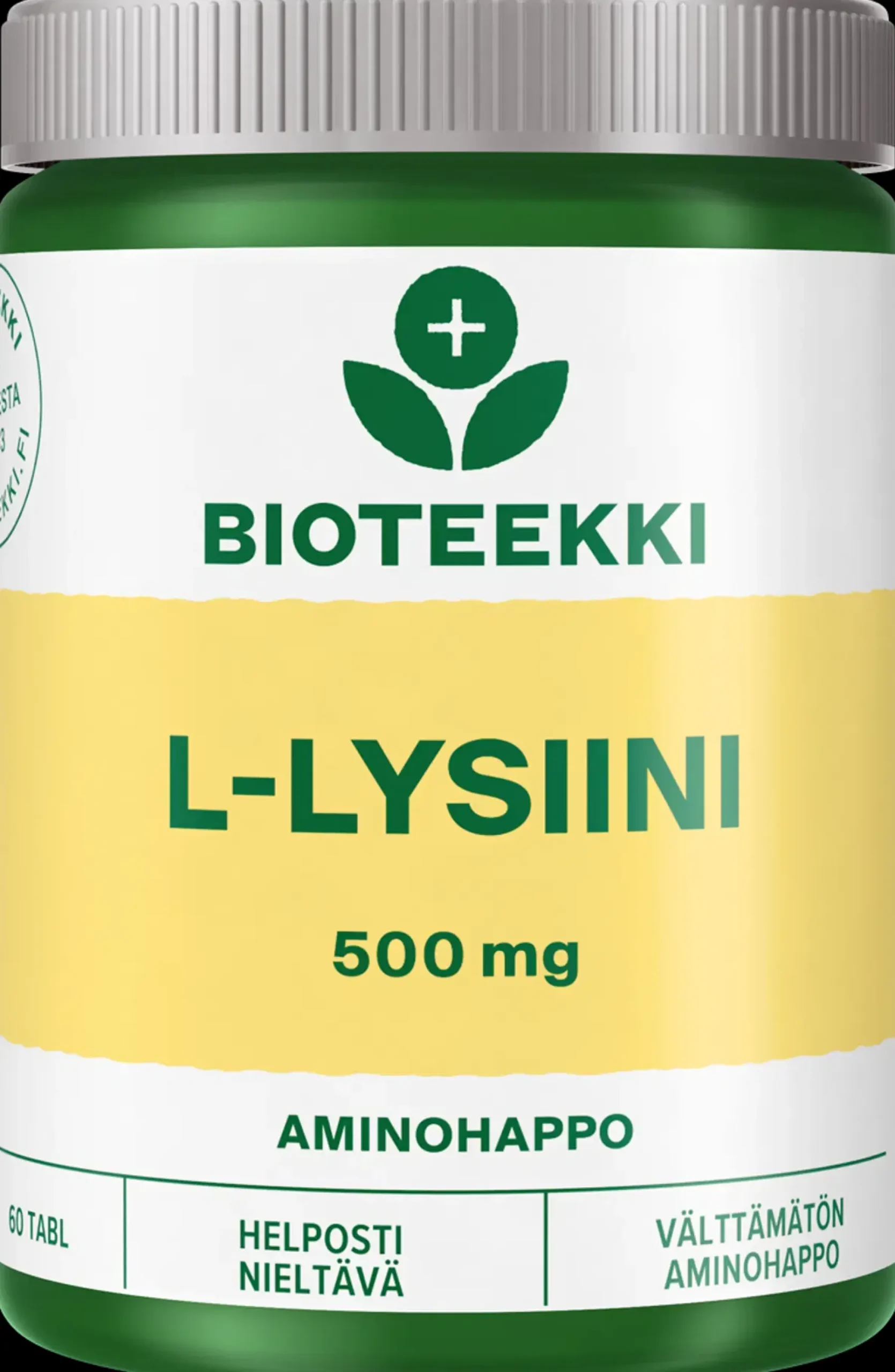 Kotimainen Bioteekki L-lysiini ravintolisä. Lysiini on ihmiselle välttämätön aminohappo, jota on saatava ravinnosta. Helposti nieltävä tabletti. Laktoositon, gluteeniton, hiivaton. Valmiste soveltuu myös vegaaneille.