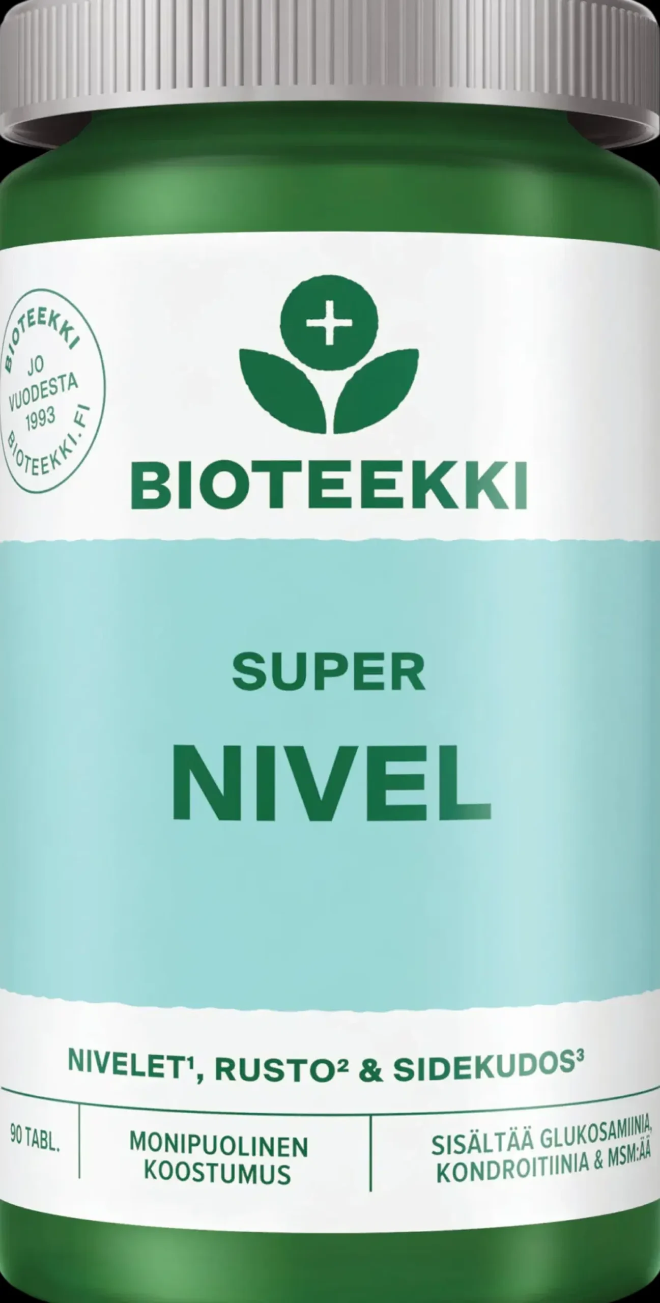Bioteekki Super Nivel on monipuolinen ja vahva valmiste nivelten hyvinvointiin. Super Nivel sisältää kahdeksan tärkeää aktiiviainetta nivelille: glukosamiini, kondroitiinisulfaatti, MSM, bosswellia-uute, C-vitamiini, inkivääriuute, kupari ja mangaani. C-vitamiini edistää normaalia kollageenin muodostumista rustojen normaalia toimintaa varten. Mangaani ja kupari edistävät sidekudoksen pysymistä normaalina. Lisäksi mangaani edistää luuston pysymistä normaalina.