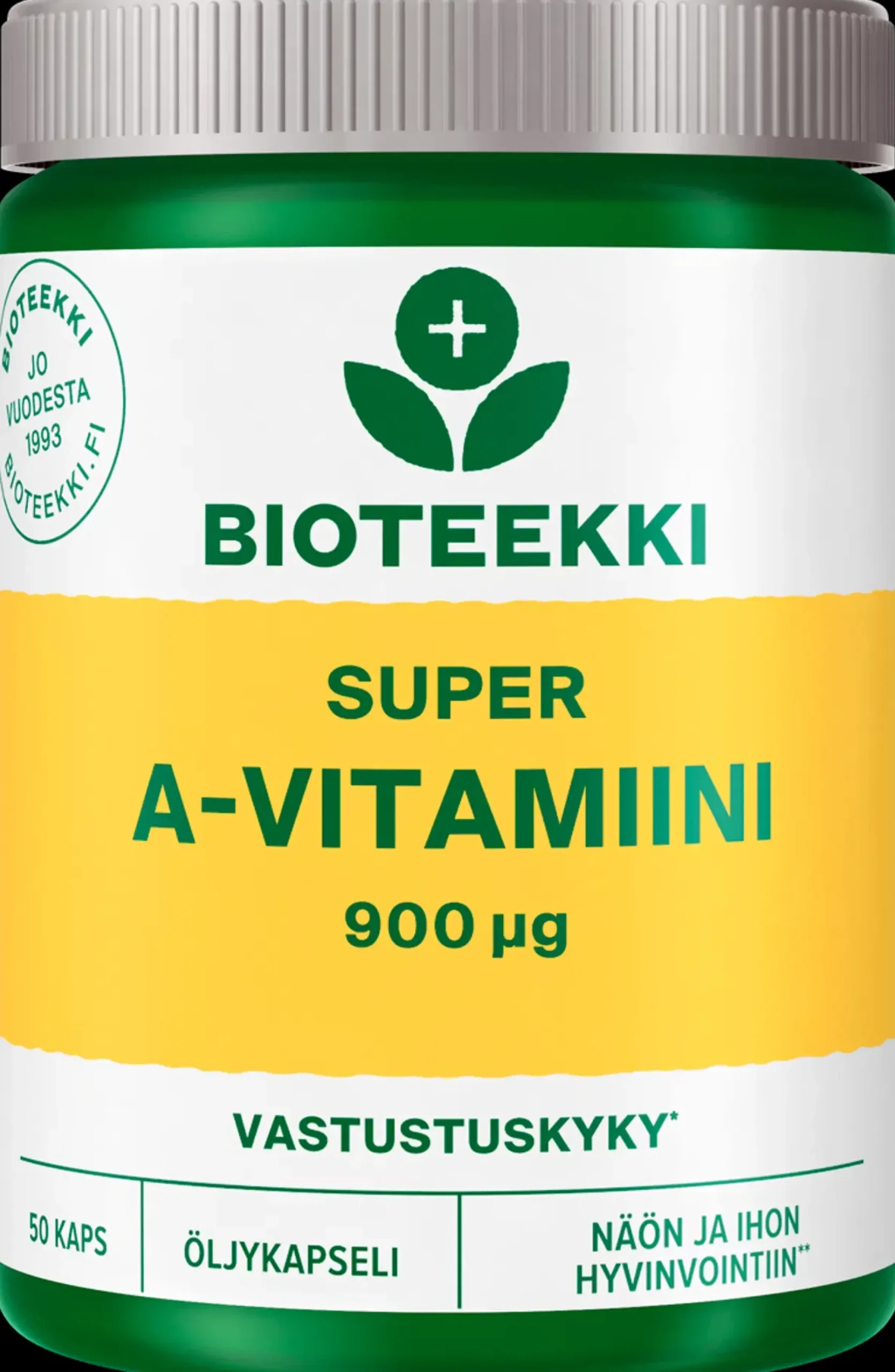 Bioteekki Super A-vitamiini on vahva A-vitamiinivalmiste silmien, limakalvojen ja ihon hyvinvointiin sekä vastustuskyvyn tueksi. Valmiste sisältää 900 µg A-vitamiinia hyvin imeytyvässä öljykapselissa. A-vitamiini edistää näön, ihon ja limakalvojen kuntoa. A-vitamiini myös edistää immuunijärjestelmän normaalia toimintaa. Tuote on laktoositon ja maidoton. Ei sisällä gluteenipitoisen viljan ainesosia. Tuotteella on Valmistettu Suomessa -Avainlippu-tunnus.