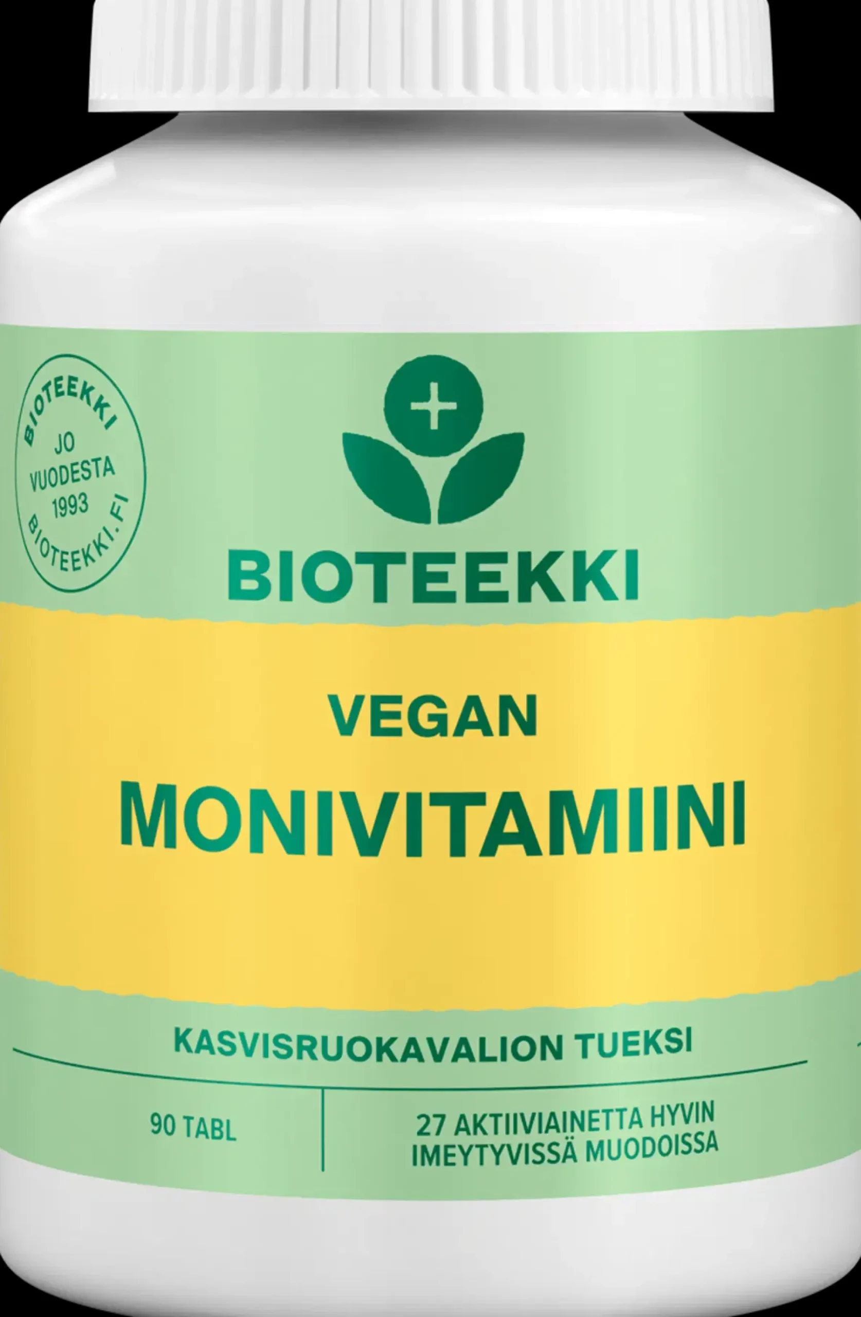 Bioteekki Vegan Monivitamiini on monipuolinen monivitamiinivalmiste, joka on suunniteltu päivittäiseen käyttöön vegaaniruokavalion tueksi. Tasapainoinen ja vahva koostumus sisältää 27 aktiiviainetta vitamiineja ja hivenaineita mm. B12-vitamiinia, kasviper
