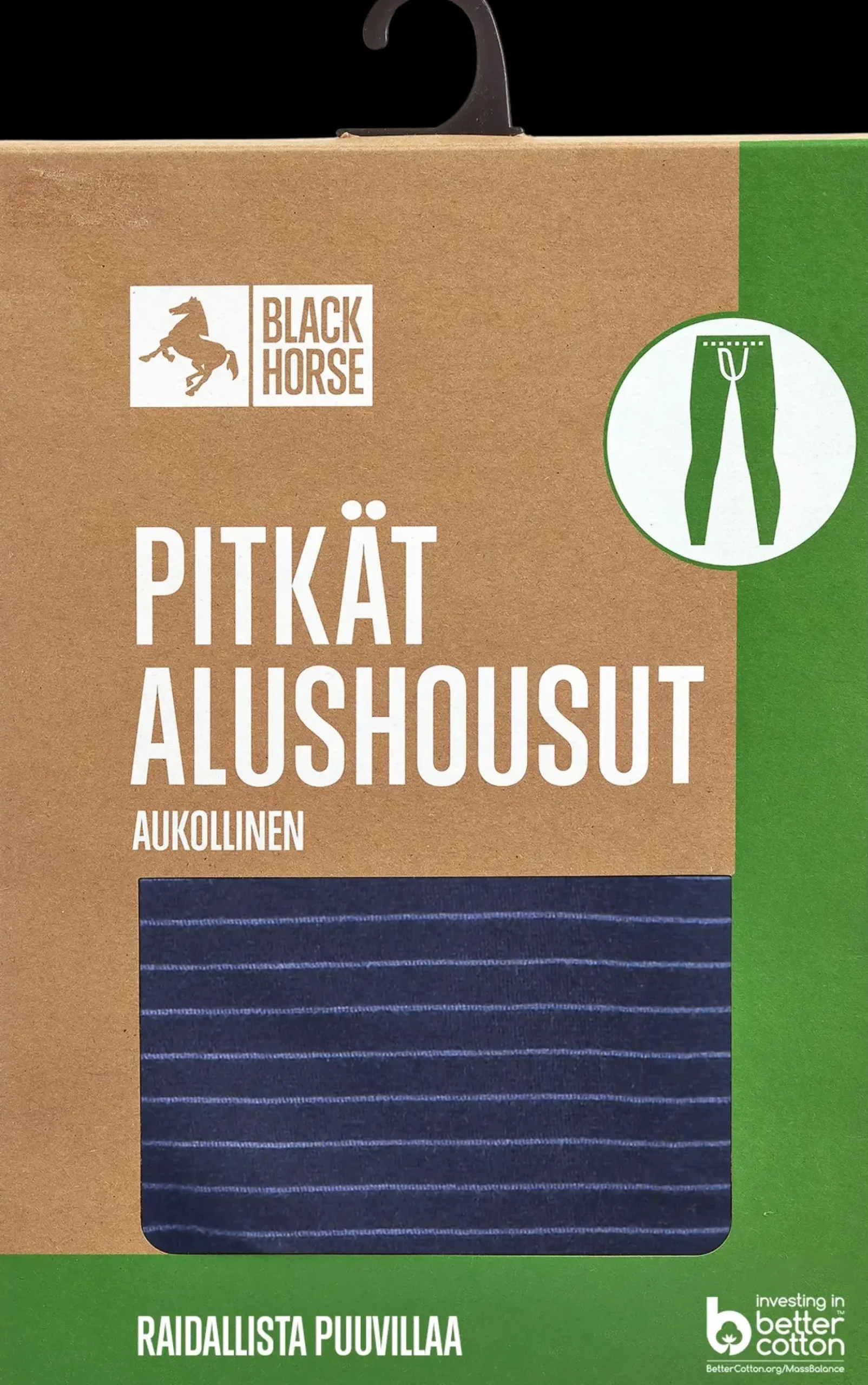 Black Horsen miesten aukolliset pitkät alushousut hillityllä raitakuosilla. Vyötärökuminauha kuminauhakujassa. Täyspitkissä lahkeissa on resorit. Ei hiertäviä tai kutittavia pesulappuja – vain täydellinen mukavuus. Materiaali on miellyttävää BCI-puuvillan ja polyesterin sekoitetta.