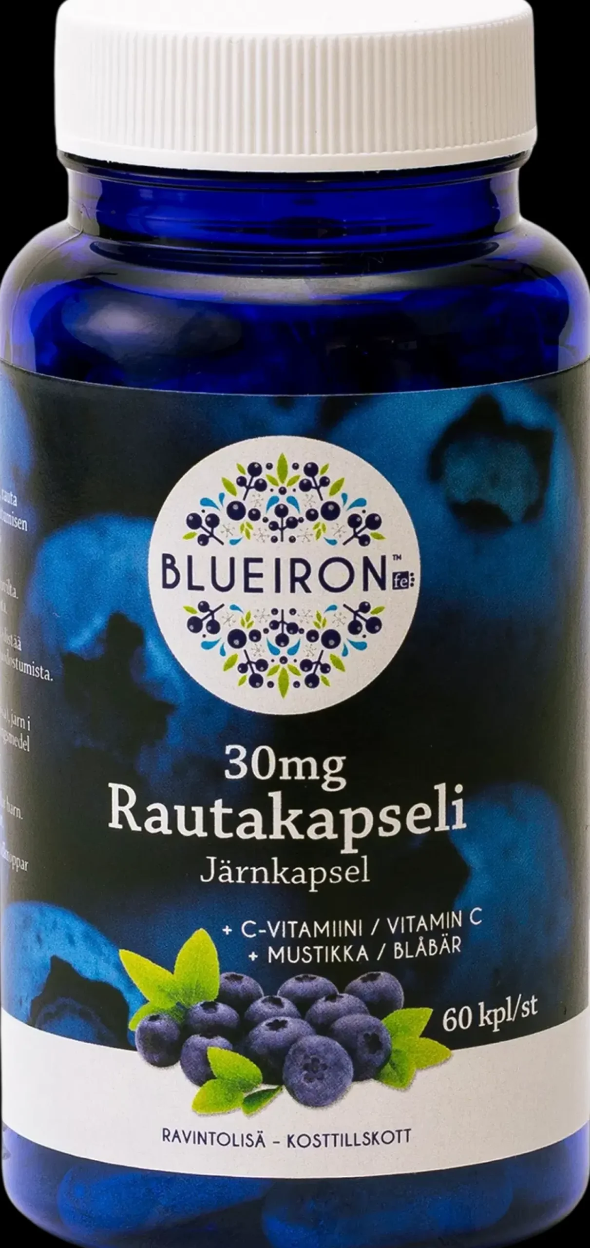 Rautaa tarvitaan lähes kaikkiin elimistön toimintoihin ja sen puute aiheuttaa monia oireita. BlueIronista saat päivittäisen rauta-annoksesi. BlueIron rautakapseli sisältää 30mg rautaa ja se on suunniteltu yleiseen käyttöön aikuisille riittävän raudan saannin turvaamiseksi.