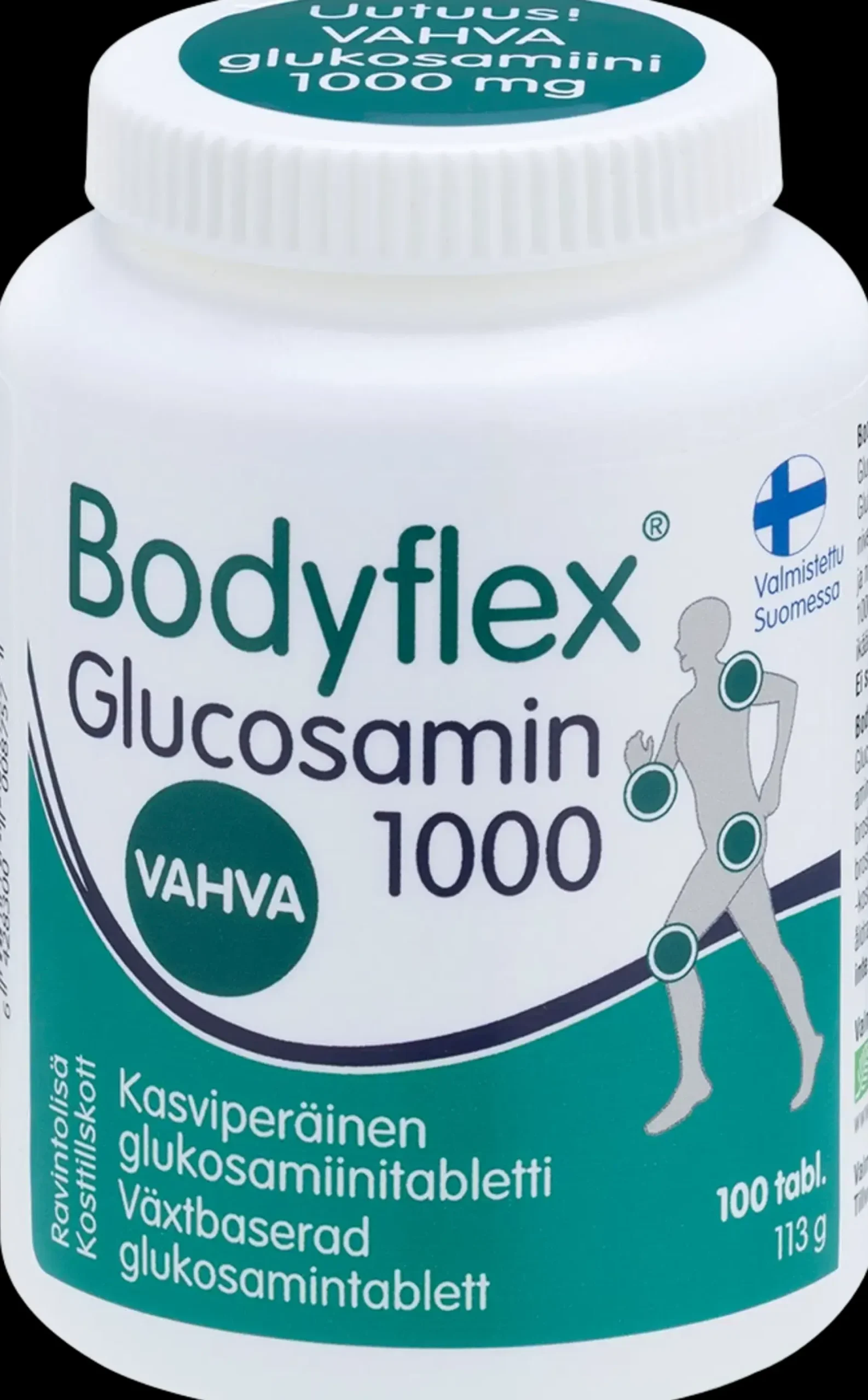 Bodyflex® Glucosamin 1000 sisältää kasviperäistä glukosamiinihydrokloridia 1000 mg/tabletti. Glukosamiini on nivelrustossa esiintyvä aine, jota on luontaisesti nivelissä, rustoissa ja selän välilevyissä. Sen pitoisuus rustoissa ja nivelissä vähentyy ikääntymisen myötä. Bodyflex® Glucosamin 1000 -ravintolisä tukee aktiivista elämäntapaa ja sopii erityisesti ikääntyville ja henkilöille, joiden nivelet altistuvat rasitukselle. Ei sisällä eläinperäisiä ainesosia. Annostus: 1 tabletti päivässä. Laktoositon, hiivaton, makeuttamaton, gluteeniton. Valmistettu Suomessa.