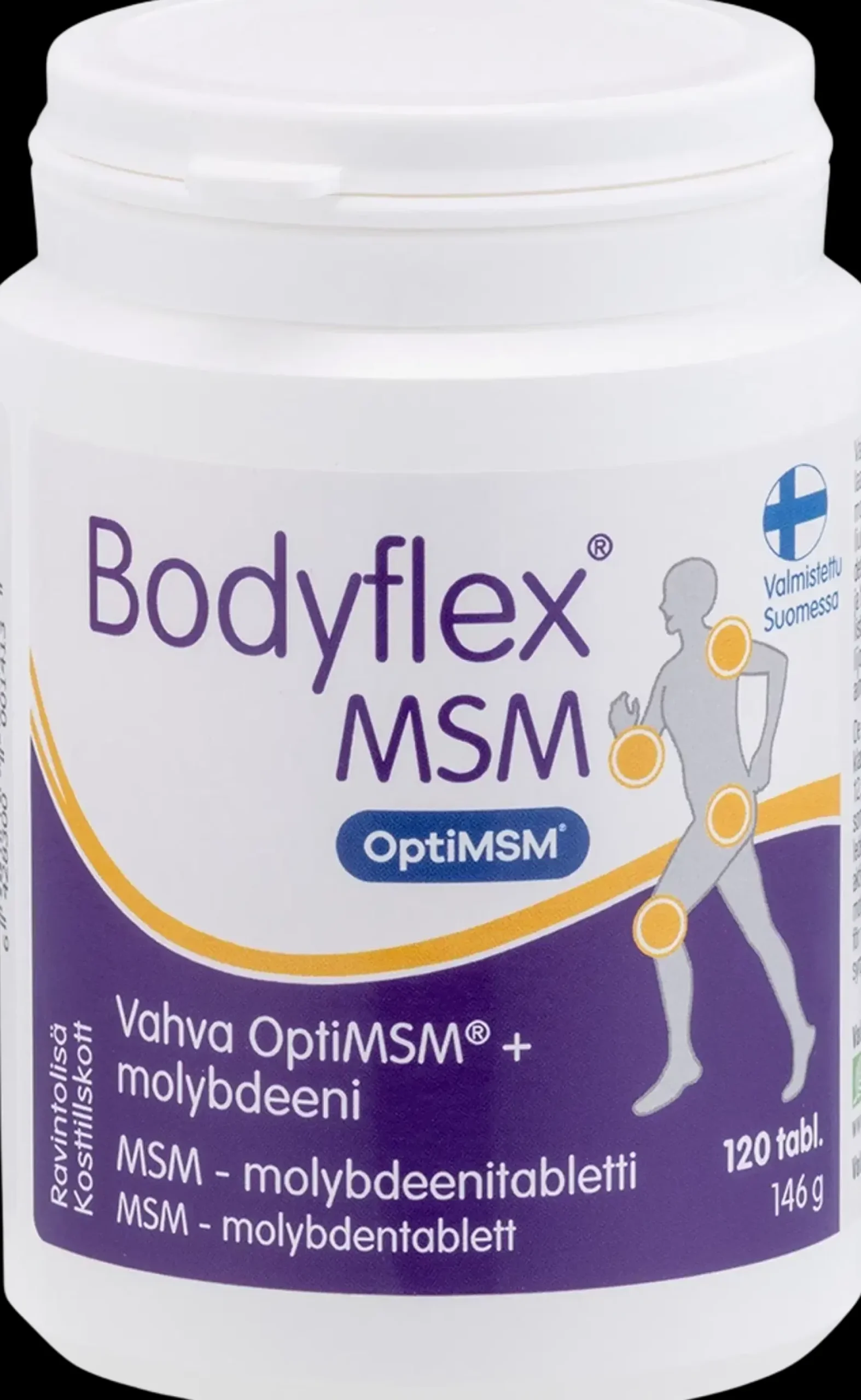 Vahvat Bodyflex MSM –tabletit sisältävät erittäin puhdasta ja korkealaatuista OptiMSM® metyylisulfonyylimetaania (MSM) 1200 mg ja 12,5 µg molybdeenia yhdessä tabletissa. MSM on orgaaninen, vesiliukoinen rikkiyhdiste, jota on luontaisesti ihmiskehossa. Sen pitoisuudet ovat korkeimmillaan erityisesti lihaksissa, nivelissä, ihossa, kynsissä ja hiuksissa. Monipuolisesti vaikuttava MSM tukee aktiivista ja terveellistä elämäntapaa ja sitä suositellaankin erityisesti urheilijoille ja kuntoilijoille osana lihashuoltoa. Molybdeeni on ihmiselle välttämätön hivenaine, joka edistää normaalia rikkiaminohappoaineenvaihduntaa. Laktoositon, hiivaton, makeuttamaton, gluteeniton. Valmistettu Suomessa.