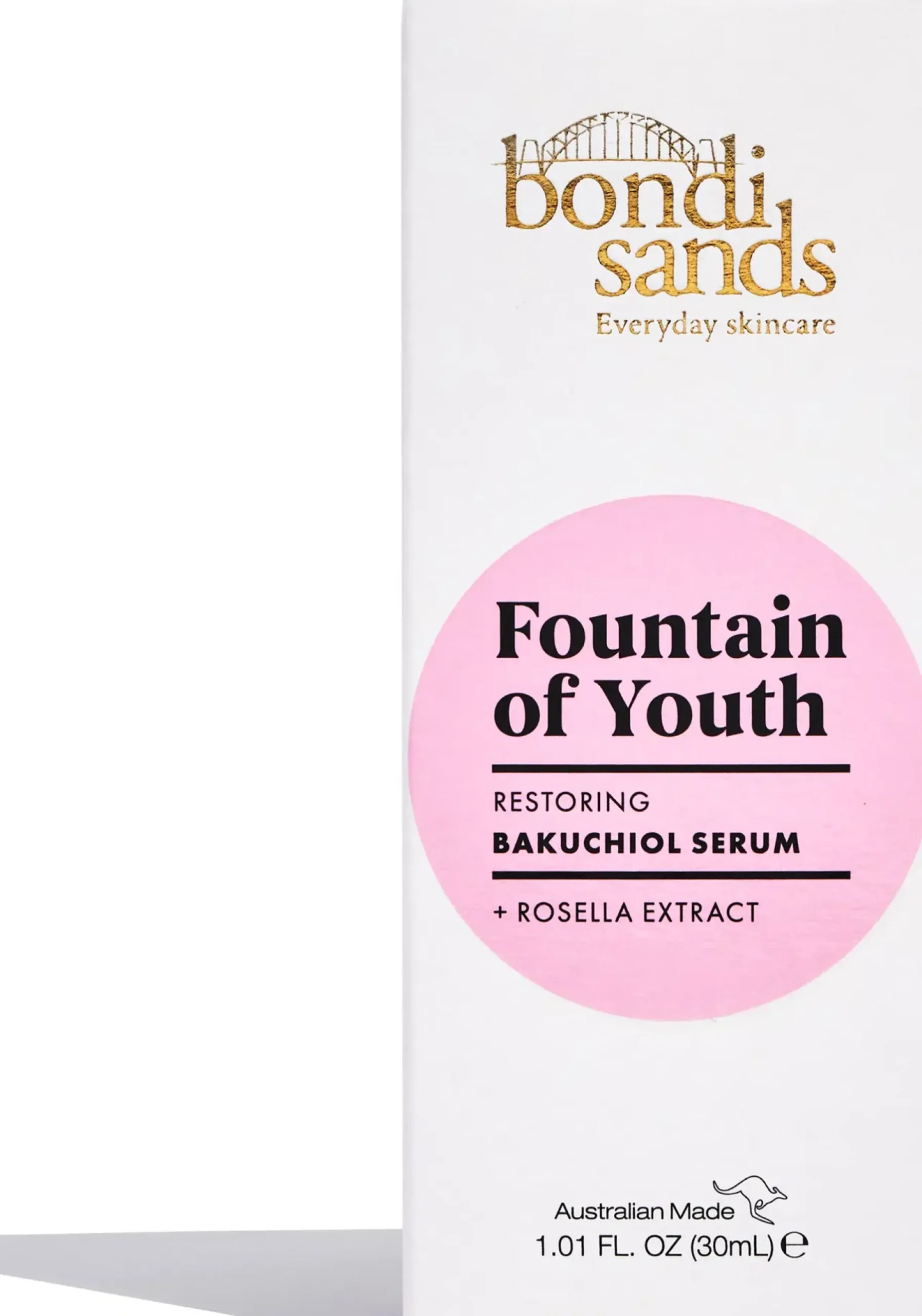Lähde matkalle Bondi Sandsin suosikkikohteeseen Fountain of Youth. Seerumi vaikuttaa juonteisiin ja ryppyihin. Bondi Sands Fountain of Youth sisältää bakuchiolia ja auringonkukka- ja ruusuliljauutetta. Yhdessä ne auttavat kosteuttamaan ihoa sekä häivyttämään pigmenttimuutoksia, juonteita ja ryppyjä.