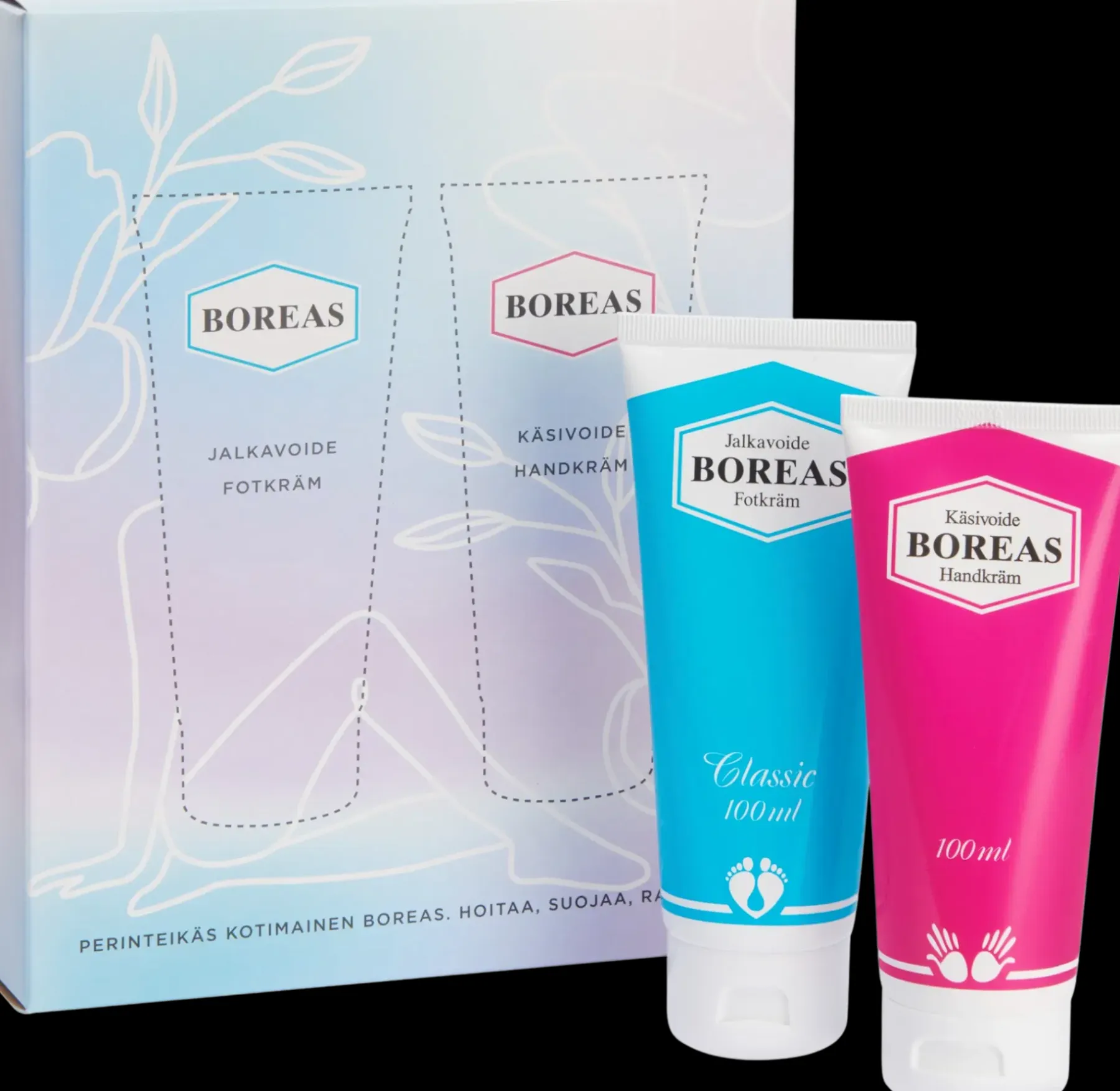 Boreas Lahjapakkaus sisältää käsivoiteen 100 ml ja jalkavoiteen 100 ml. Jalkavoide virkistää väsyneitä jalkoja, pehmittää karheaa ihoa ja ennaltaehkäisee kovettumien muodostumista. Kärsitkö suonenvedosta, kylmistä tai kuumottavista jaloista? Voiteen kamferi laskee turvotusta ja viilentää kuumottavia jalkoja. Lisäksi voiteen pintaverenkiertoa parantava ominaisuus lämmittää kylmiä jalkoja. Kosteuttavat kasviöljyt tekevät jalkojen ihosta pehmeän ja hyvinvoivan. Boreas Käsivoide sisältää ihoa rauhoittavaa aloe veraa, ksylitolia ja glyserolia. Auringonkukka- ja manteliöljy antavat pitkäkestoisen suojan ja pehmentävät käsien karheaa ihoa sekä tekevät ihosta luonnollisen pehmeän ja kimmoisan. Voide tuoksuu virkistävän raikkaalta.