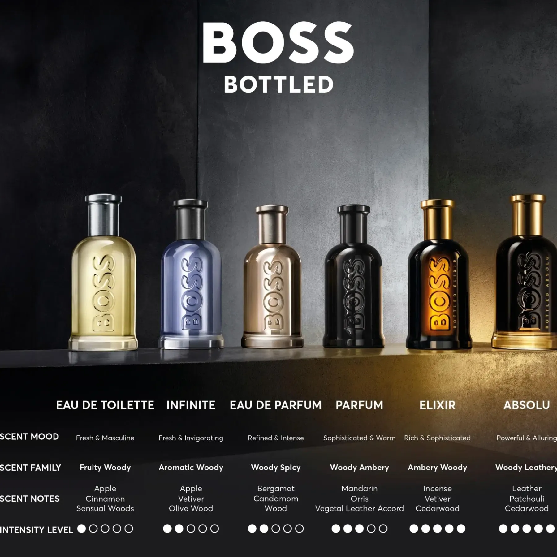 BOSS-mies on valmis menestymään – kilpailukykyinen, motivoitunut ja kunnianhimoinen. Hänen päivittäiset valmistautumisrituaalinsa ovat olennainen osa hänen henkilökohtaista menestyksen tavoitteluaan ja BOSS Bottled Eau de Toilette for Men on tullut vakiintuneeksi osaksi hänen jokapäiväistä varustustaan.