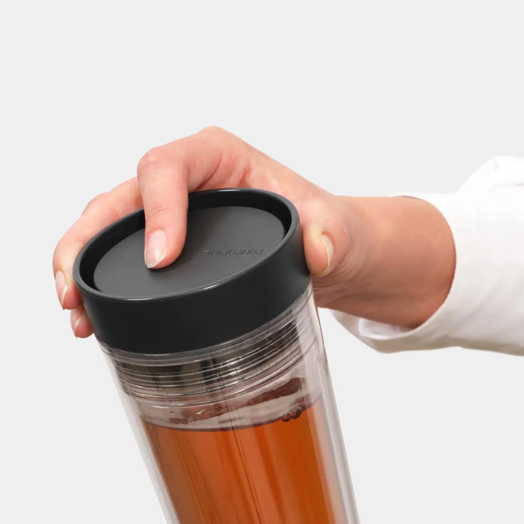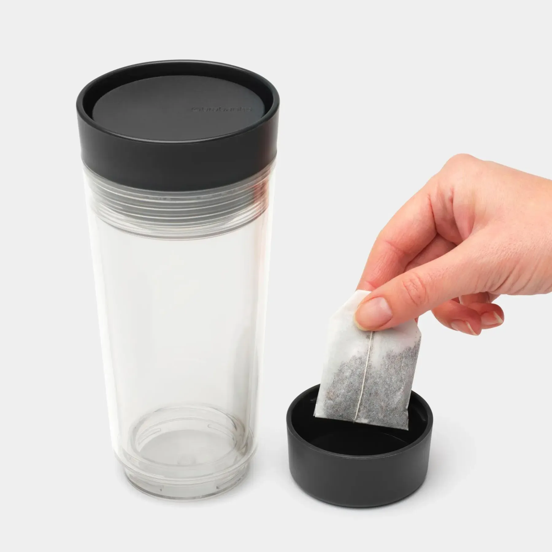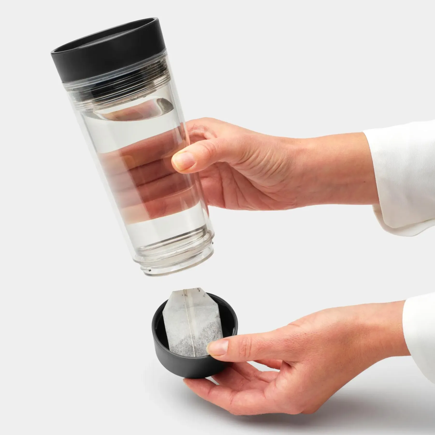 Teehetki tien päällä. Juo vastakeitetty teesi töissä, koulussa, junassa tai missä tahansa haluat tämän Brabantia Make & Take matkateemukin avulla. Täytä se vain kuumalla tai jäisellä vedellä ja pidä se lämpimänä jopa 1,5 tuntia tai kylmänä jopa 3 tuntia*. Yllätys, voit säilyttää suosikkiteepussisi piilolokerossa. Älykäs napsautuskansi avautuu ja sulkeutuu helposti yhdellä kädellä, ja juot siitä aivan kuten mistä tahansa muusta mukista. Muki kiinnittyy helposti reppusi sivutaskuun tai autosi mukitelineeseen. Ja ei huolta läikkymisestä – tässä kupissa on vuotamaton tiiviste. Mennään!