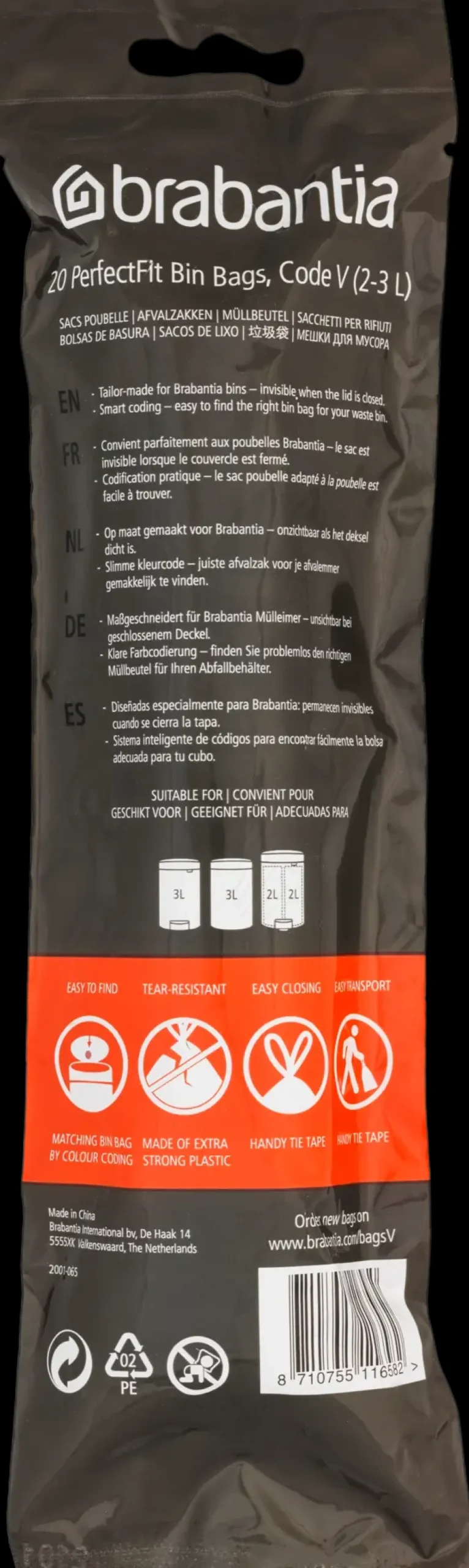 Erinomainen ulkoasu, täydellinen sopivuus. Brabantia PerfectFit -roskapussit sopivat täydellisesti Brabantia-roska-astiaasi ja kiireiseen elämääsi. Siksi ne ovat erittäin vahvoja ja niissä on kätevä lenkki, jolla suljet pussin! Vedä vain siitä irrottaaksesi pussin roskakorista ja sulje se. Etkö ole varma, mitä kokoa tarvitset? Tarkista vain roskakorin kannen sisäpuolella oleva värikoodi. Erinomaiset roskapussit, jotka sopivat Brabantia-roska-astiaan täydellisesti.