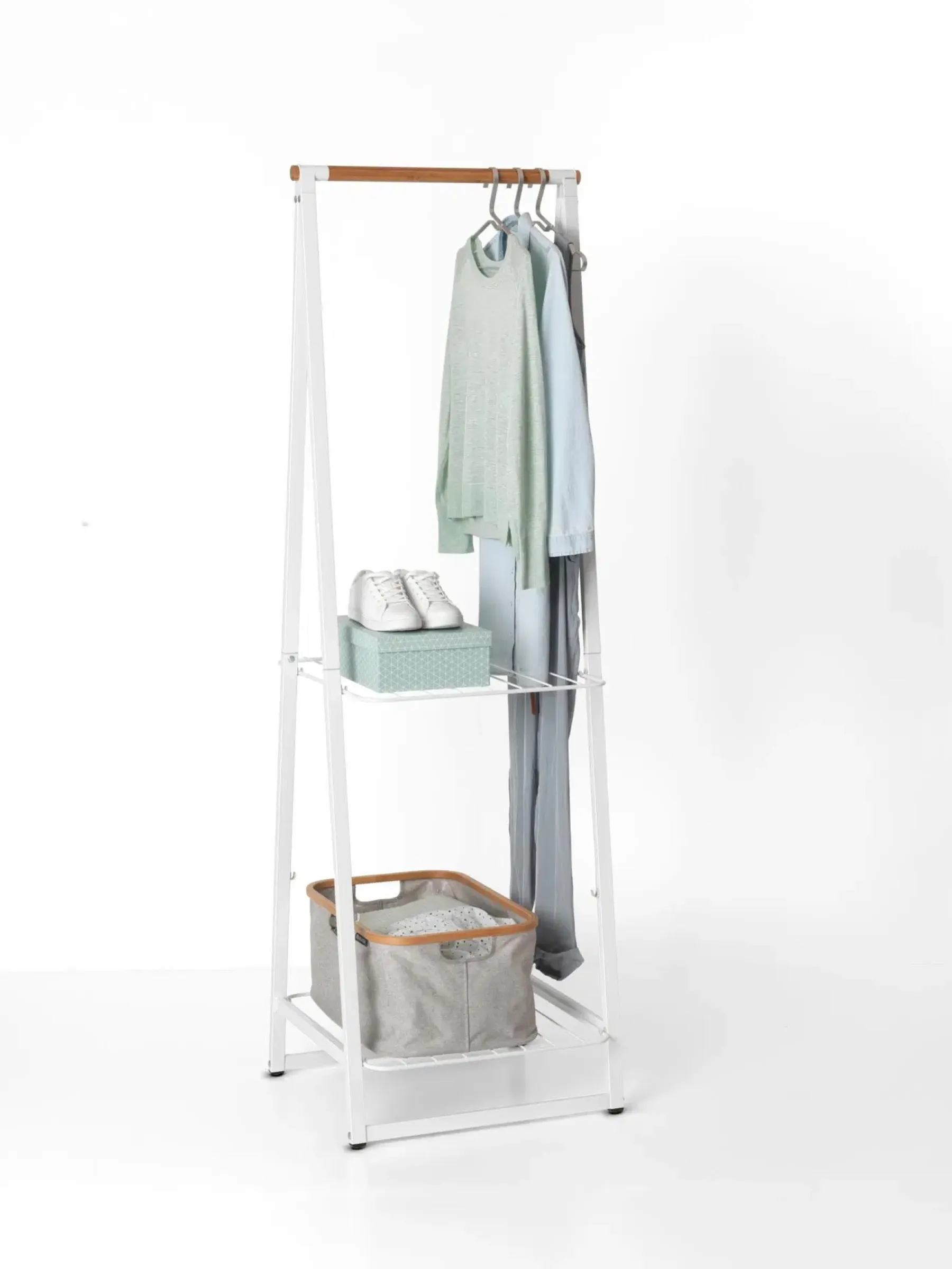 Erinomainen pieni teline. Järjestä vaatteesi kauniisti Linn-vaatetelineellä. Tämä itsenäinen vaateteline vahvalla bambusta valmistetulla poikkipuulla ja kahdella korkeussäädettävällä hyllyllä on omiaan kodissa kuin kodissa. Käytä Linn-vaatetelinettä vaatteiden ympäristöystävälliseen kuivaamiseen tai tuuleta vaatteitasi tyylikkäästi ripustamalla ne tukevaan tankoon. Tarvitsetko tyylikästä säilytystilaa? Linn auttaa sinua mielellään. Täydellinen makuuhuoneeseen, kodinhoitohuoneeseen tai eteiseen! Monikäyttöinen – tukeva bambusta valmistettu poikkipuu vaatteiden ripustamiseen, tuulettamiseen tai kuivaamiseen.Ripustustilaa – kahta päätytankoa voidaan käyttää esimerkiksi hattujen tai laukkujen ripustamiseen.Sopii mainiosti pyykkien kuivaamiseen tai esimerkiksi kenkien, vaatteiden ja laukkujen säilytykseen – kaksi korkeussäädettävää hyllyä.Säästää tilaa – kätevä teline, johon mahtuu jopa 16 ripustettua ja viikattua vaatetta.Älykästä säilytystä – pitkät vaatteet voidaan ripustaa tankoihin.Vakaa ja tukeva – säädettävät liukumattomat jalat.Helppo koota – mukana vaiheittaiset ohjeet, kiinnitysmateriaalit ja työkalu.Ongelmaton käyttää – 5 vuoden Brabantia-takuu ja huolto.Ympäristöystävällinen – Cradle-to-Cradle® sertifikaatti, Hopea tasolla.