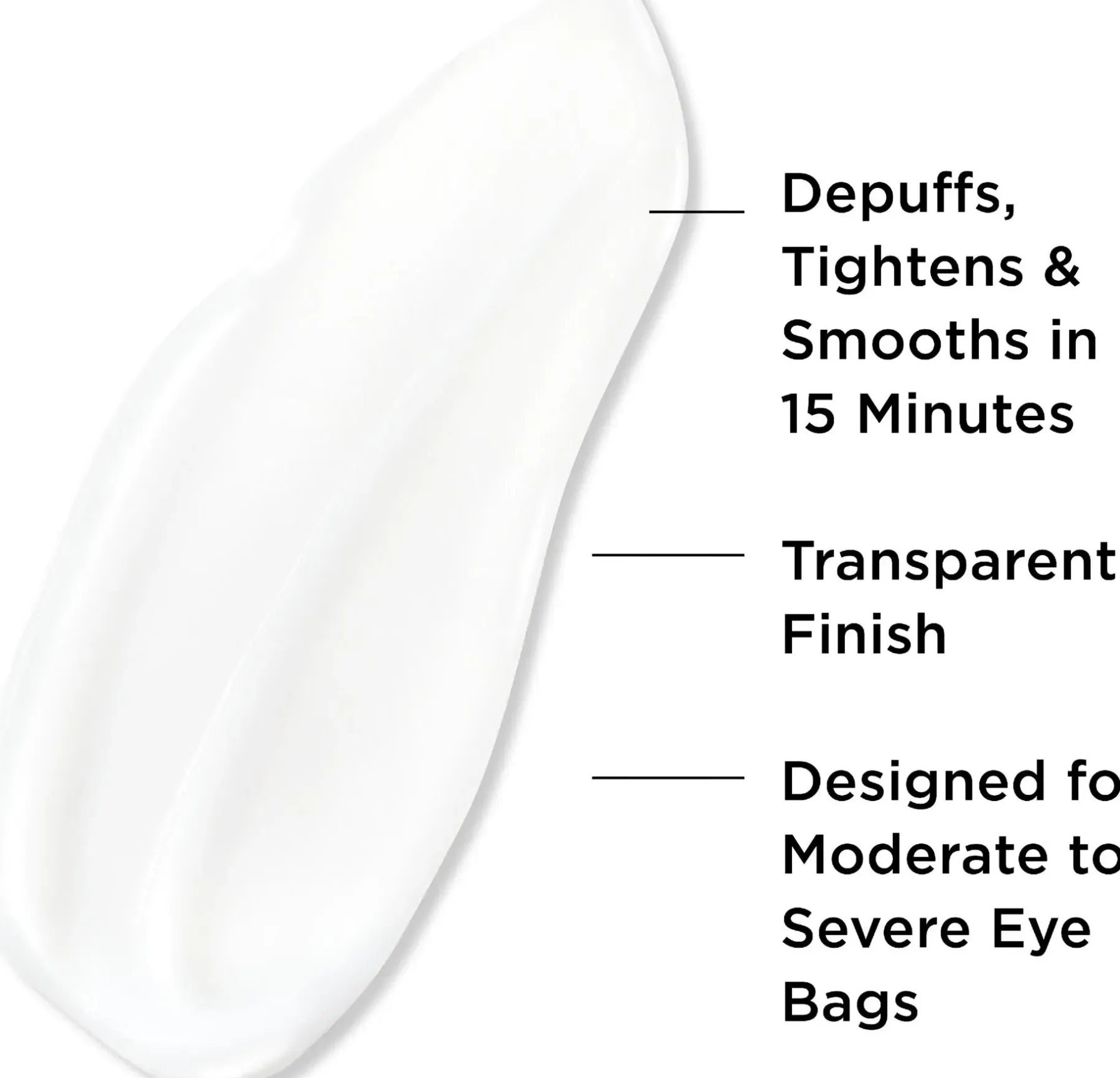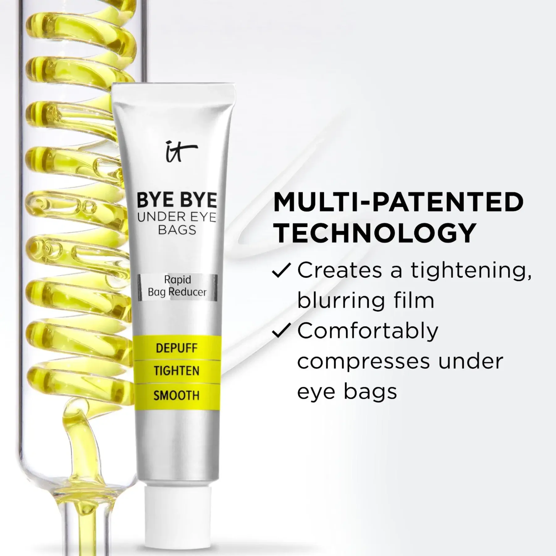 Välittömästi tasoitetut ja kohotetut silmänaluset! Silmäpusseja häivyttävä vaikutus vain 15 minuutissa Bye Bye Under Eye Bags Treatment -silmänympäryshoitotuotteella, joka on väliaikainen ratkaisu silmäpussien turvotuksen vähentämiseen ja kiinteytykseen. Sano hyvästit turvotukselle, silmäpusseille ja väsyneen näköiselle silmänympärysiholle ja paljasta dramaattinen silmänympärysihon muutos.