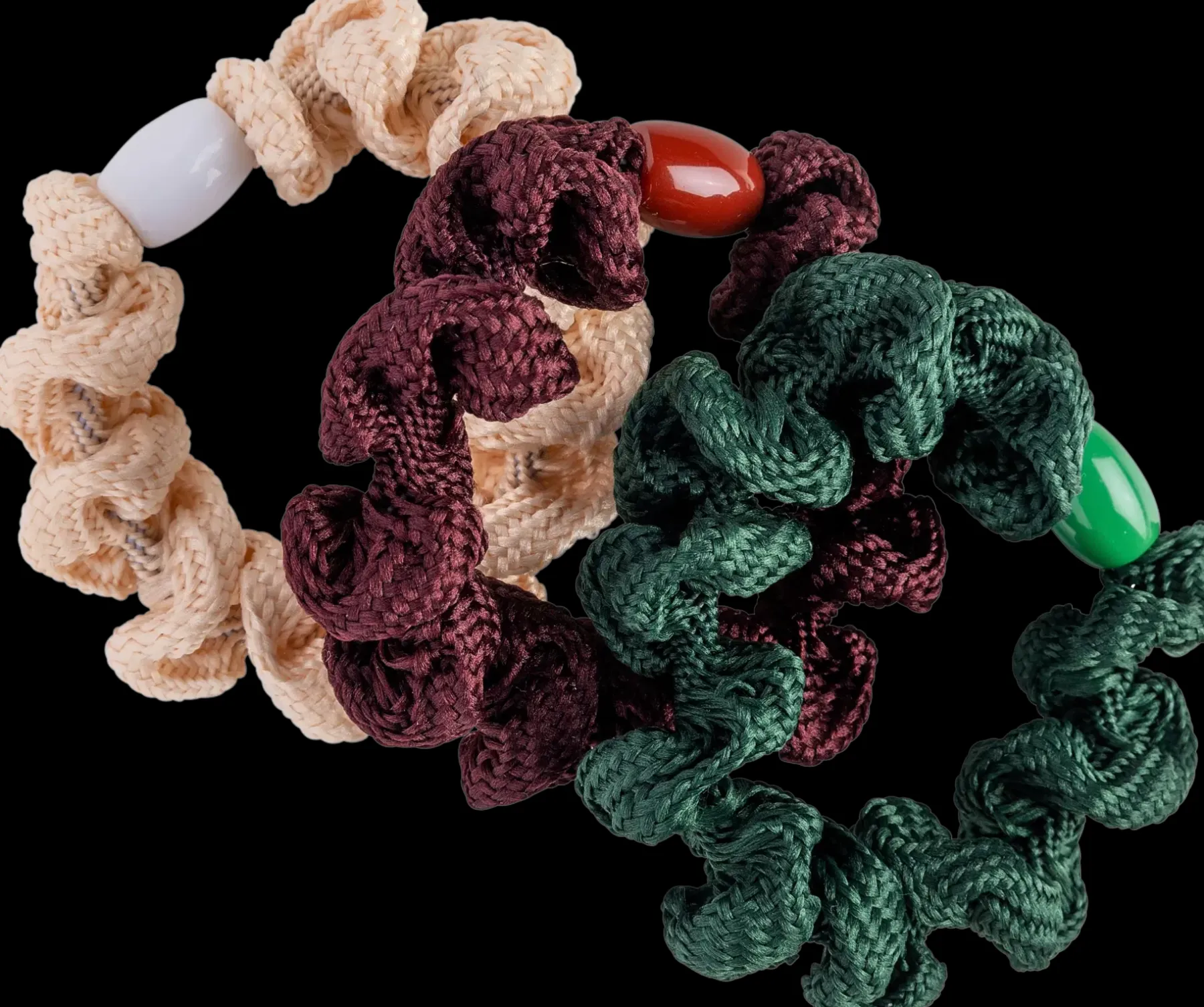 Trendikkäät kierrehiuslenkit. Setissä kolme kappaletta beigen, viininpunaisen ja vihreän värisiä hiuslenkkejä. Hiuslenkin halkaisija n. 6 cm.