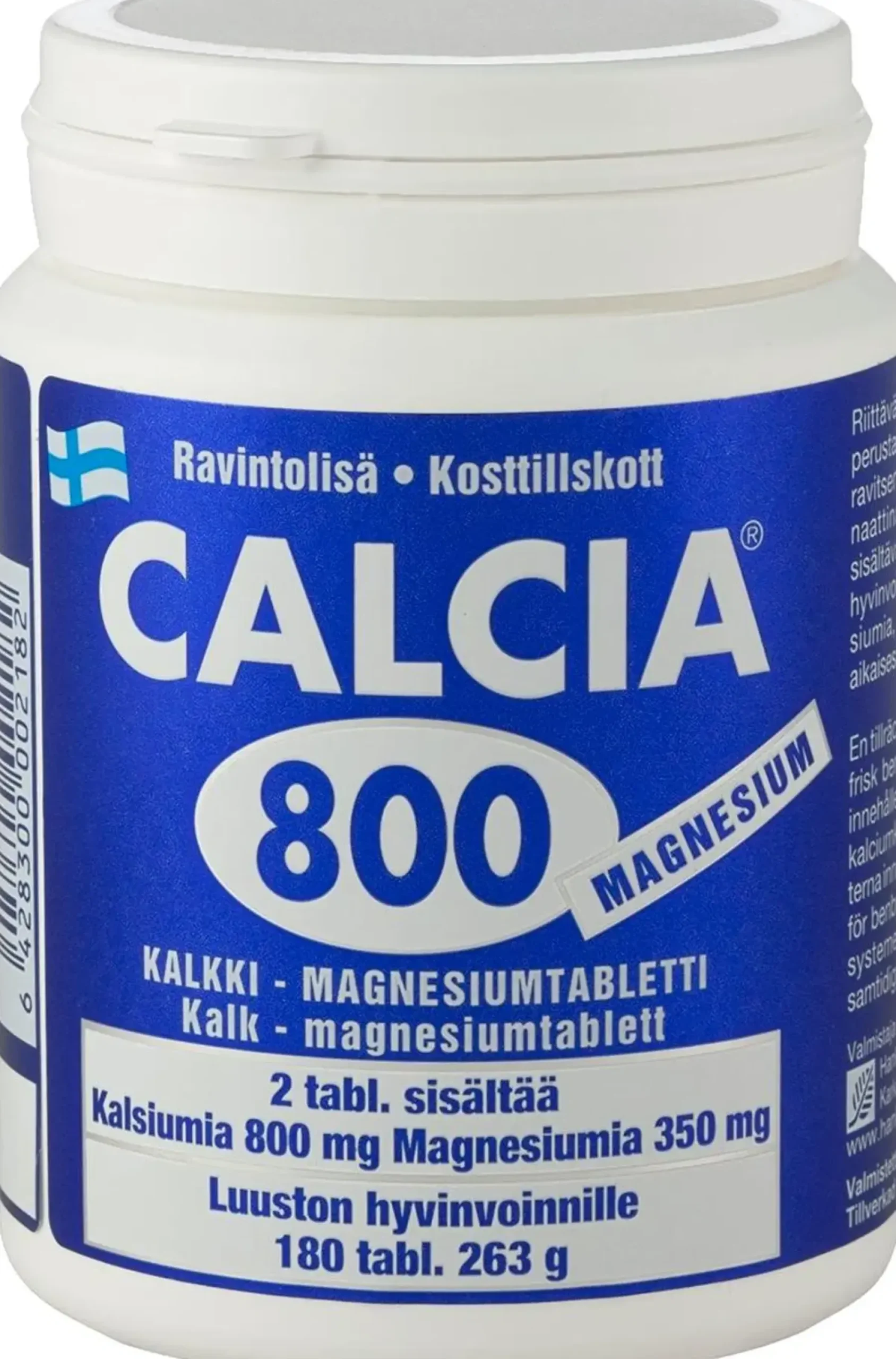 Riittävä kalkin (kalsiumin) saanti on terveen luuston perusta. Calcia 800 Magnesium -tabletissa kalkki on ravitsemuksellisesti helppoliukoisena kalsiumkarbonaattina, joka on luonnon oma mineraali. Tabletit sisältävät luuston, hampaiden, lihasten ja hermoston hyvinvoinnille välttämättömätöntä kalkkia ja magnesiumia, joita on tärkeää saada ravinnosta samanaikaisesti. Annostus: 2 tablettia päivässä. Laktoositon, hiivaton, makeuttamaton, gluteeniton. Valmistettu Suomessa.