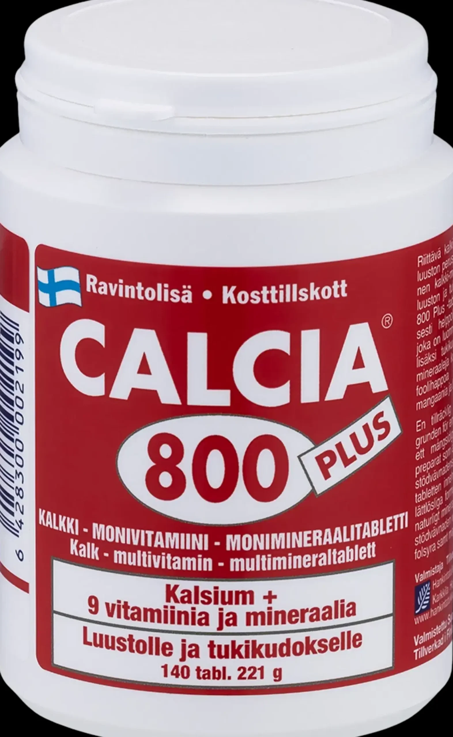 Riittävä kalkin (kalsiumin) saanti on terveen luuston perusta. Calcia 800 Plus on monipuolinen kalkki-monivitamiini-monimineraalivalmiste luuston ja tukikudoksen hyvinvoinnille. Calcia 800 Plus -tabletissa kalkki on ravitsemuksellisesti helppoliukoisena kalsiumkarbonaattina, joka on luonnon oma mineraali. Tuote sisältää lisäksi tukikudokselle tärkeitä vitamiineja ja mineraaleja kuten B6-, C-, D- ja K-vitamiinia, foolihappoa , magnesiumia, sinkkiä, mangaania ja booria. Annostus: 2 tablettia päivässä. Laktoositon, hiivanton, makeuttamaton, gluteeniton. Valmistettu Suomessa.