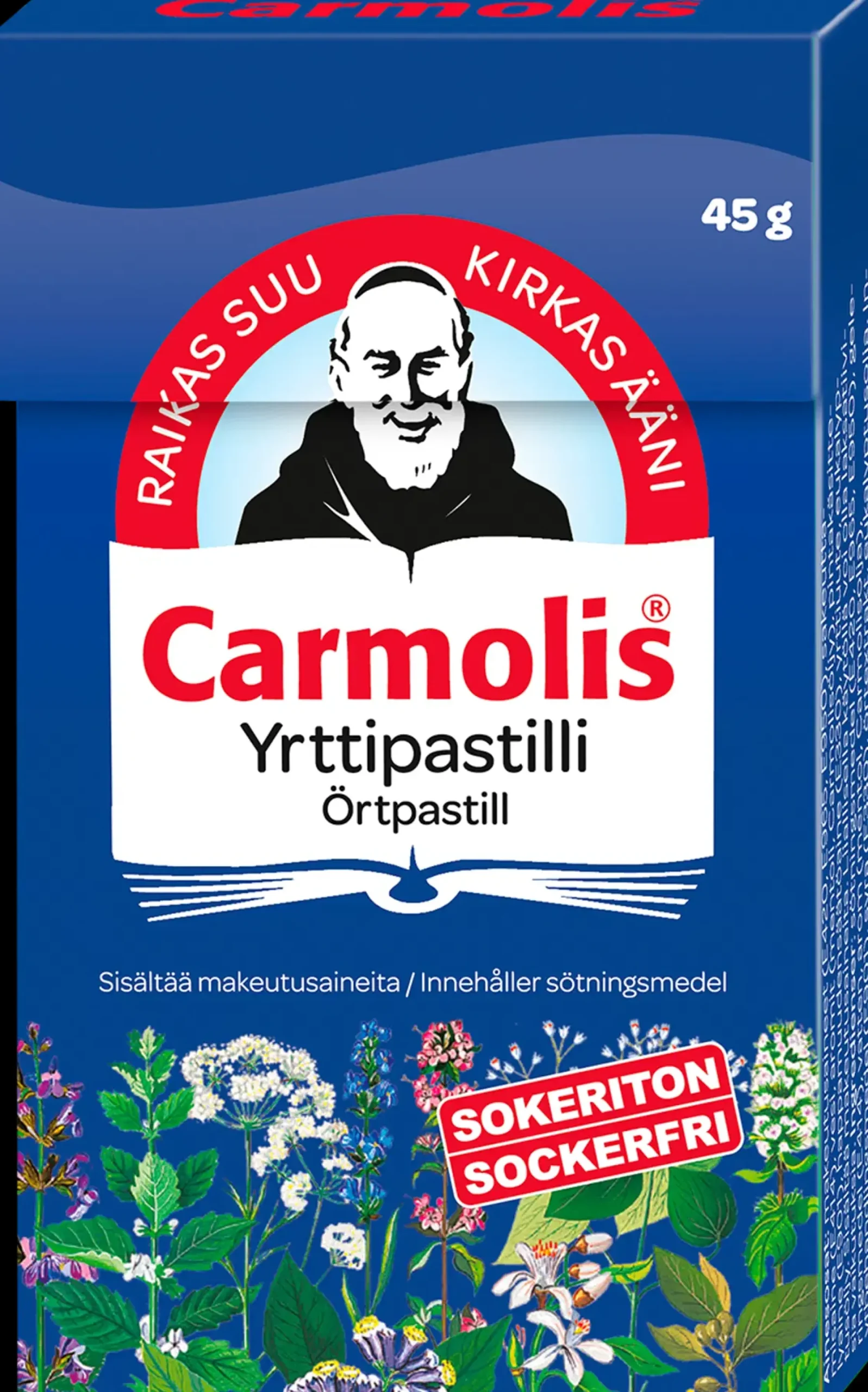 Sokeriton Carmolis yrttipastilli tuo kaivattua helpotusta käheälle kurkulle ja tukkoiselle nenälle. Vahva yrttipastilli raikastaa hengityksen ja kirkastaa äänen. Pehmeä pastilli on helppo pitää suussa myös puhuessa.