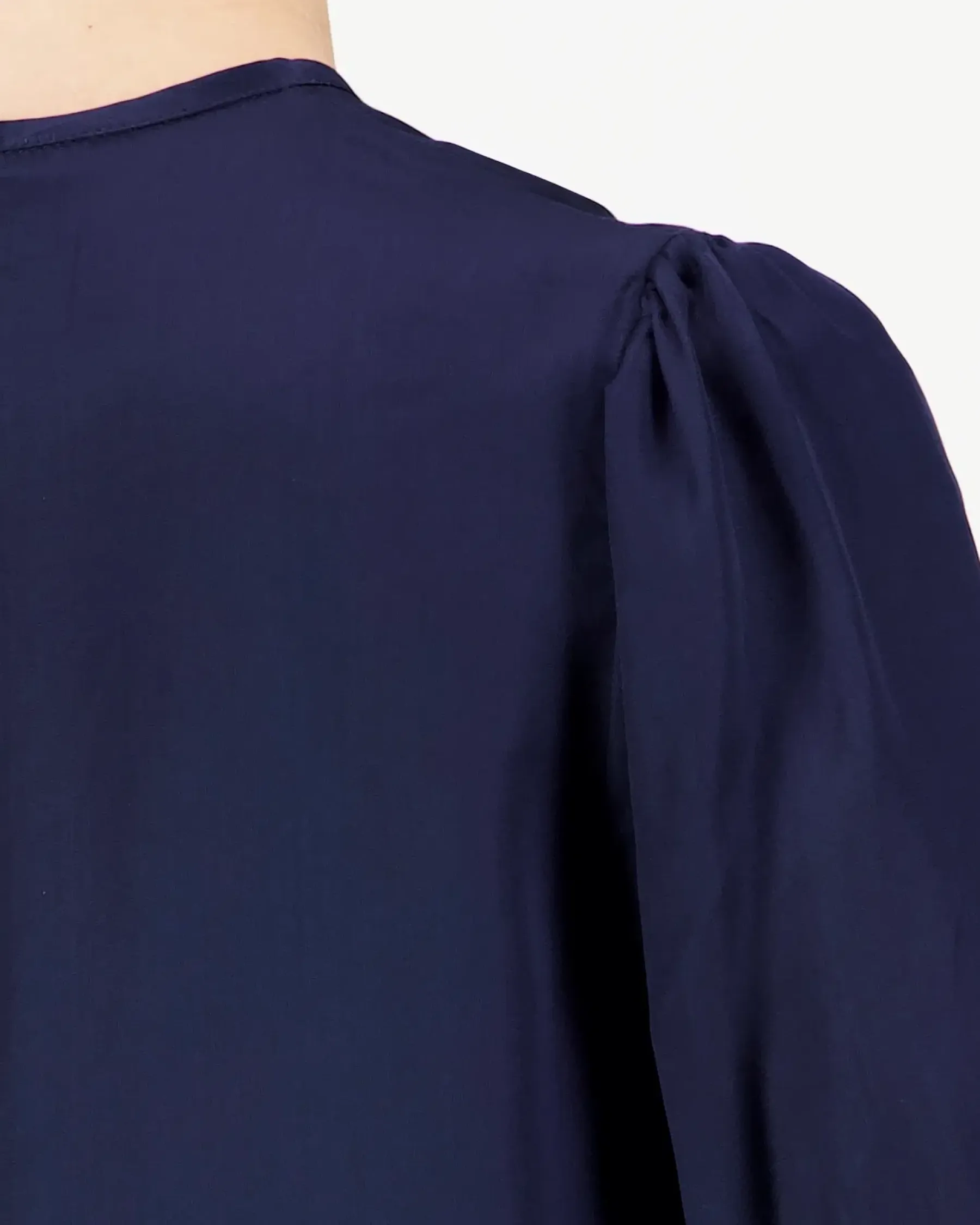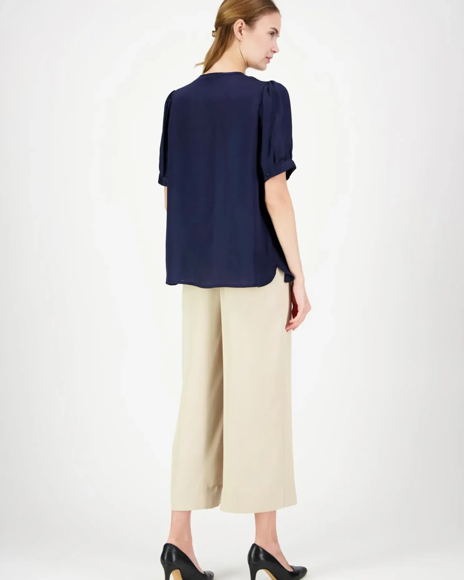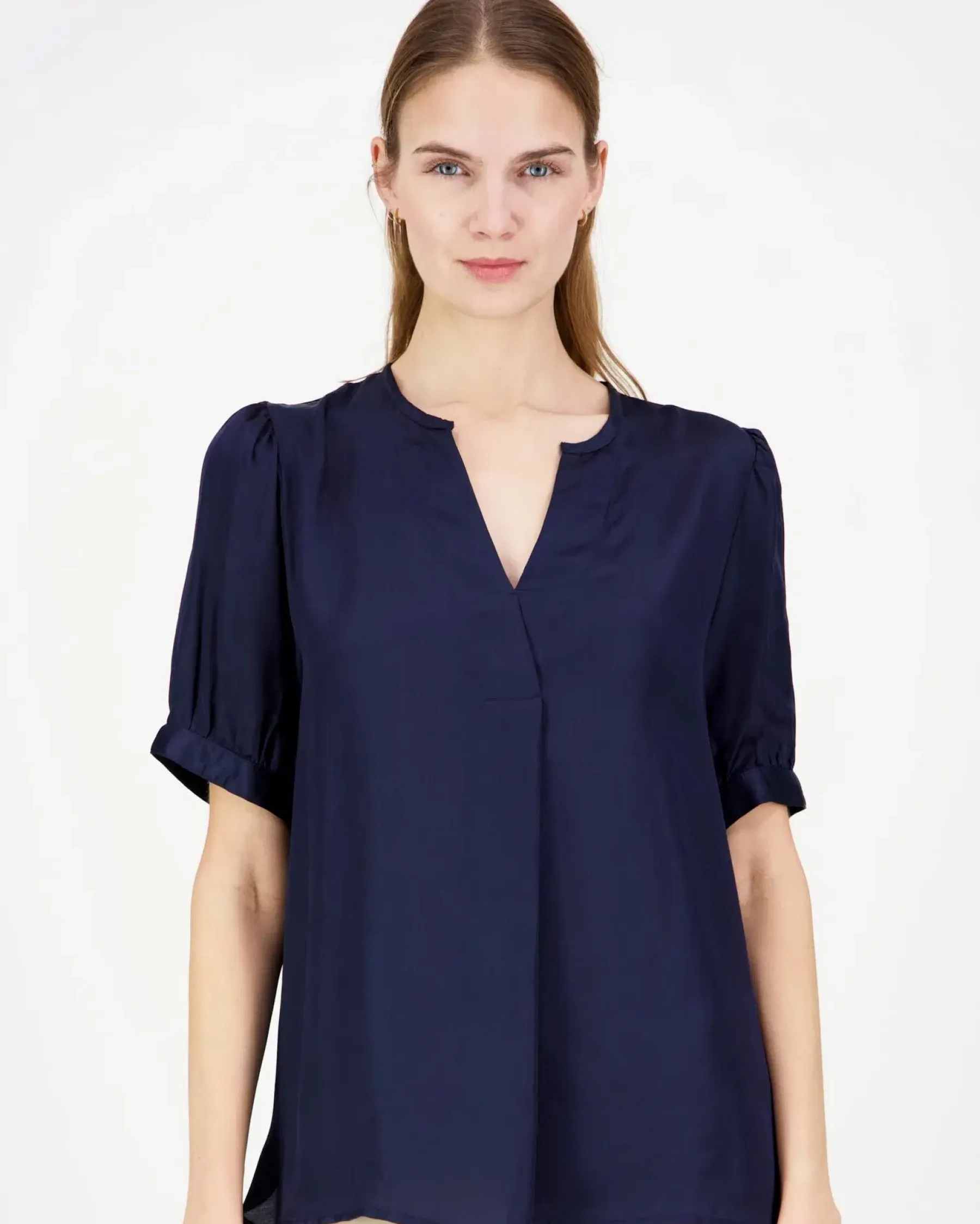 Satiiniviskoosinen, päänpäältä puettava pusero lyhyillä hihoilla ja pyöristetyllä helmalla. Puserossa on v-pääntie. Etuosalla kauniisti laskeutuva laskos.Hihansuilla takaosassa nappikiinnitys.
