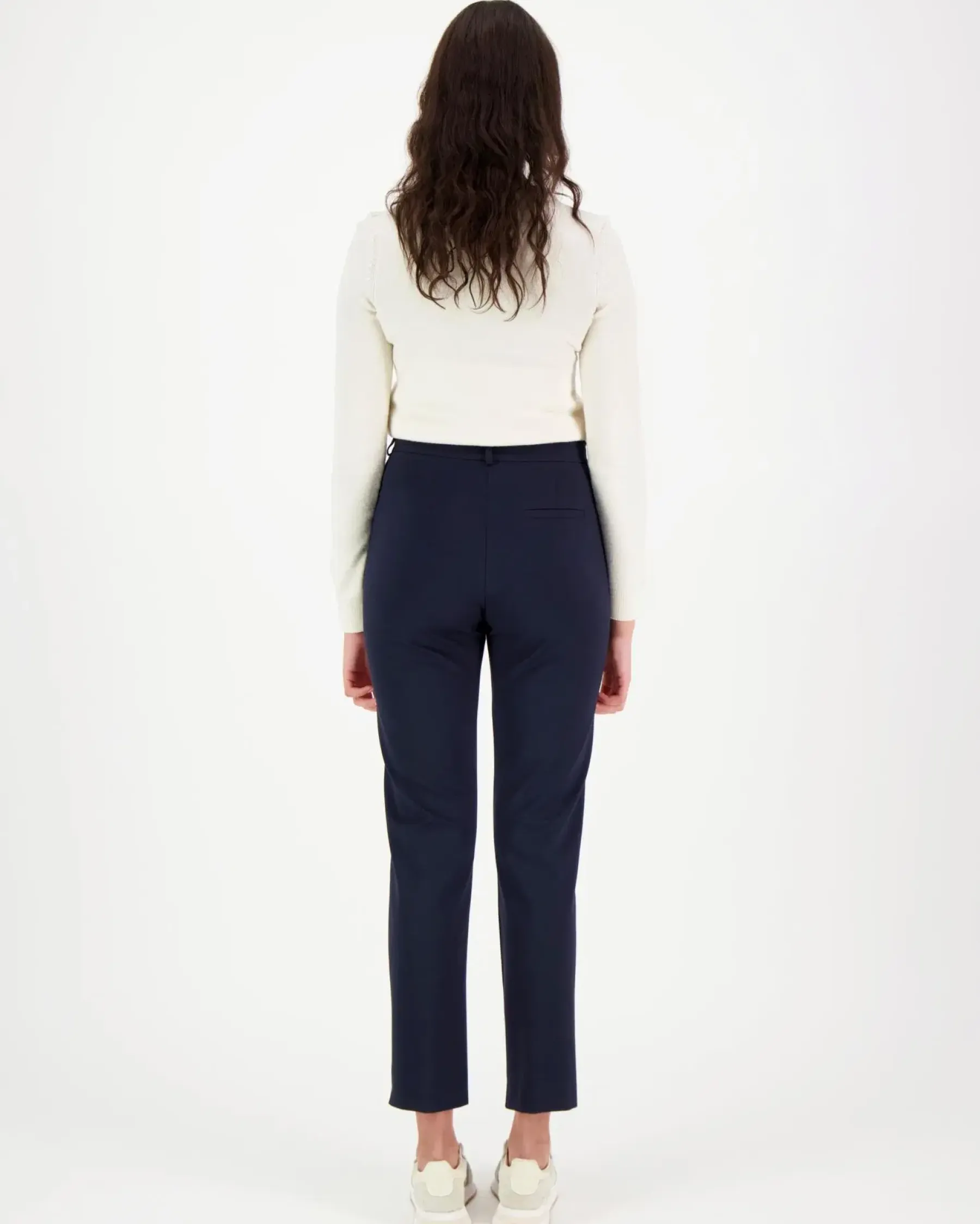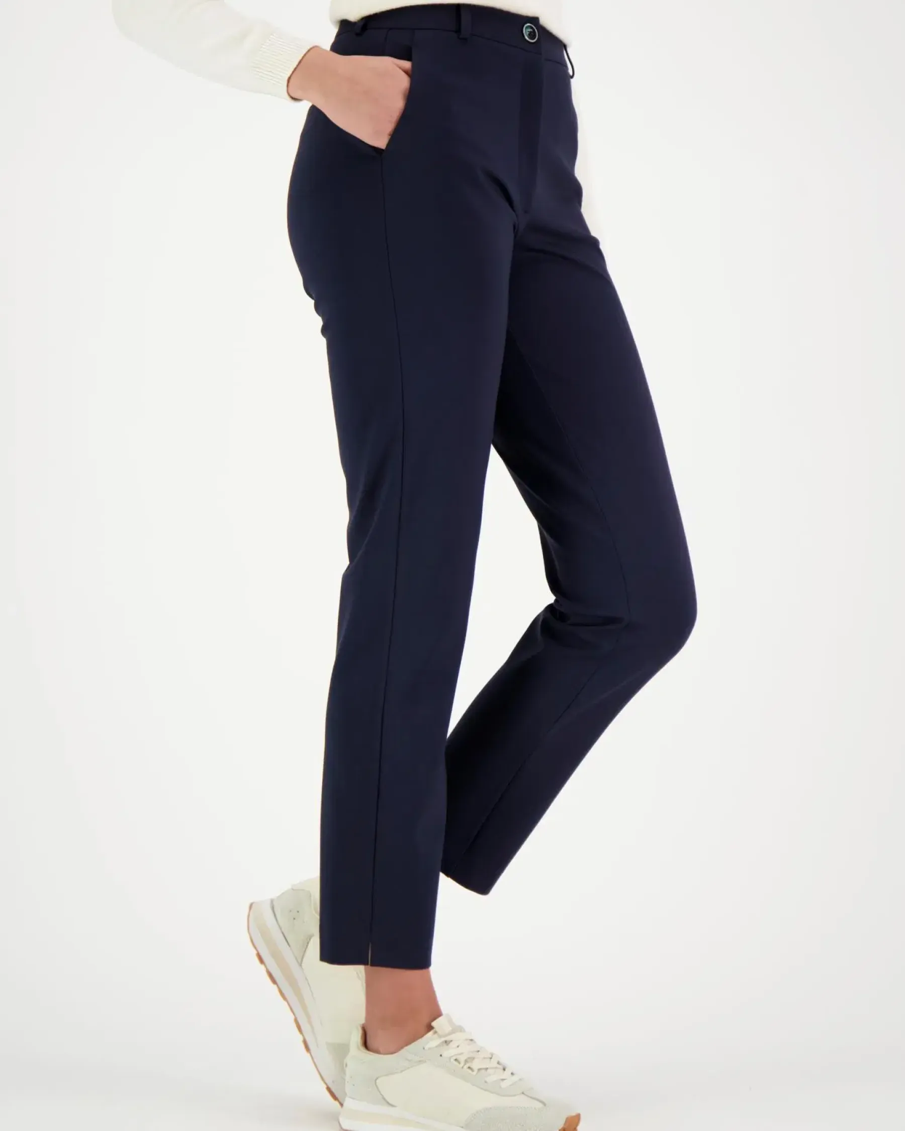 Klassiset suoralahkeiset housut sivutaskuilla Edessä vetoketju ja nappikiinnitys, vyötärönauhassa vyönlenkit. Materiaalina miellyttävää ja laadukasta puntojerseytä, jossa mukana ripaus elasthania. Lahkeen suulla kauniit halkiot.