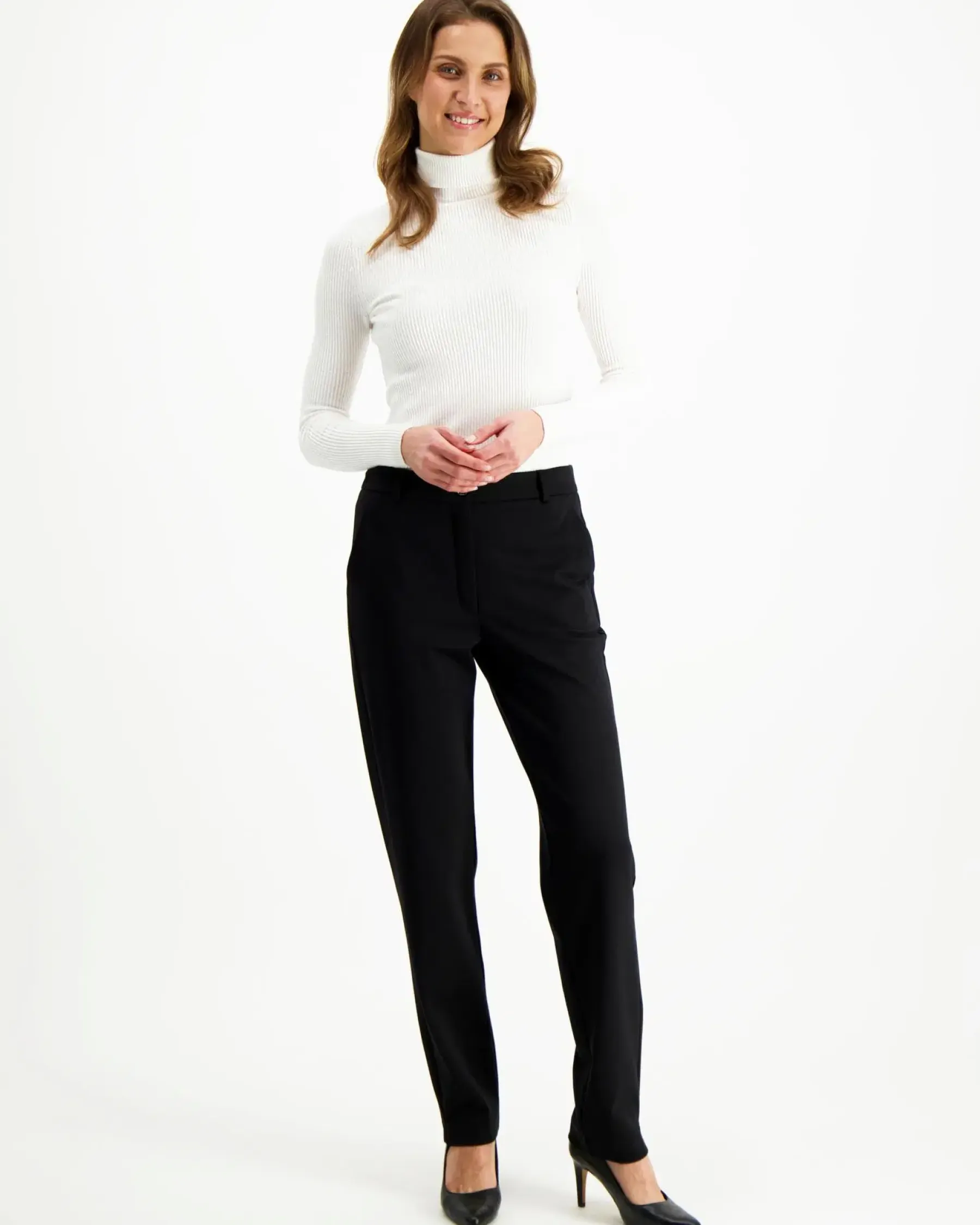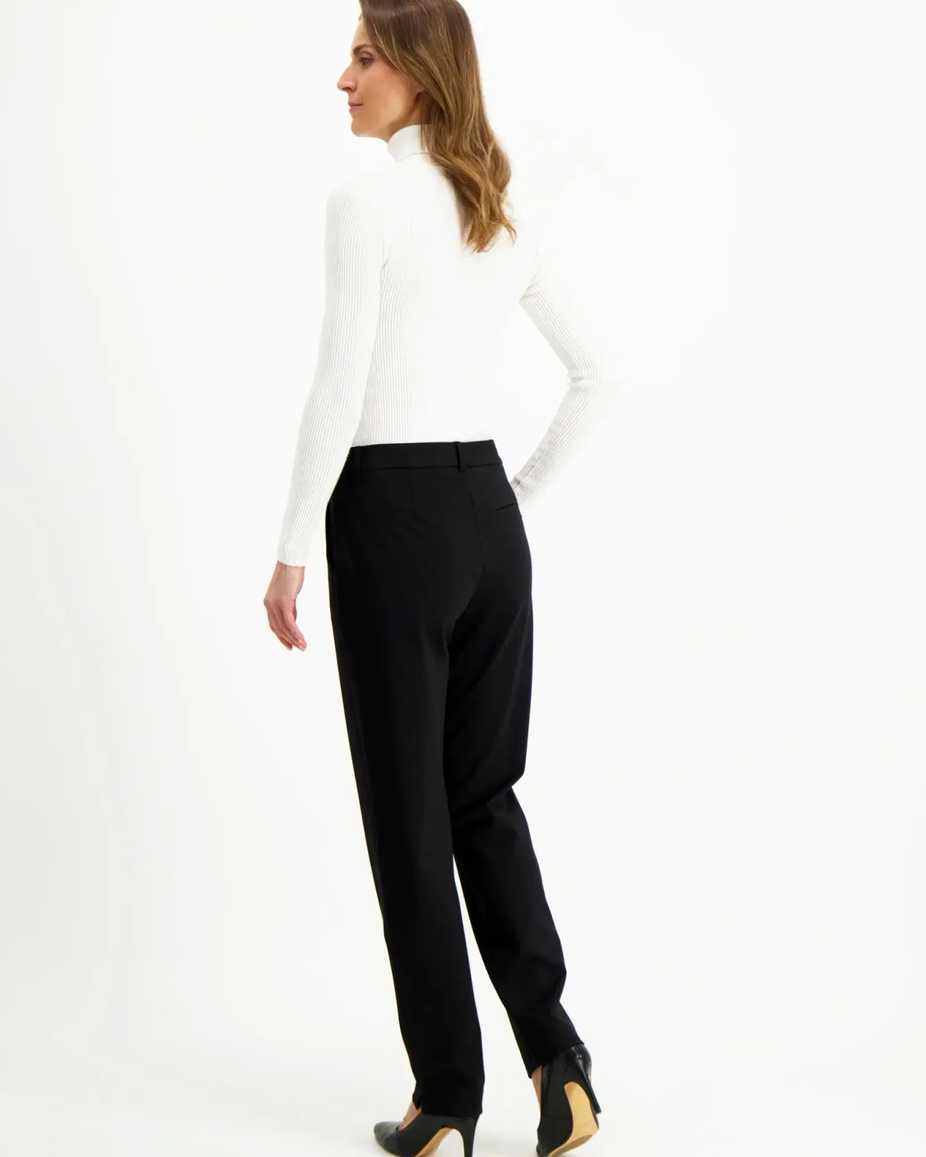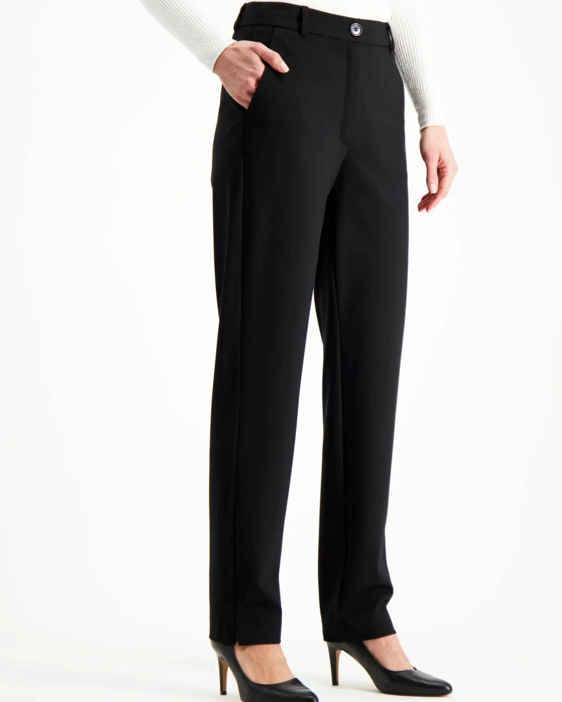 Klassiset suoralahkeiset housut sivutaskuilla. Edessä vetoketju ja nappikiinnitys, vyötärönauhassa vyönlenkit. Materiaali miellyttävää ja laadukasta puntojerseytä, jossa mukana ripaus elastaania. Lahkeen suulla kauniit halkiot. Mallin pituus on 175 cm ja hänellä on yllään koon 38 housut.