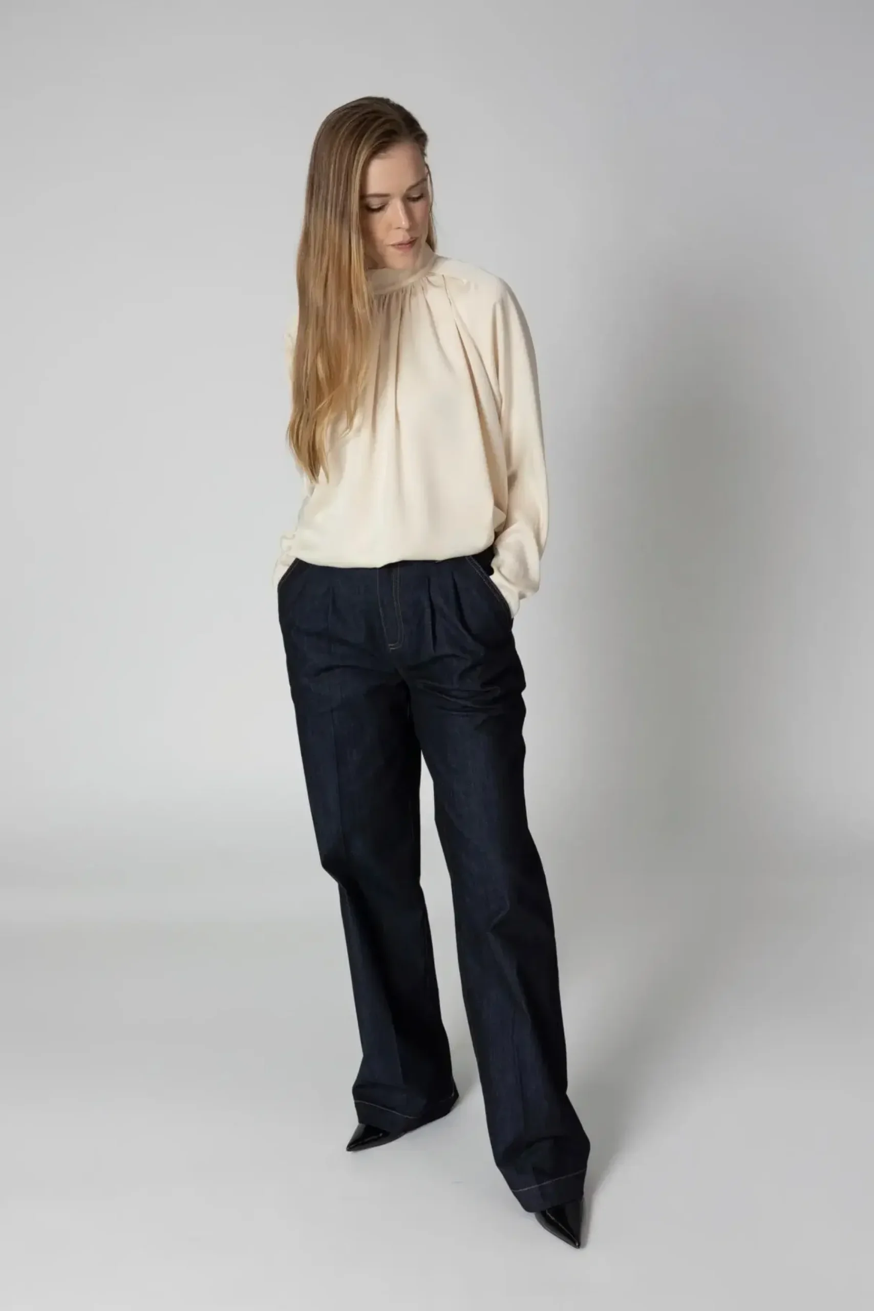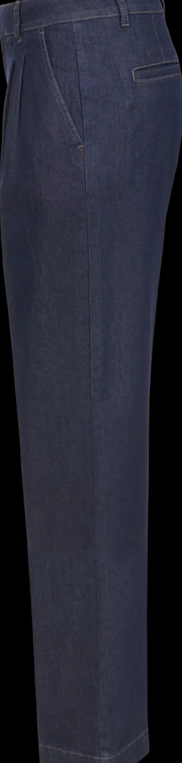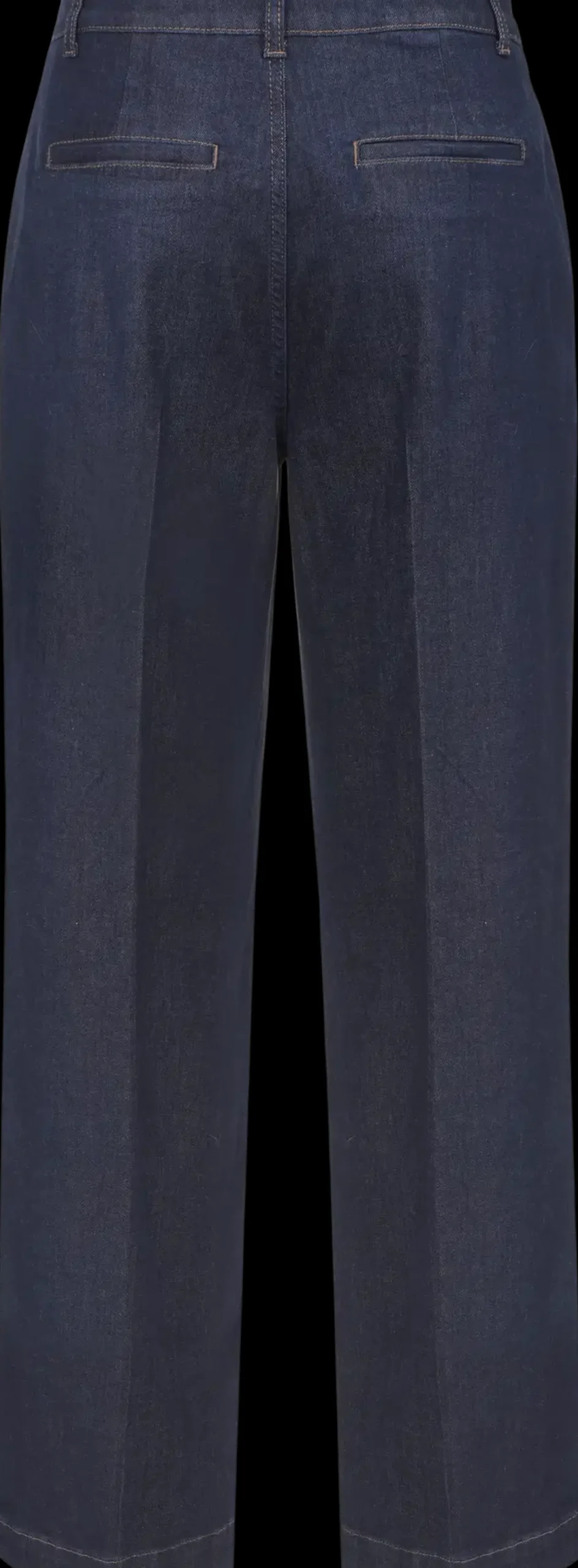 Ril’s housut naisille. Leveä lahje. Täyspituus. Koristelistatasku takana. Viistot etutaskut. Vetoketjusepaluksessa hakaskiinnitys. Korkea vyötärö. Vyölenkit. Prässit. Etulaskokset.