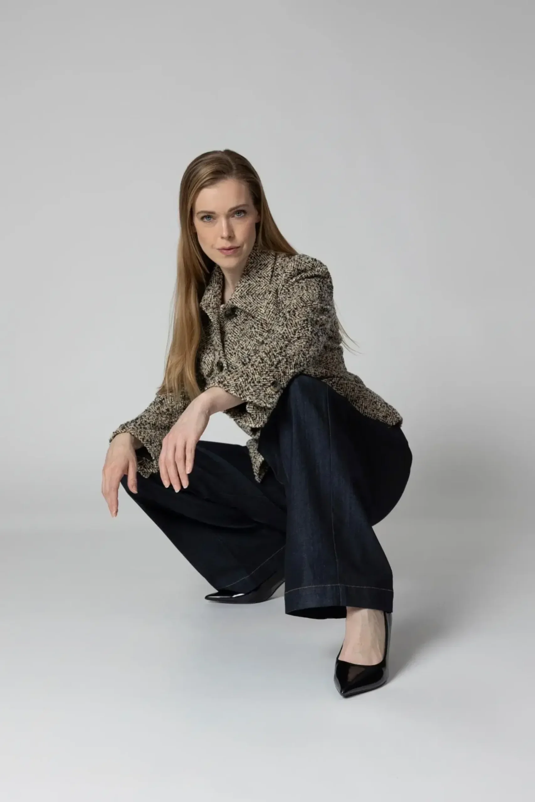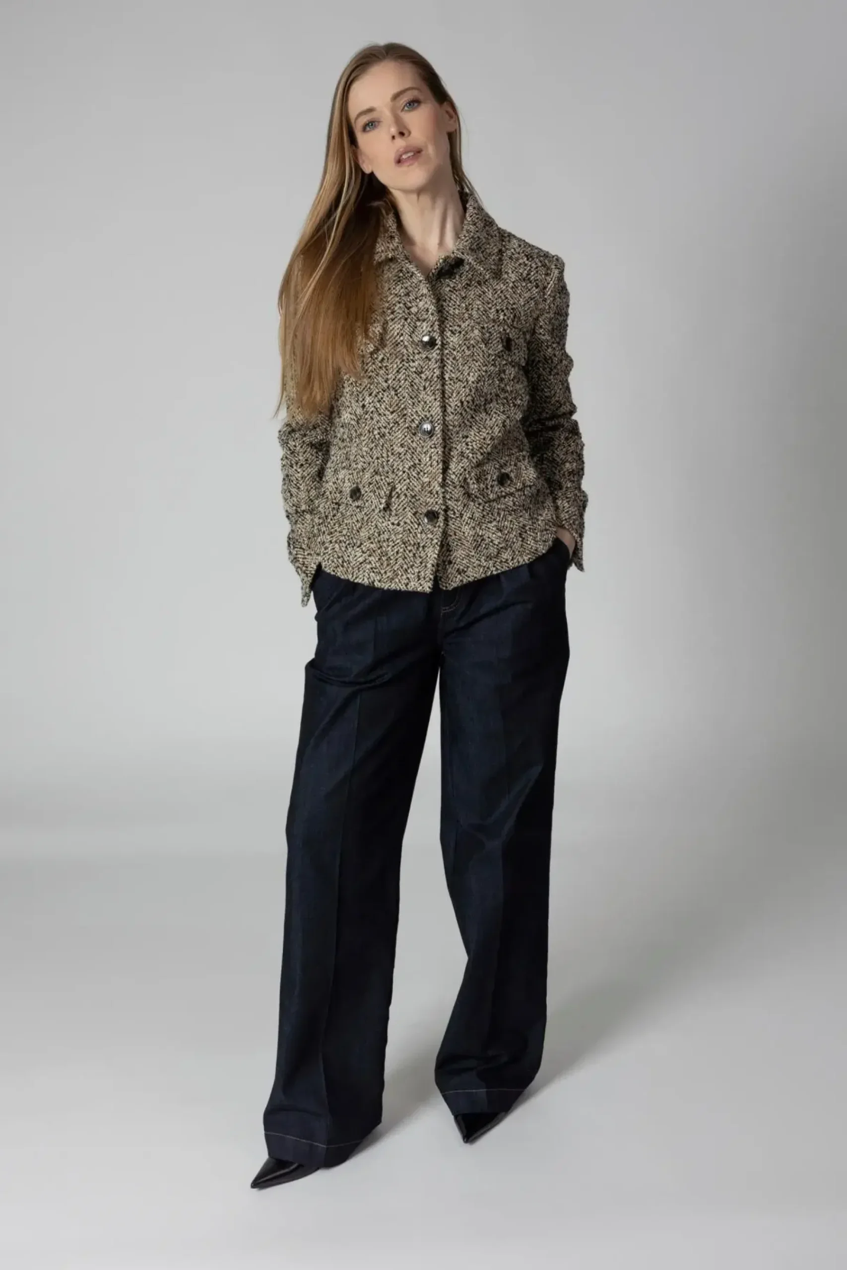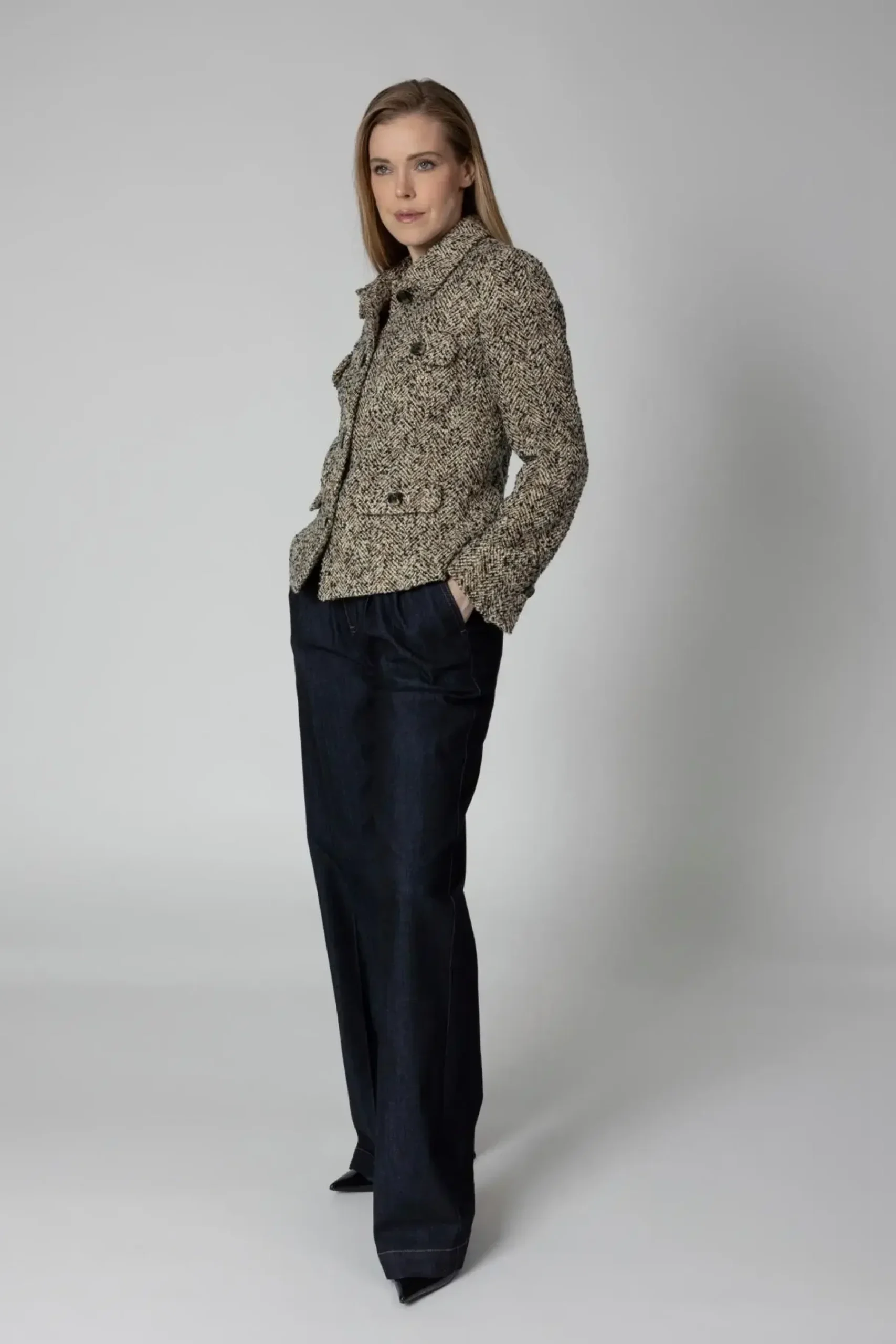 Ril’s housut naisille. Leveä lahje. Täyspituus. Koristelistatasku takana. Viistot etutaskut. Vetoketjusepaluksessa hakaskiinnitys. Korkea vyötärö. Vyölenkit. Prässit. Etulaskokset.