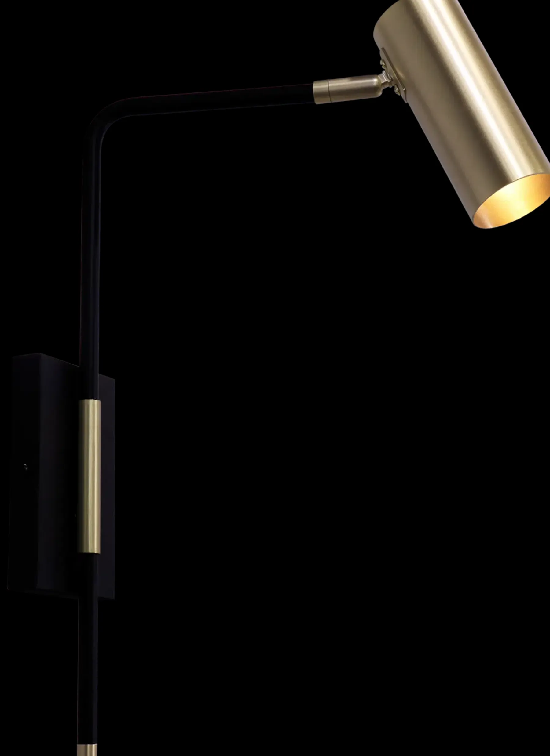 Tyylikäs harjatun mattamessingin ja mustan värinen kapea seinävalaisin, jolle on helppo löytää paikka. Valo lankeaa kapean kuvun sisältä estäen häikäistymisen ja luoden valokeilan.. Varjostin sekä varsi ovat nivelöityjä, joten valon saa suunnattua tehokkaasti. Sopii upeasti esimerkiksi sängynpäädyn tai työpöydän valoksi.