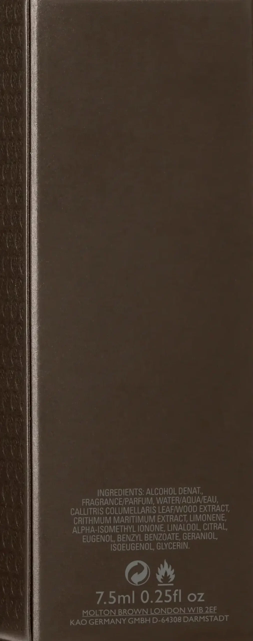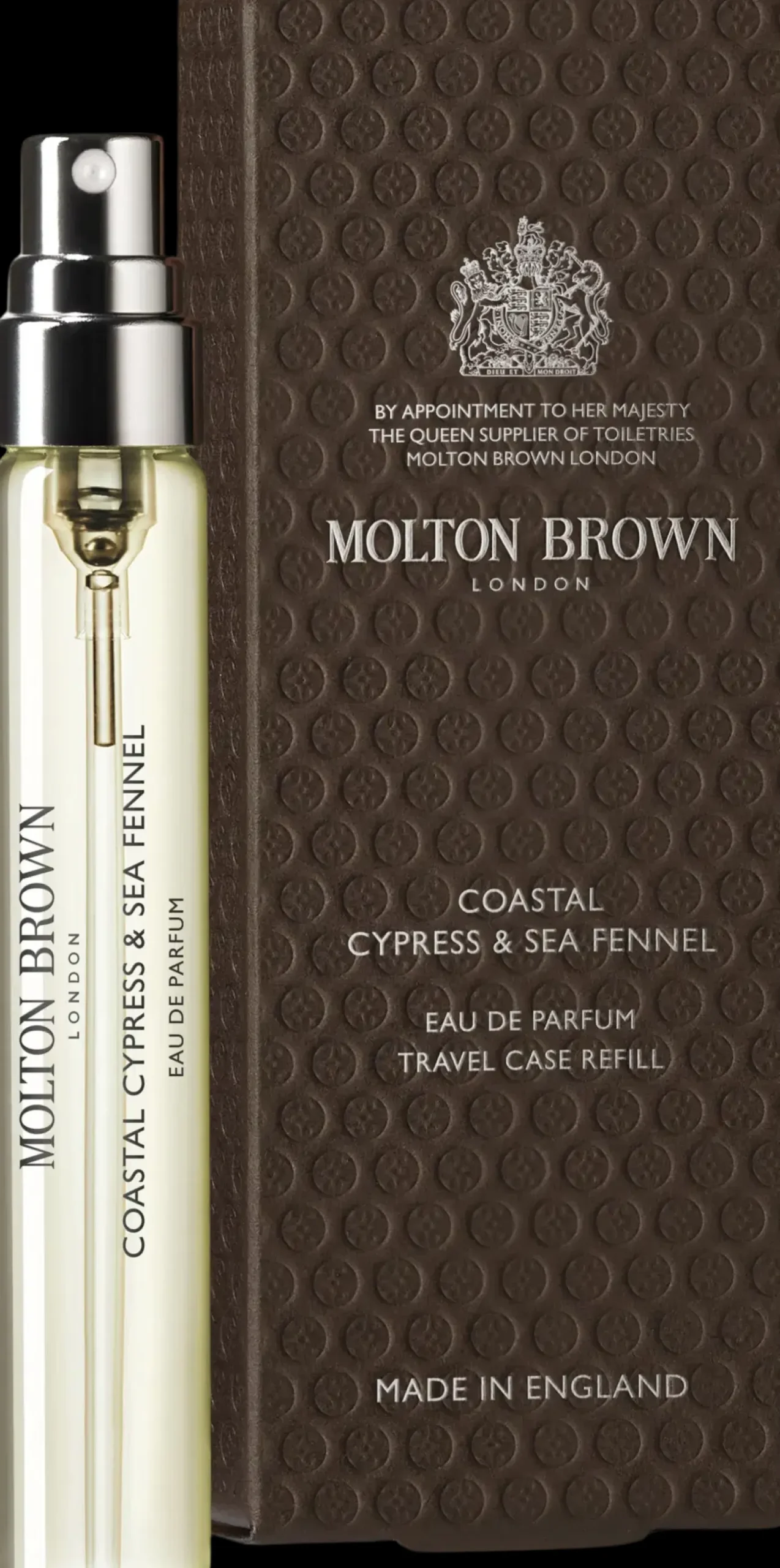 Molton Brown Coastal Cypress & Sea Fennel EdP Travel Case on raikas meren inspiroima Eau de Parfum. Se avautuu viikunanlehden ja inkiväärin aromaattisilla nuoteilla edeten sydäntuoksun merellisiin ja jasmiinin nuotteihin ja tuoden lopuksi esiin syvän ja täyteläisen pohjatuoksun nahkavivahteet.