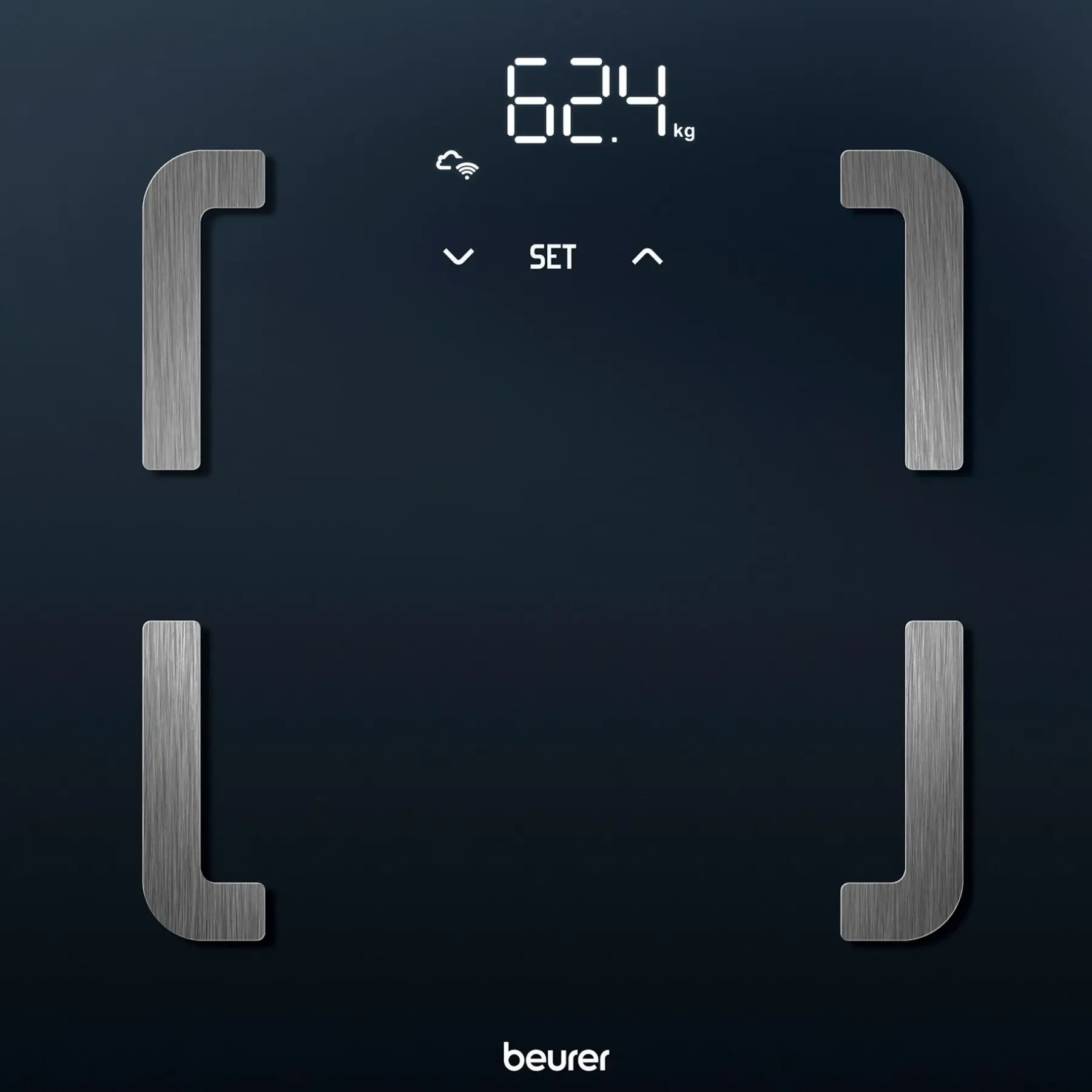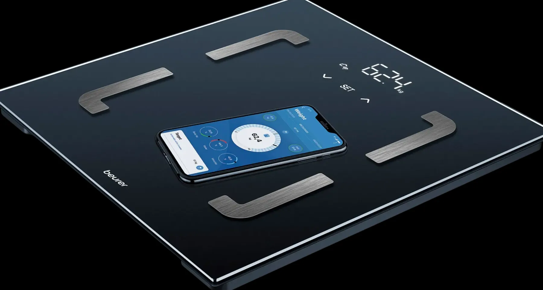 Älykkäät vaa’at mahdollistavat mittaustietojen nopean tiedonsiirron WIFI:n avulla. Ilmaisen “beurer HealthManager Pro” -sovelluksen avulla voit käyttää tietoja milloin ja missä tahansa. Tekniset tiedot: Nopea ja helppo: Bluetooth® käyttöönottoa varten ja WIFI automaattiseen tiedonsiirtoon Automaattinen synkronointi: Jokaisen punnituksen tiedot ladataan automaattisesti WIFI:n kautta Vaakaa voidaan käyttää myös ilman sovellusta painikkeiden ansiosta Titaanipinnoitetut ruostumattomasta teräksestä valmistetut elektrodit Seisomapinta valmistettu turvalasista: 30 x 30 cm Taikanäyttö: näkyy vain mittauksen aikana Numeroiden korkeus: 28 mm Kehon painon, kehon rasvan, lihasprosentin ja BMI:n laskeminen Muut mittaustulokset sovelluksessa (metabolinen ikä, kehon vesi, BMR/AMR-kalorit, luun mineraalipitoisuus) 5 aktiivisuustasoa 8 käyttäjämuistia automaattisella käyttäjän tunnistuksella kg/lb/st Painokapasiteetti: 180 kg Tarkkuus 0,1 % kehon rasvapitoisuudelle ja lihasprosentille / 100 g painolle Ylikuorman ilmaisin Automaattinen sammutus ja käynnistys